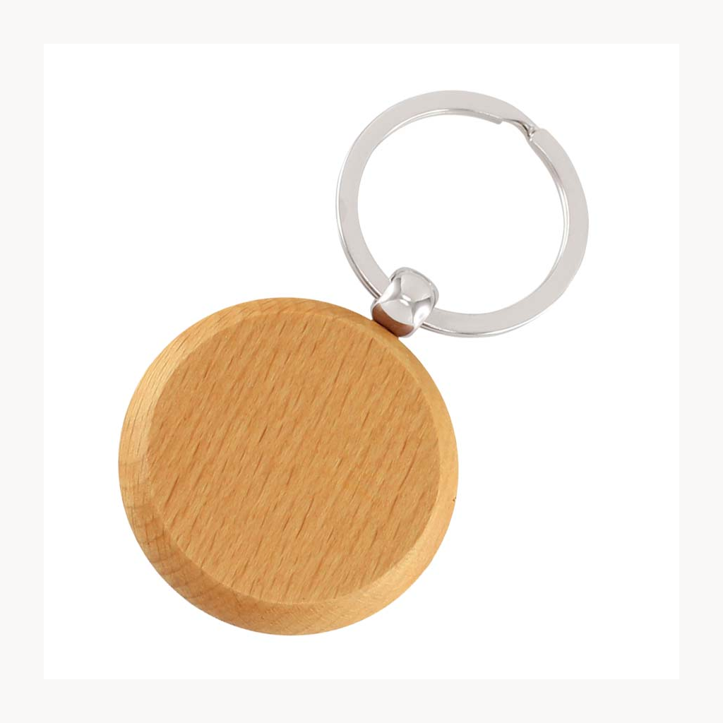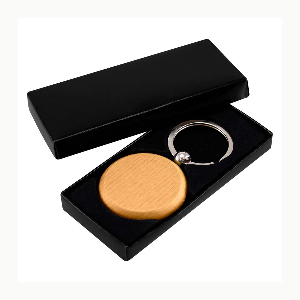 Llavero Redondo de Madera de Bamboo. Presentación en estuche laminado negro con cuna aterciopelada.