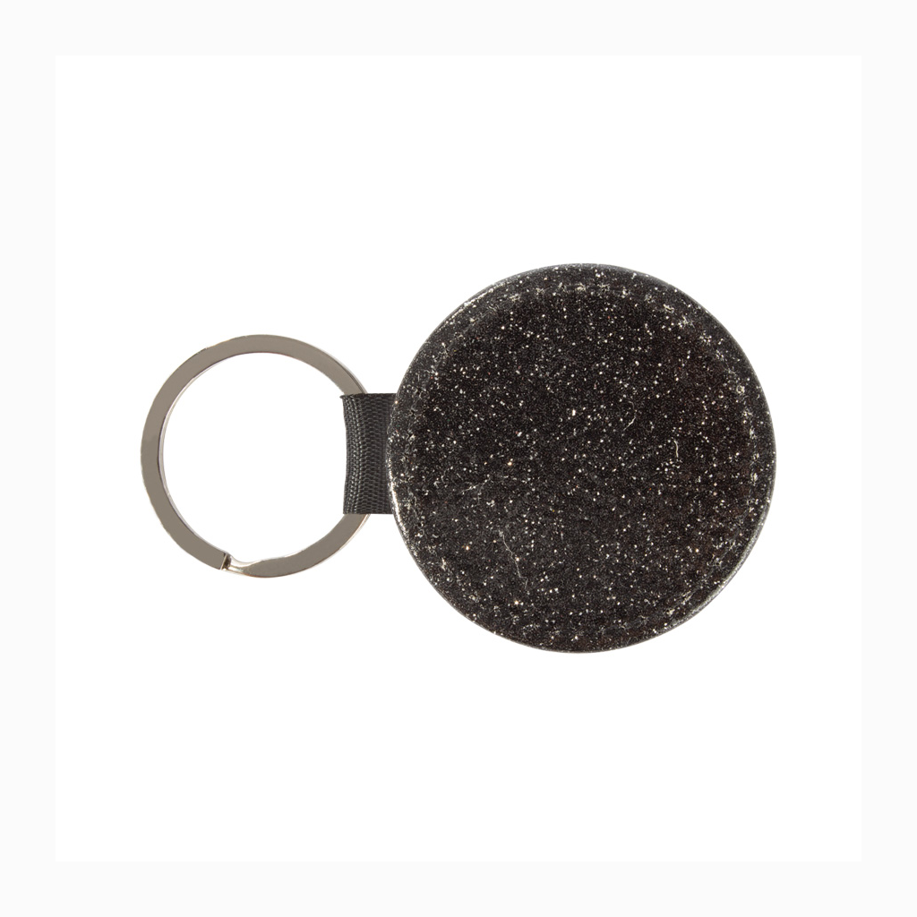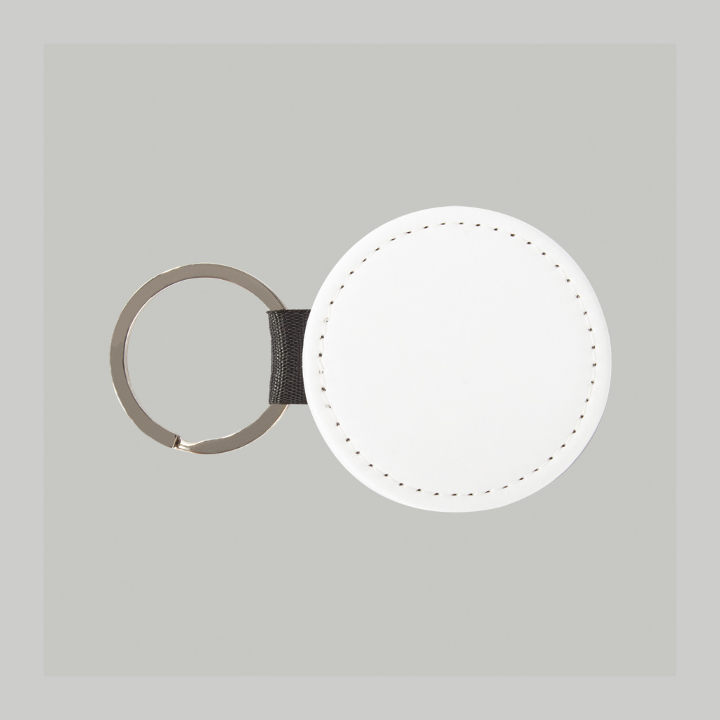 Llavero redondo de PU blanco para sublimación. Reverso capa PU negro con brillo (no sublimable). Argolla de Acero inoxidable.
