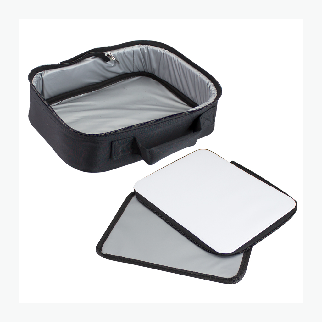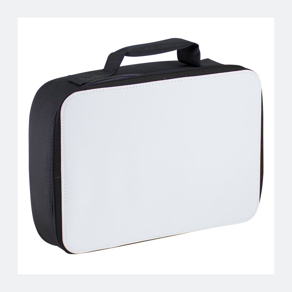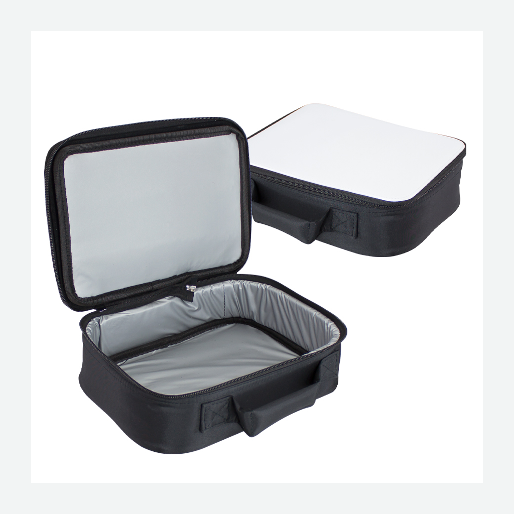Lonchera de Microfibra, con interior cooler con aislante térmico plateado. Incluye mango y tapa dura en tela blanca para Sublimación a todo color. Cierre eclair.