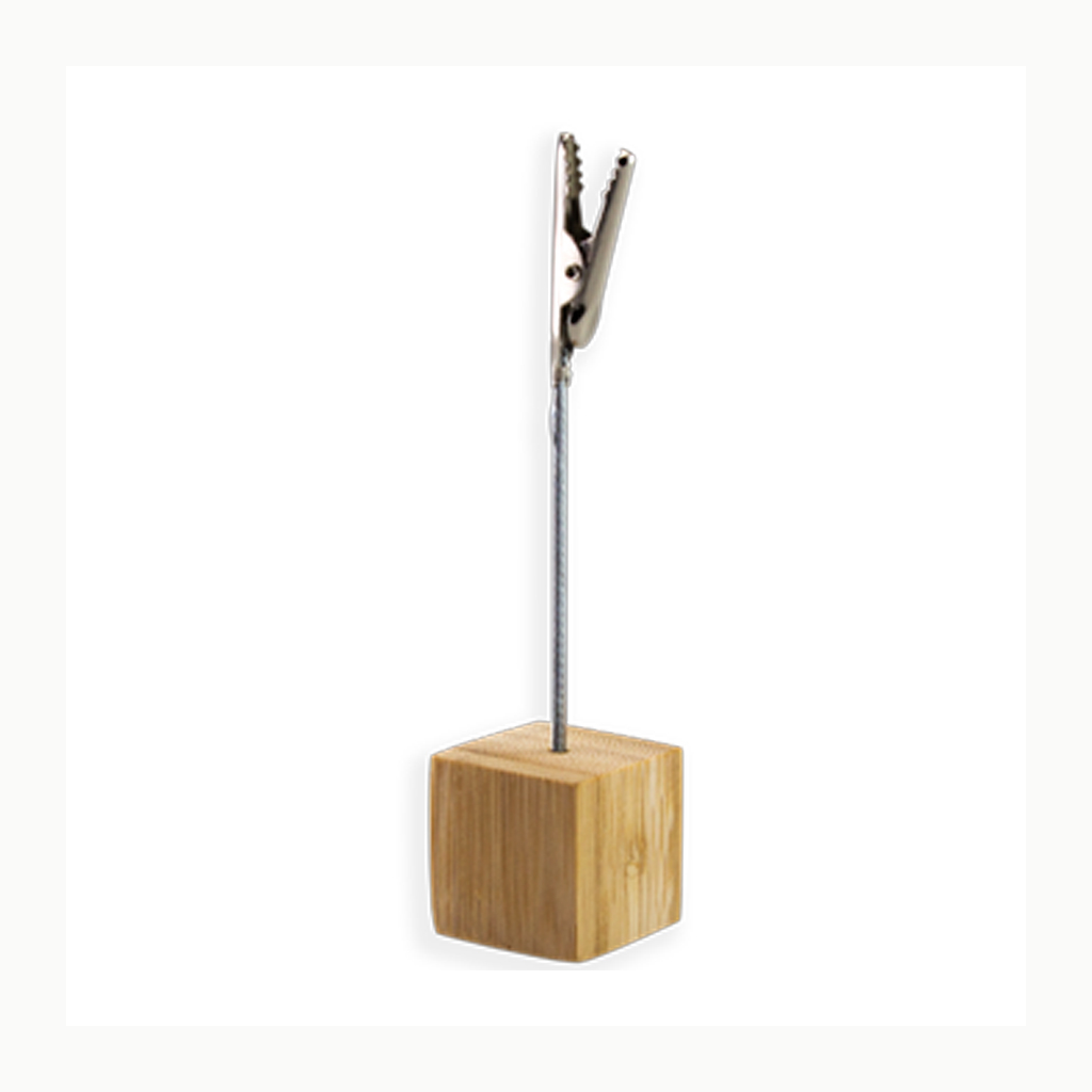 Memo Clip Porta-Tarjetas Metálico con Base Cubo de Madera de Bamboo.