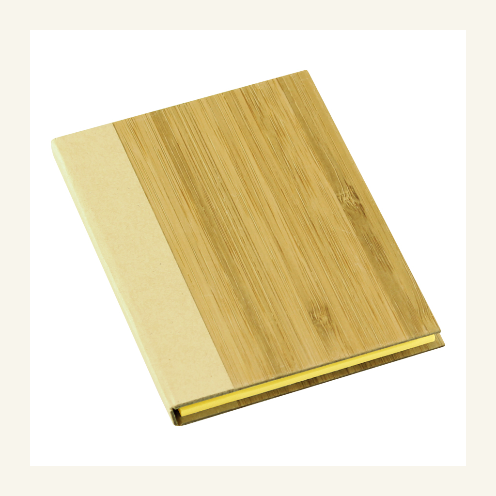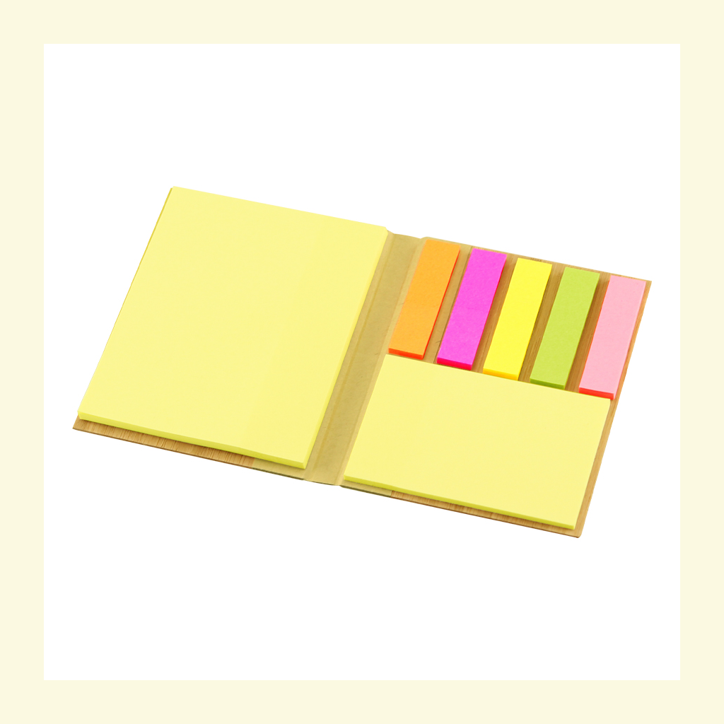 Memo Set con Tapas Duras enchapadas en madera de Bamboo. Incluye 50 notas adhesivas amarillas grandes, 25 notas adhesivas amarillas medianas y 125 banderitas adhesivas de colores.