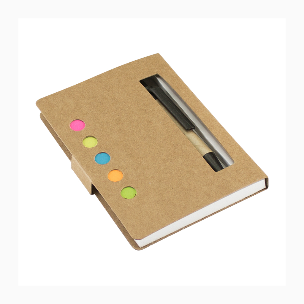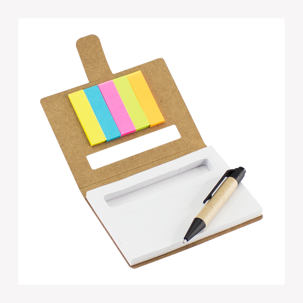 Memo set Ecológico. Incluye 1 bolígrafo ecológico corto + 125 banderitas adhesivas de colores + Block de Notas con 80 hojas blancas pre-picadas.