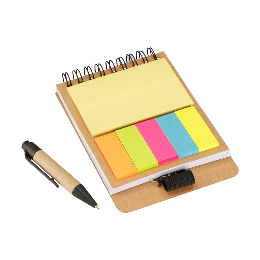 Memo Set Ecológico. Incluye 1 Bolígrafo Ecológico corto + 125 banderitas adhesivas de colores + 25 notas adhesivas rectangulares + Block de Notas con 60 hojas blancas lineadas. Terminación Espiral Doble Cero Metálico.