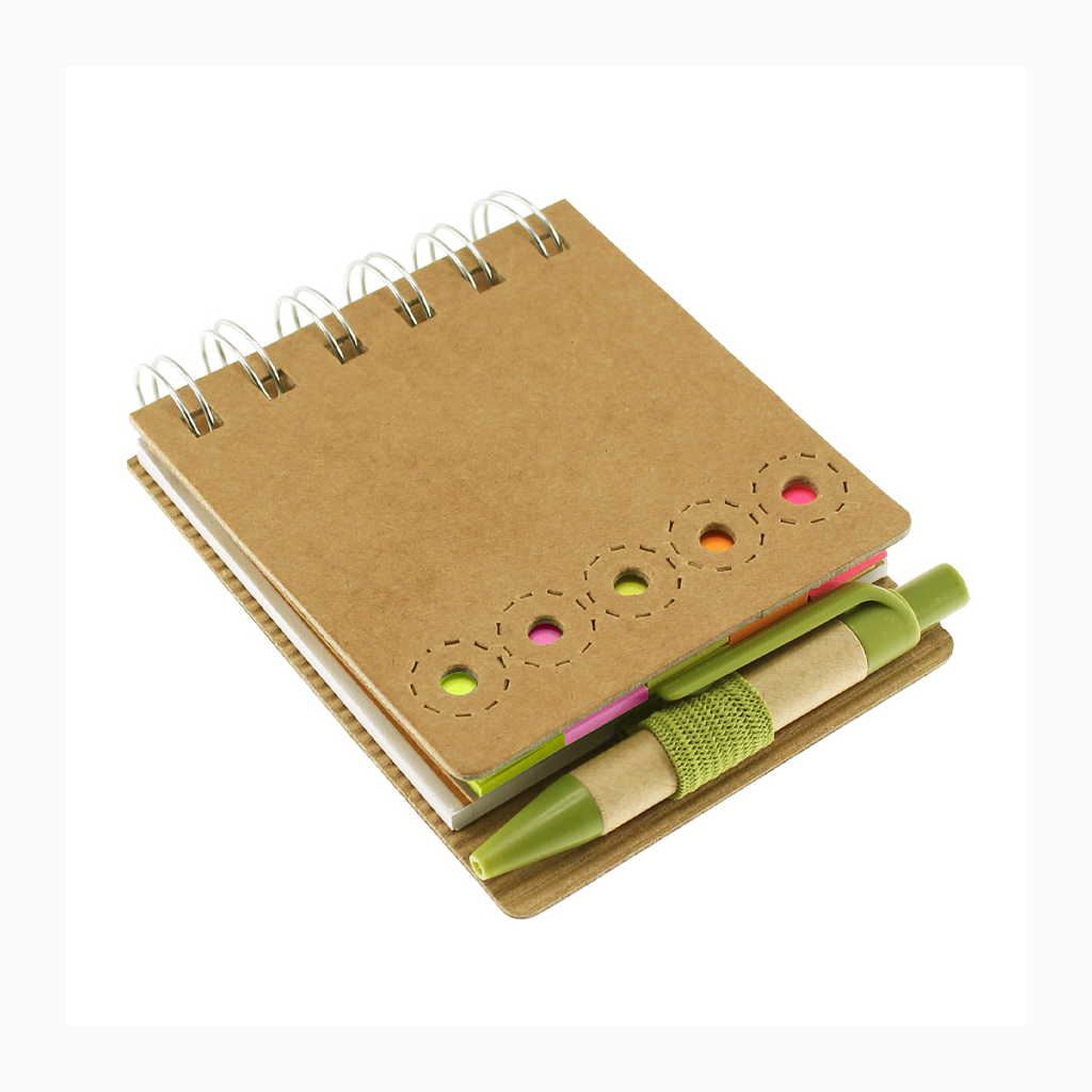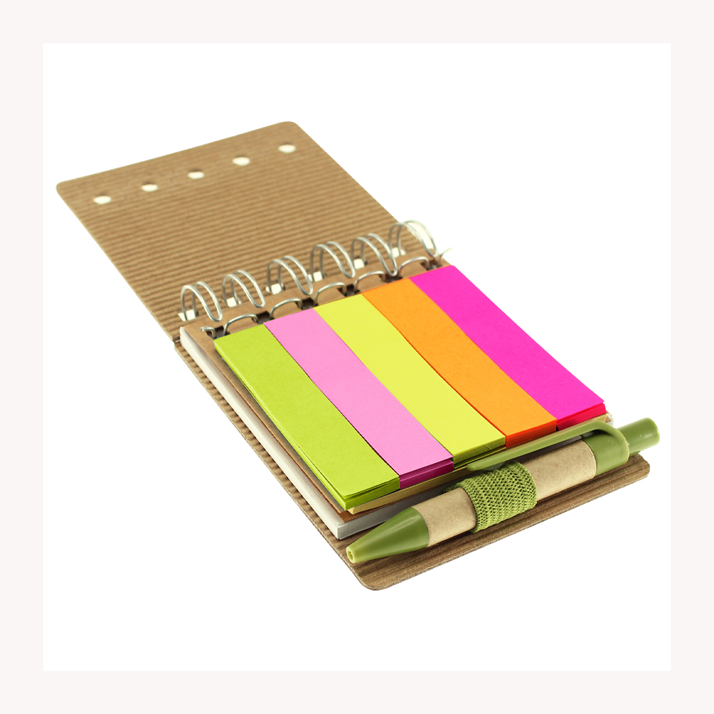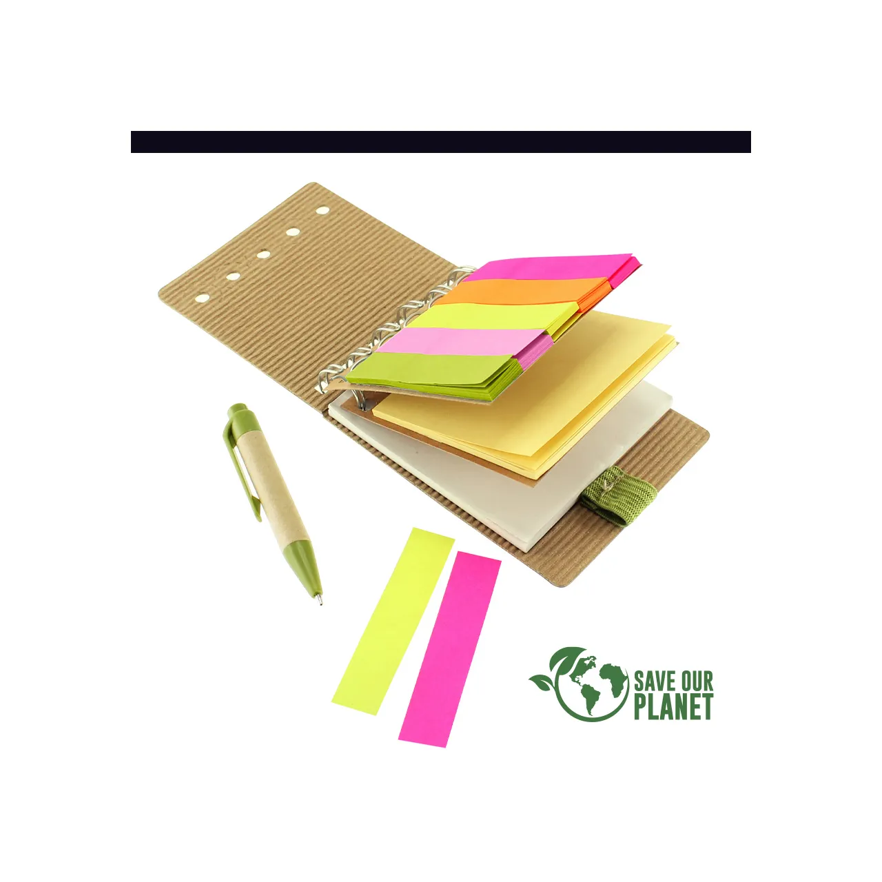 Memo Set Ecológico. Incluye Bolígrafo Ecológico corto + 125 banderitas adhesivas de colores + 25 notas adhesivas cuadradas + Block de Notas 40 hojas blancas. Tapas gruesas cartón ecológico 600gsm, exterior liso/interior plisado, en Espiral Doble Cero Metálico.