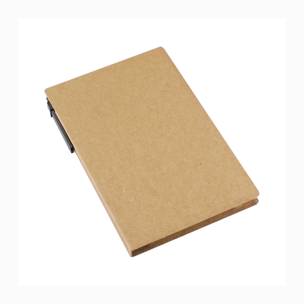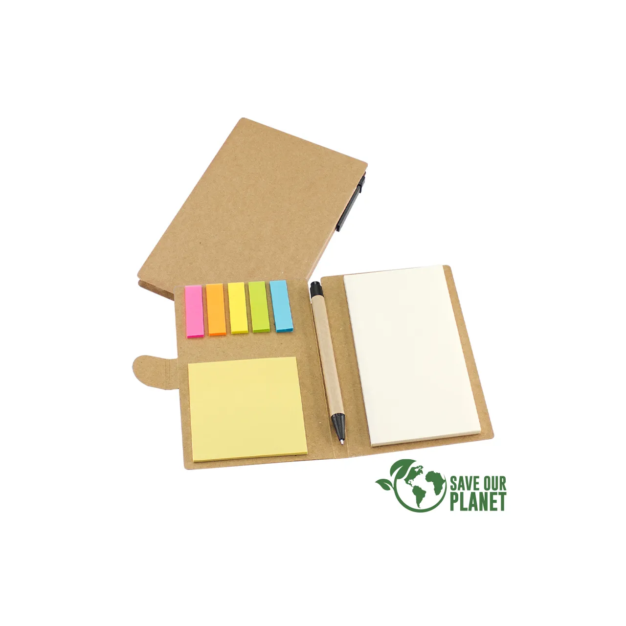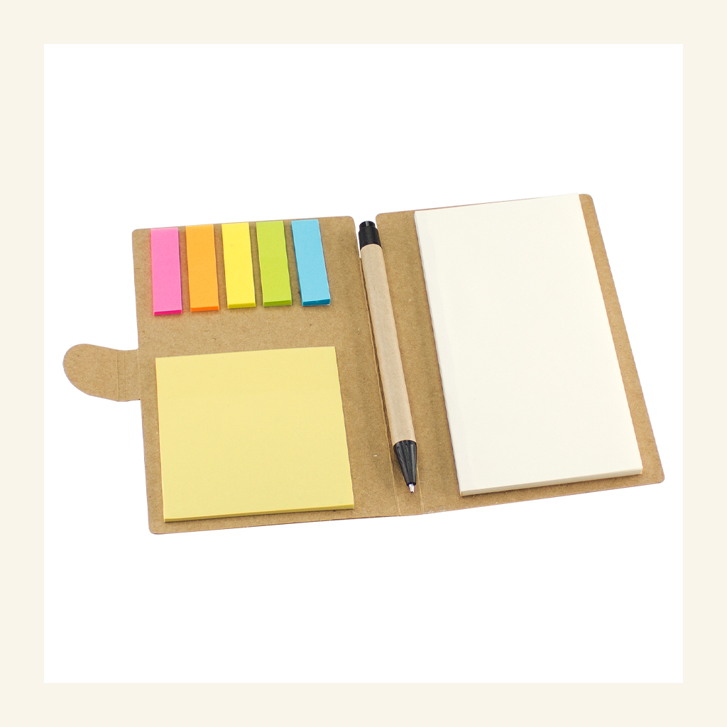 Memo set Ecológico Grande de Cartón natural. Incluye Bolígrafo Ecológico, 50 notas adhesivas amarillas claras grandes de 14.4 x 7.5 cm, 25 notas adhesivas amarillas medianas de 7.7 x 7.7 cm y 125 banderitas adhesivas de colores de 4.5 x 1.3 cm.