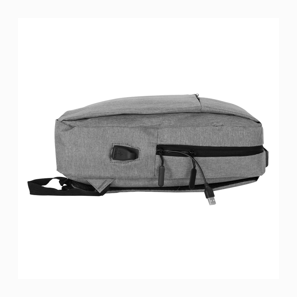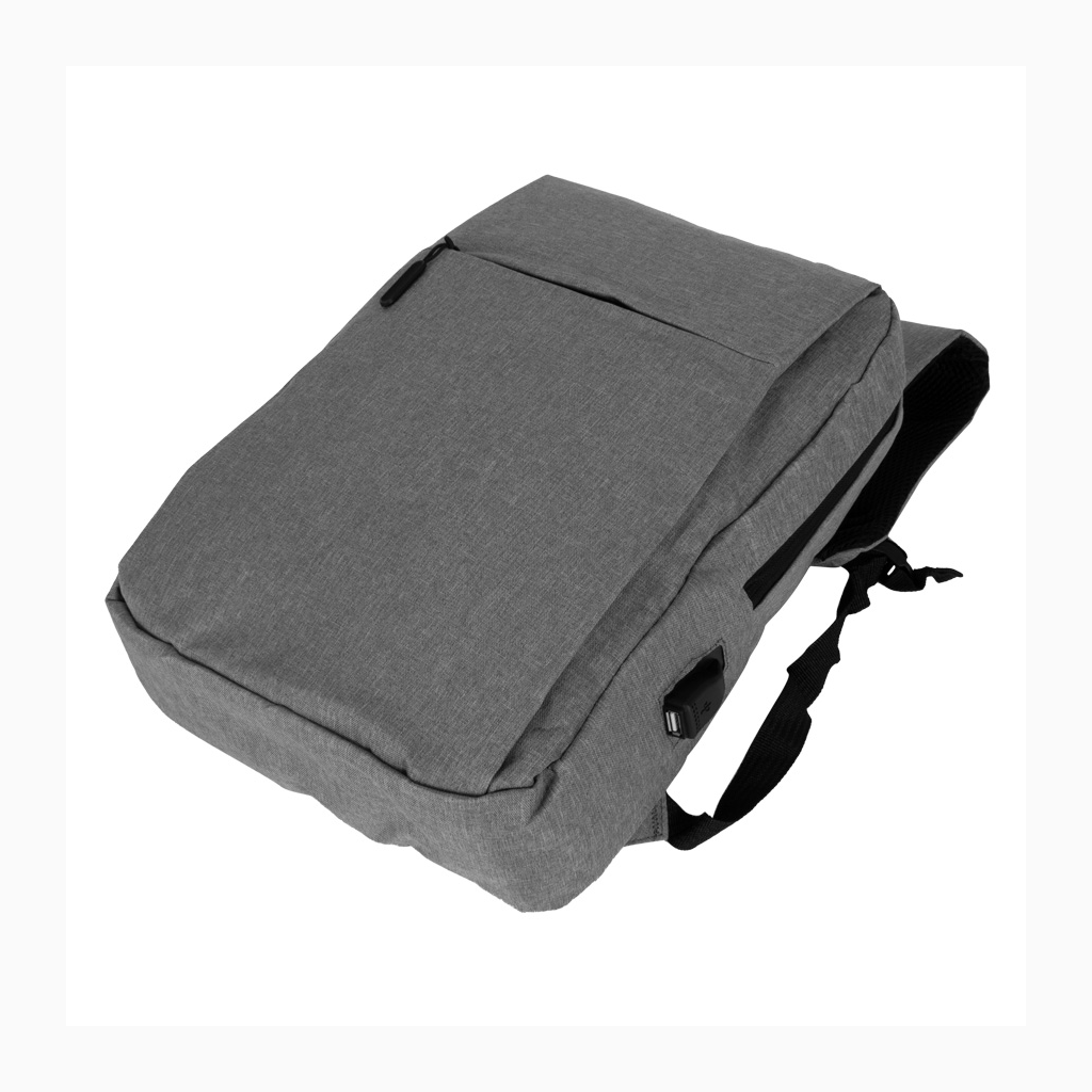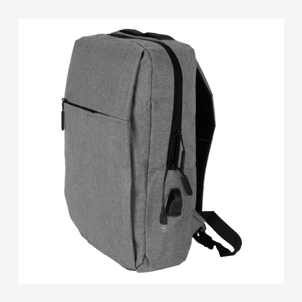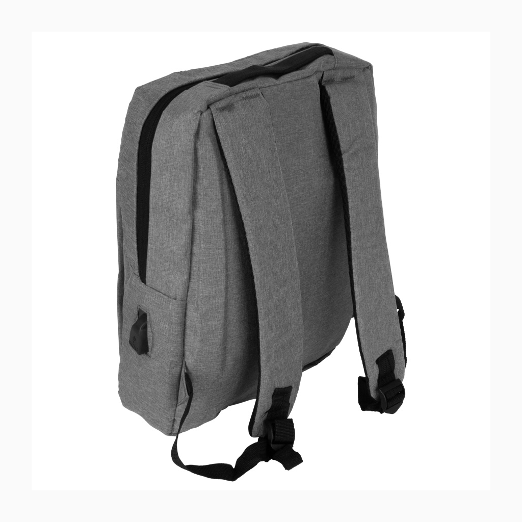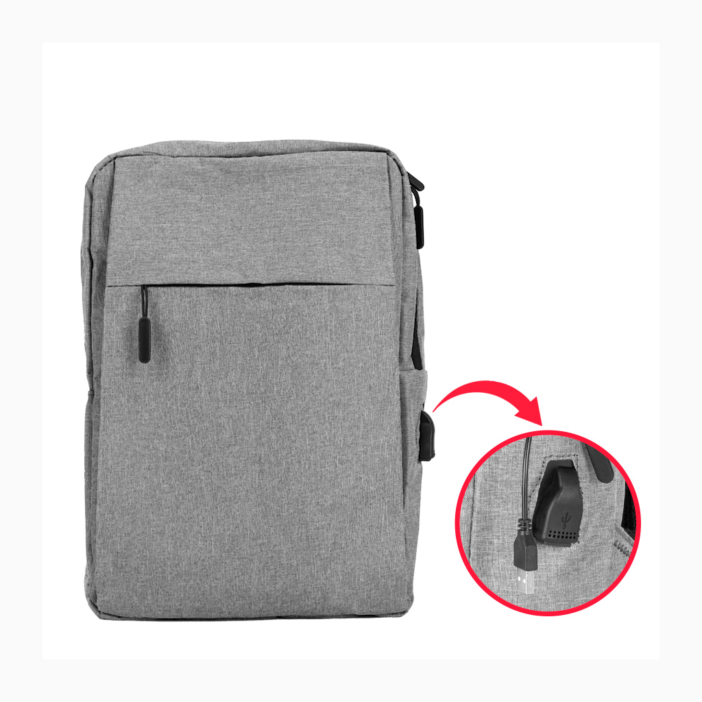 Mochila Porta-Notebook modelo «HOPE». En tela poliéster 300D/PVC denim. Capacidad 12 litros, tamaño 28 x 38.5 x 11 cm. Incluye compartimento principal con cremallera, reforzado y acolchado para Laptop, con cable interior y salida USB para carga exterior + segundo compartimento delantero reforzado y acolchado para i-pad o tablet, con cierre-eclair lateral + bolsillo delantero con cremallera. Espalda con correas acolchadas ajustables.