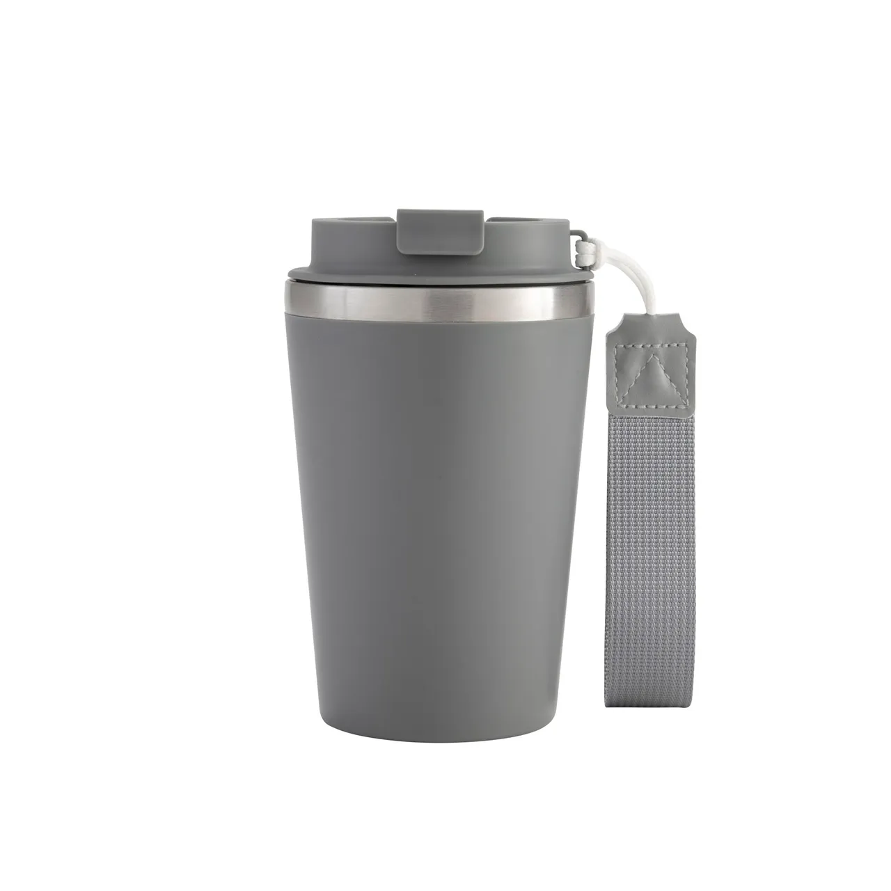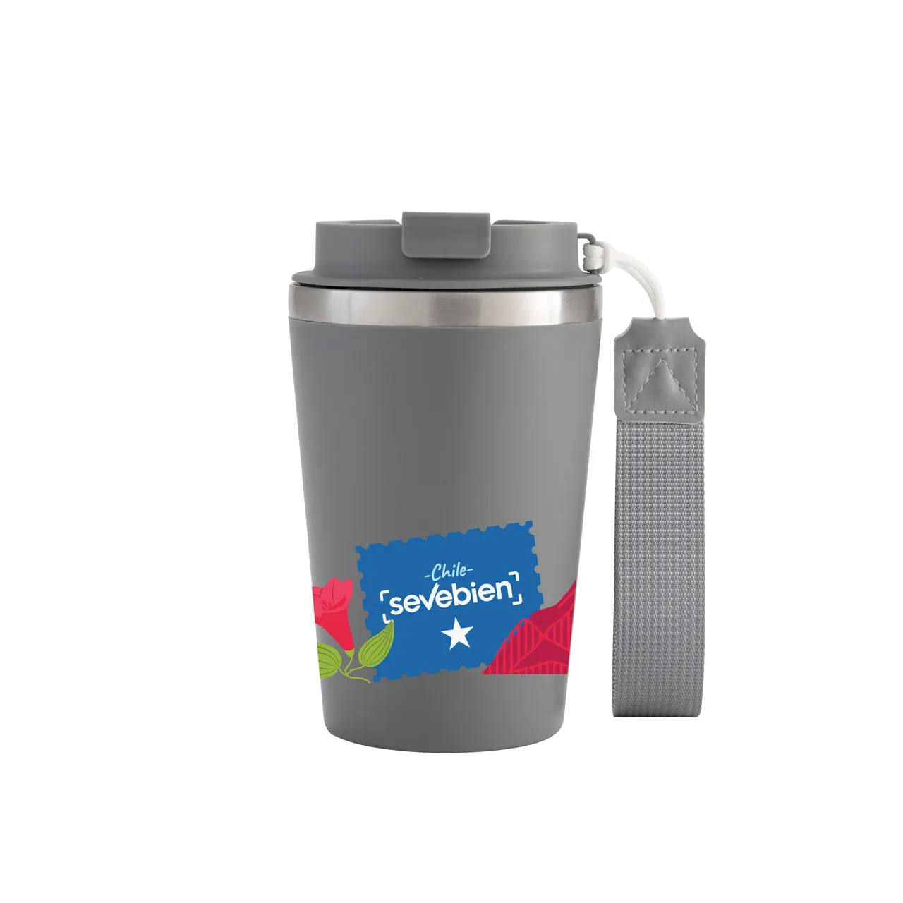Perfecto para llevar en el día a día.Mug doble pared con asa colgante. Interior de acero inoxidable 304 y exterior de Polipropileno con acabado mate. Tapa a rosca de polipropileno con anillo de silicona y seguro antiderrame del mismo color del mug. Asa de poliuretano y poliéster.Medidas: Ø 8,9 cm x 15 cm.