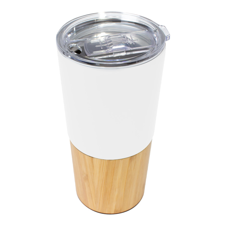 Mug de metálico doble pared aislante, interior Acero inoxidable 201 SS, exterior cubierta inferior de bamboo y cubierta superior de Acero inoxidable 304 SS, modelo «AURUS». Producto BPA FREE, para el contacto con líquidos y alimentos. Fondo de silicona negra ABS anti-deslizante. Tapa removible de plástico PS Crystal Clear con sello cilíndrico de silicona y sistema de cierre/apertura antiderrame. Capacidad 500ml. Presentación en bolsa OPP + caja de regalo de cartón kraft.