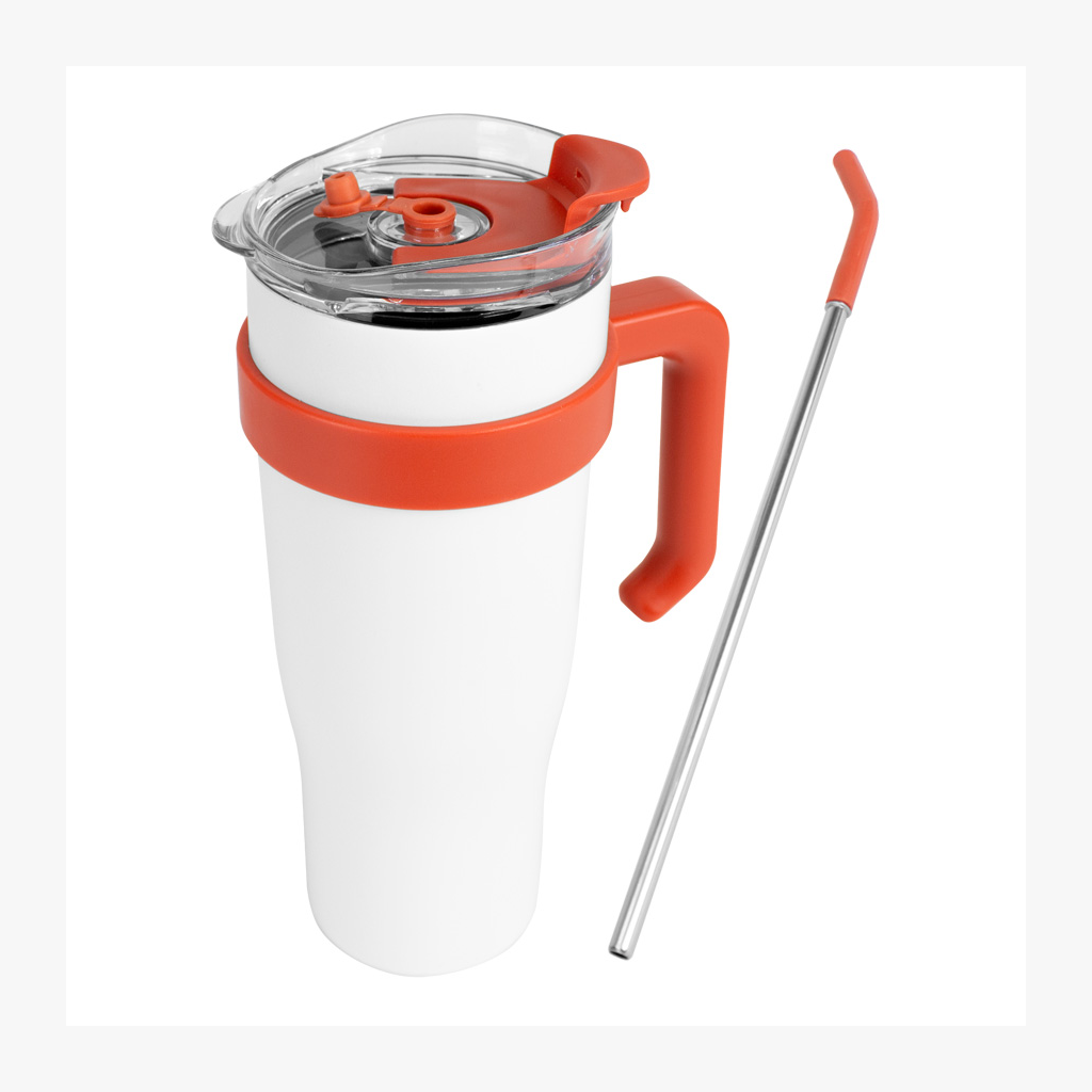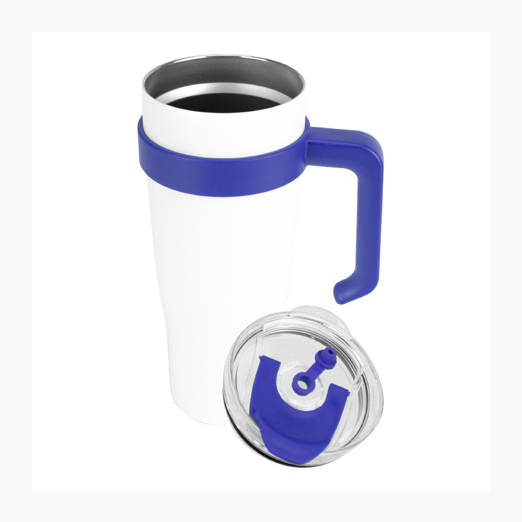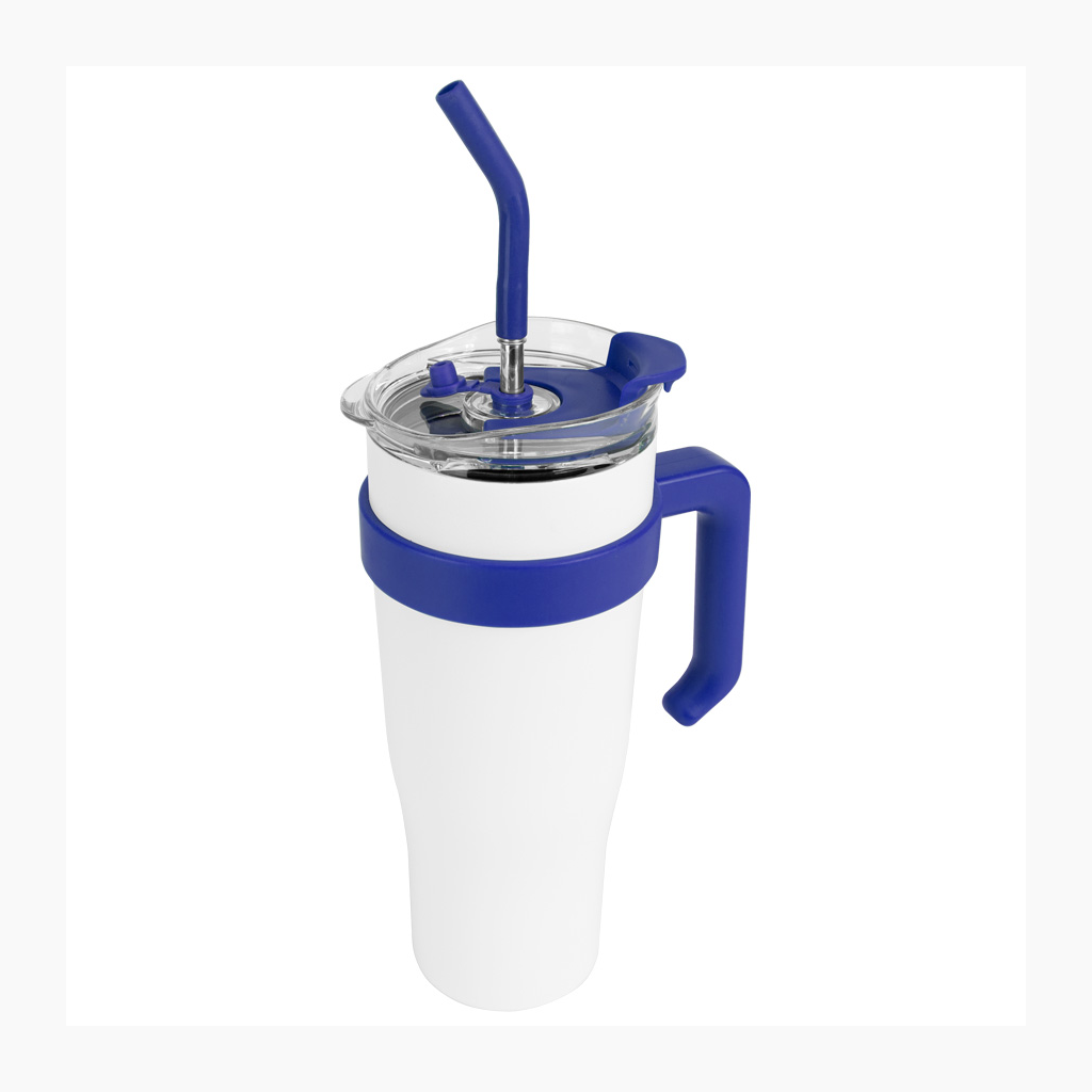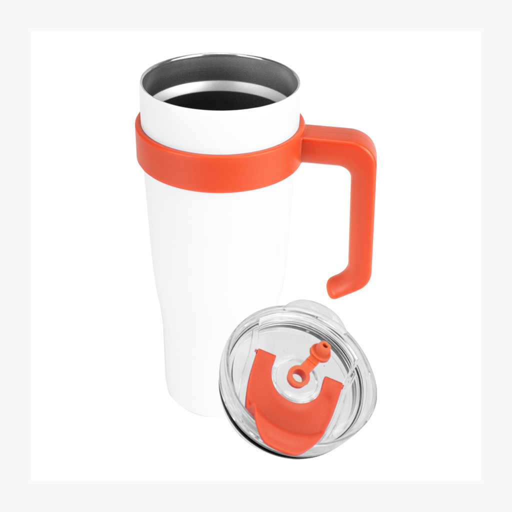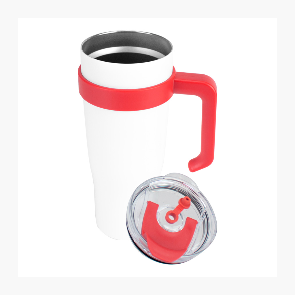 Mug térmico metálico doble pared aislante, interior Acero inoxidable 304 SS, exterior Acero inoxidable 201 SS, modelo «GIANT», con mango de polipropileno (PP) de color al tono. Incluye bombilla de Acero inoxidable con boquilla de silicona de color al tono (viene en el interior del mug). Producto BPA FREE, para el contacto con líquidos y alimentos. Tapa removible de plástico PET Crystal Clear con sello cilíndrico de silicona y sistema de cierre/apertura antiderrame. Capacidad 1200cc. Presentación en bolsa burbuja + caja de regalo de cartón laminado negro.