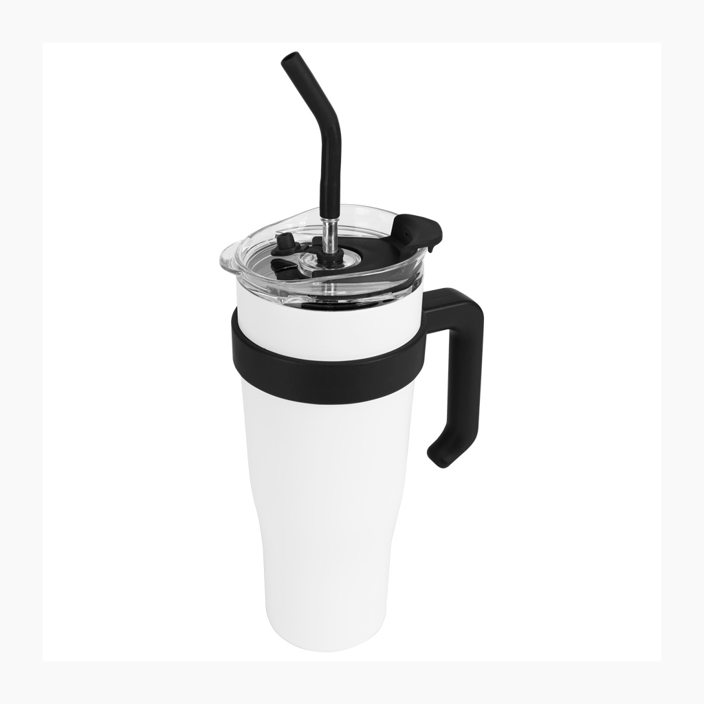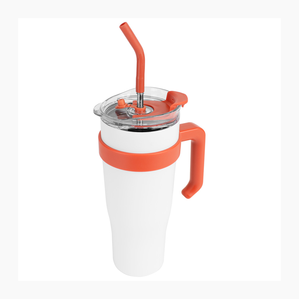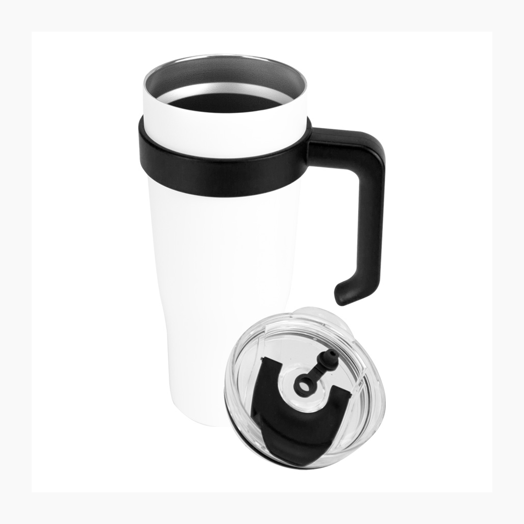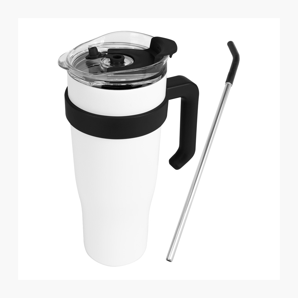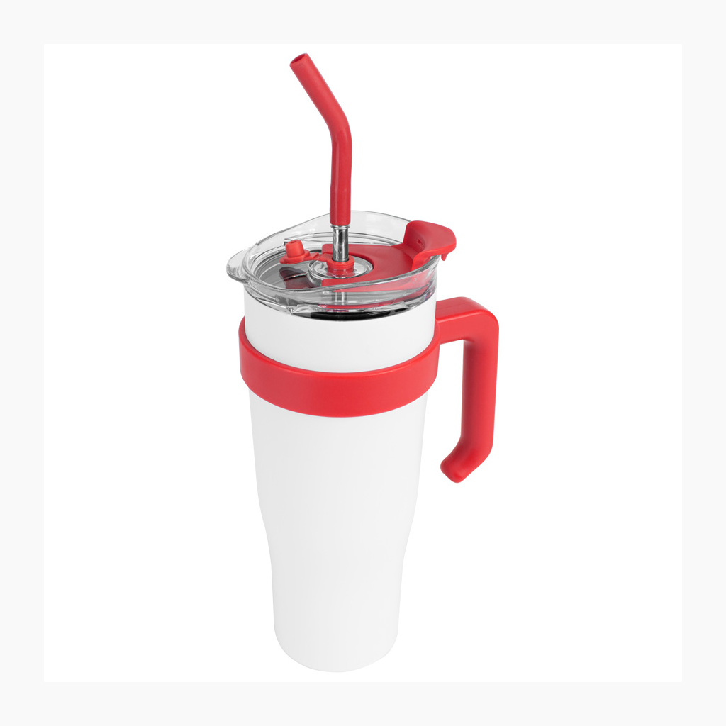 Mug térmico metálico doble pared aislante, interior Acero inoxidable 304 SS, exterior Acero inoxidable 201 SS, modelo «GIANT», con mango de polipropileno (PP) de color al tono. Incluye bombilla de Acero inoxidable con boquilla de silicona de color al tono (viene en el interior del mug). Producto BPA FREE, para el contacto con líquidos y alimentos. Tapa removible de plástico PET Crystal Clear con sello cilíndrico de silicona y sistema de cierre/apertura antiderrame. Capacidad 1200cc. Presentación en bolsa burbuja + caja de regalo de cartón laminado negro.