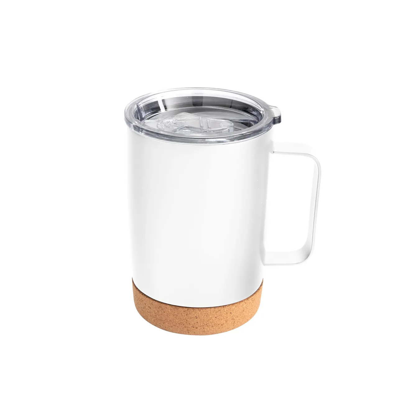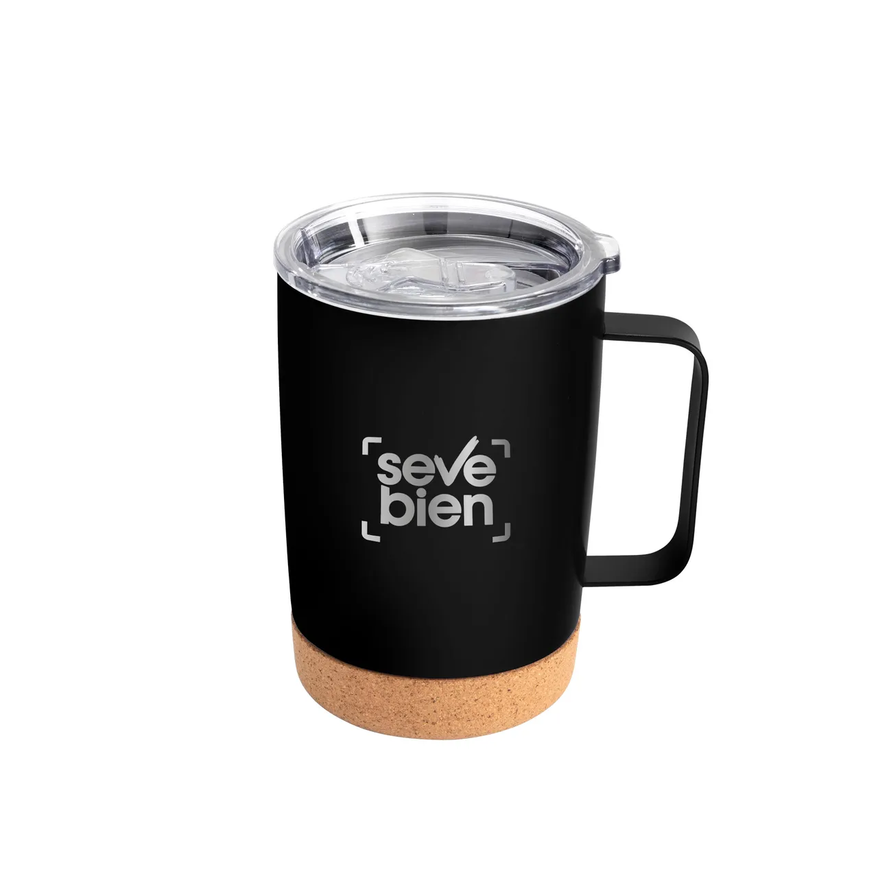 Diseño elegante con base de corcho.Mug doble pared con asa, sellado al vacío. Mug con aislamiento térmico. Tecnología vacuum. Interior en acero 304 y exterior en acero 201. Tapa de poliestireno con anillo de silicona. Asa metálica. Base de corcho. Pintura acabado semi mate. Mantiene hasta 12 hs la temperatura de las bebidas calientes y 24 hs de las bebidas frías.Medidas: Ø 8,5 cm x 13 cm. (no incluye asa)