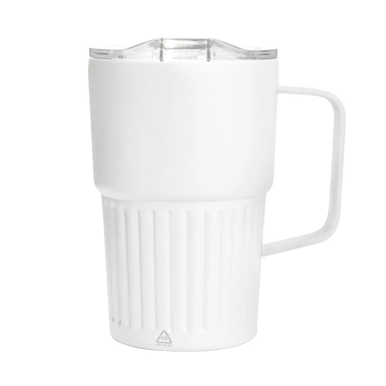 Diseño texturado para mejor agarre.Mug doble pared con asa, sellado al vacío. Mug con aislamiento térmico. Tecnología vacuum. Interior en acero 304 reciclado y exterior en acero 201. Tapa de poliestireno con anillo de silicona. Asa metálica. Pintura acabado semi mate. Parte inferior texturada. Mantiene hasta 12 hs la temperatura de las bebidas calientes y 24 hs de las bebidas frías.Medidas: Ø 8,7 cm x 14 cm. (no incluye asa)