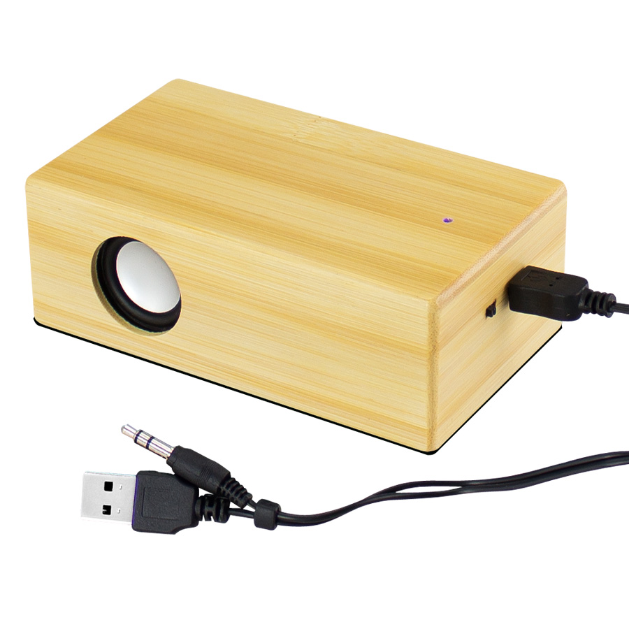 Parlante amplificador de sonido por Inducción, de madera de Bamboo. No necesita Bluetooth, Wi-Fi o conexión a cable. Amplifica el sonido una vez que se posa el celular sobre él, con un efecto de caja de resonancia. Compatible con cualquier modelo de teléfono celular. Contiene batería de ion-litio recargable incorporada. Incluye cable 2 en 1 Auxiliar/Mini-USB y cargador USB.