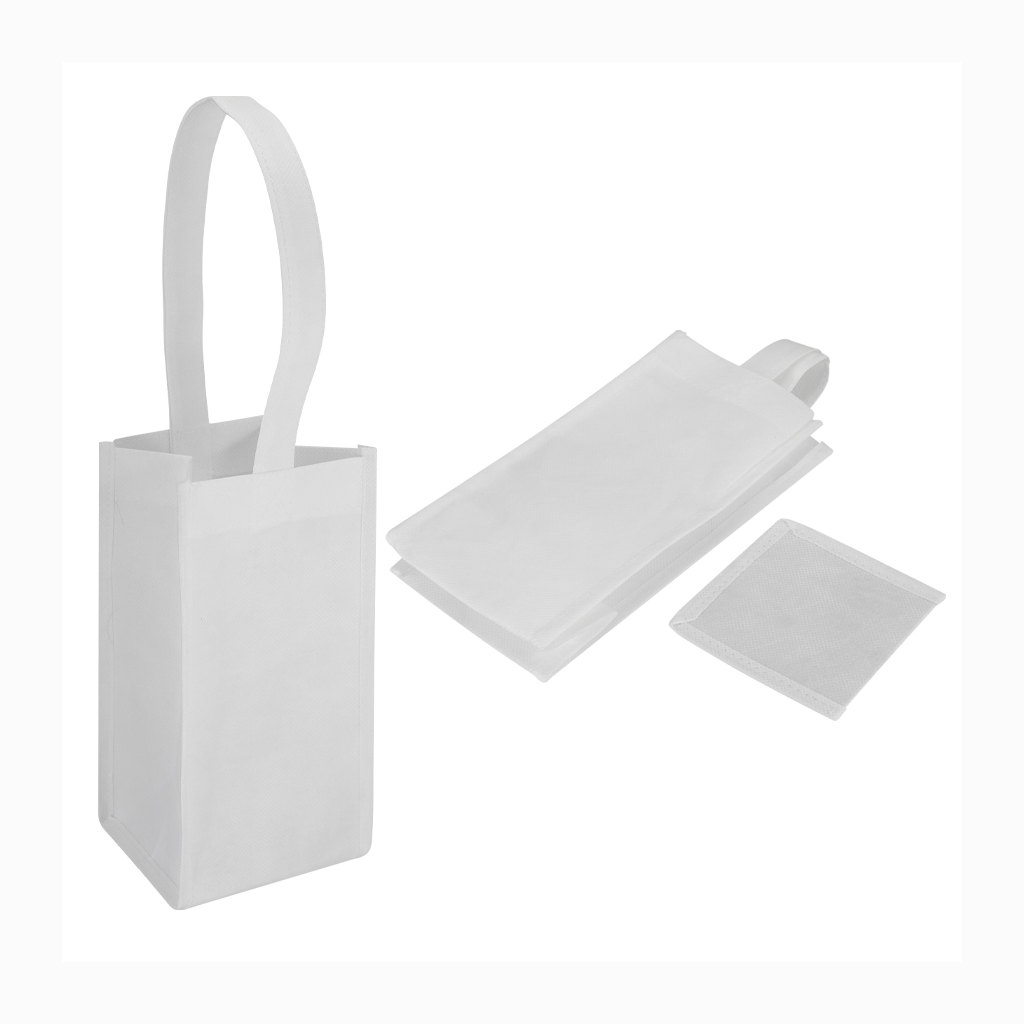 Porta-Botella de vino, para 1 unidad, en tela PET no tejida de 100g/m2. Cuenta con una manilla de 42cm. aprox. Y base de cartón forrado en tela PET no tejida. Ideal para sublimación.