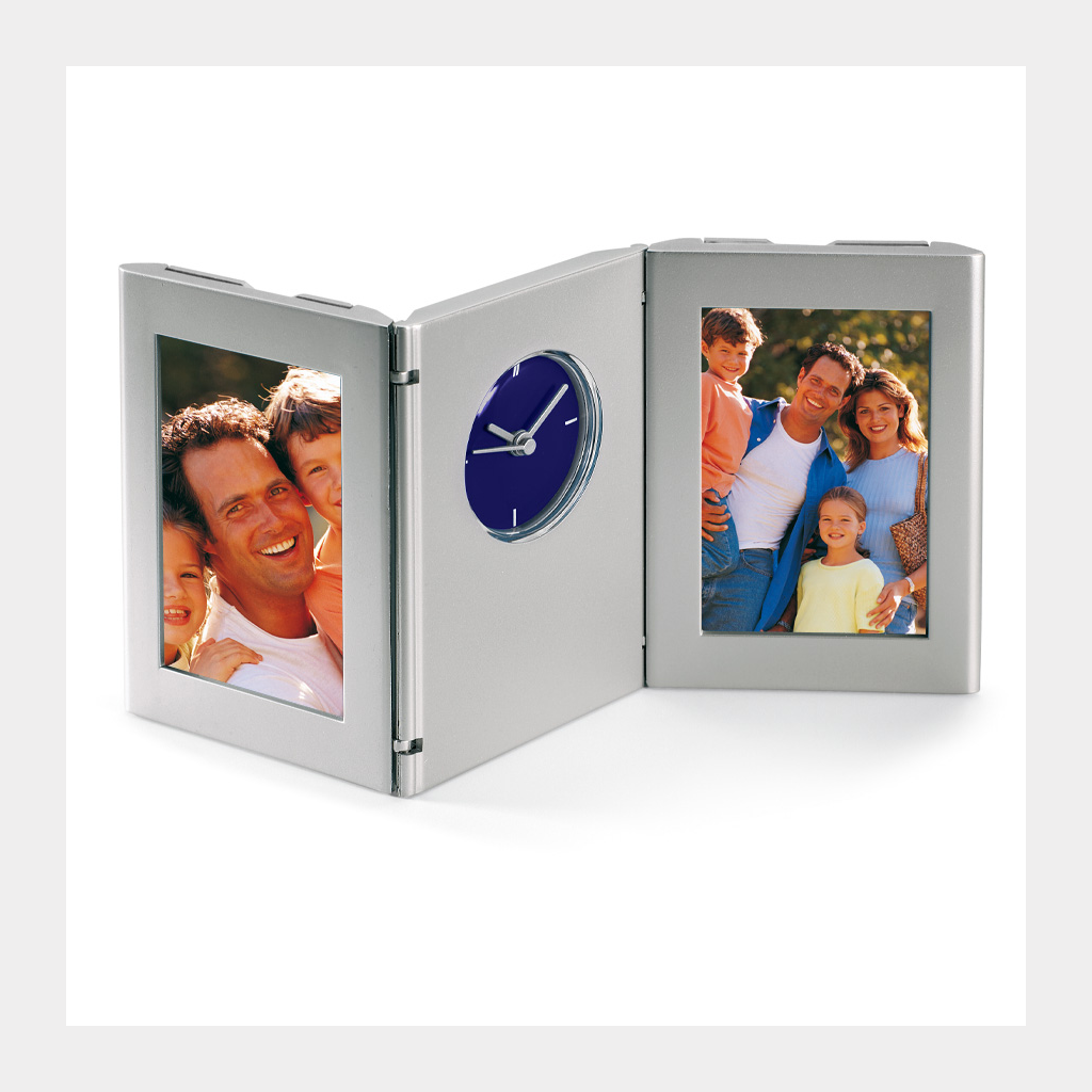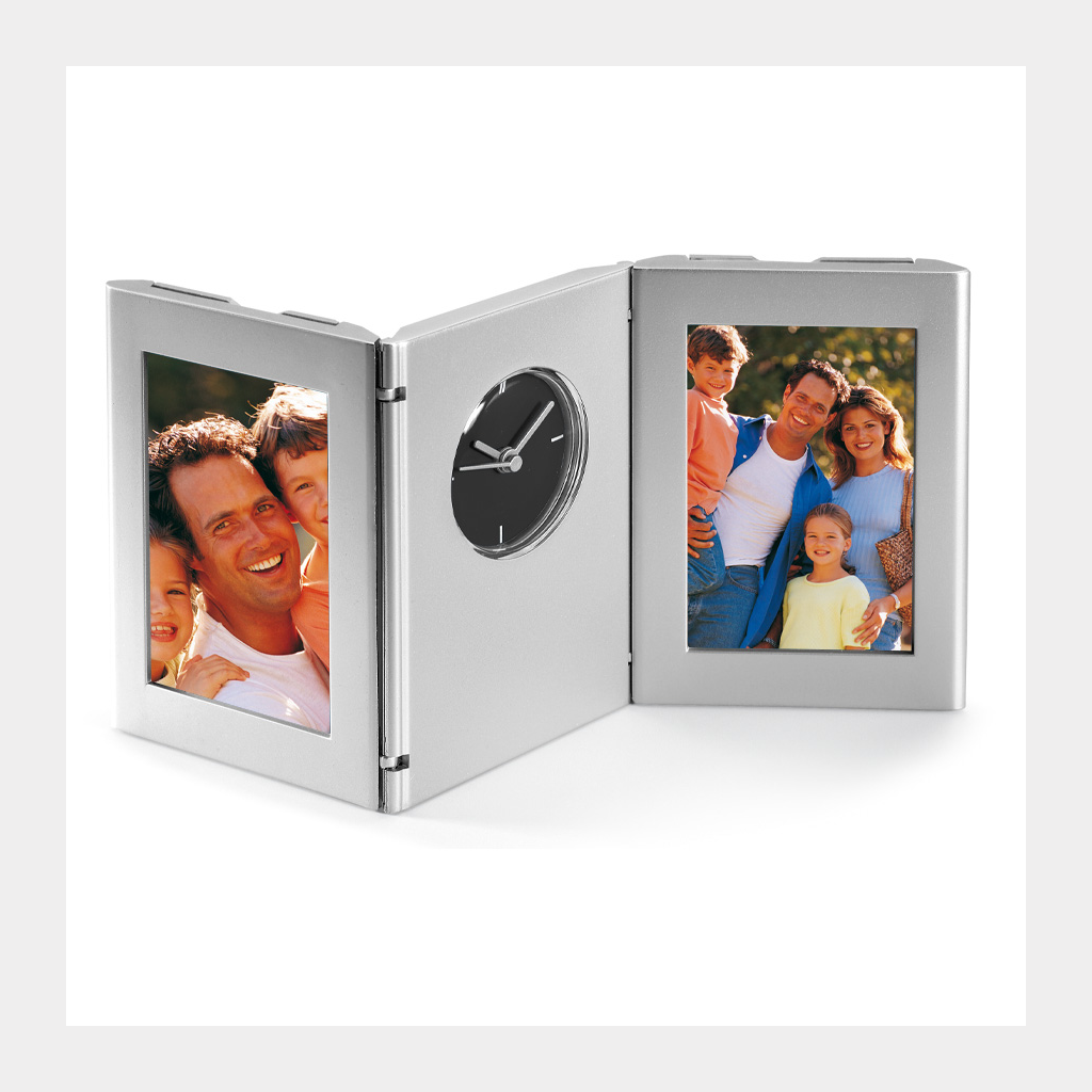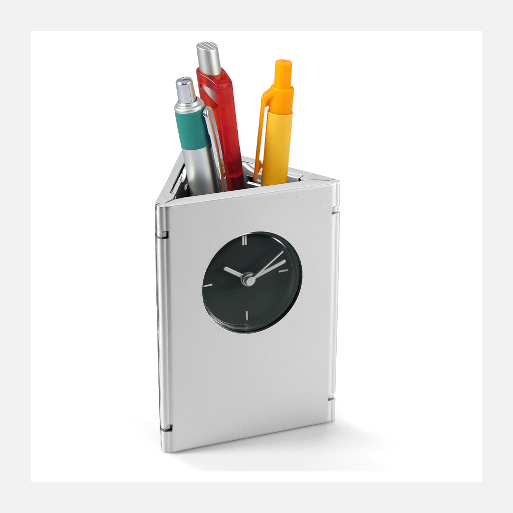 Porta-Lápices plegable con reloj análogo y 2 porta-fotos laterales, cuerpo gris plata.