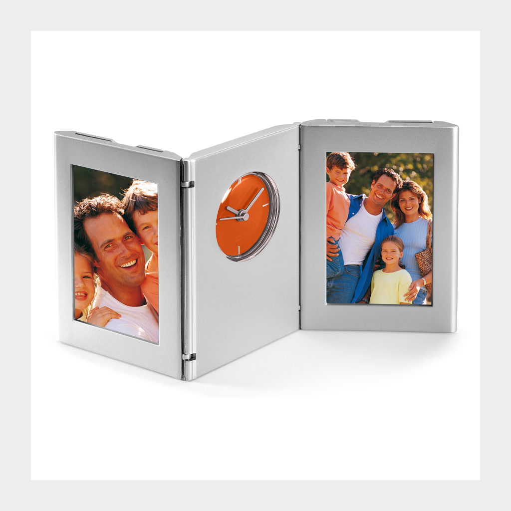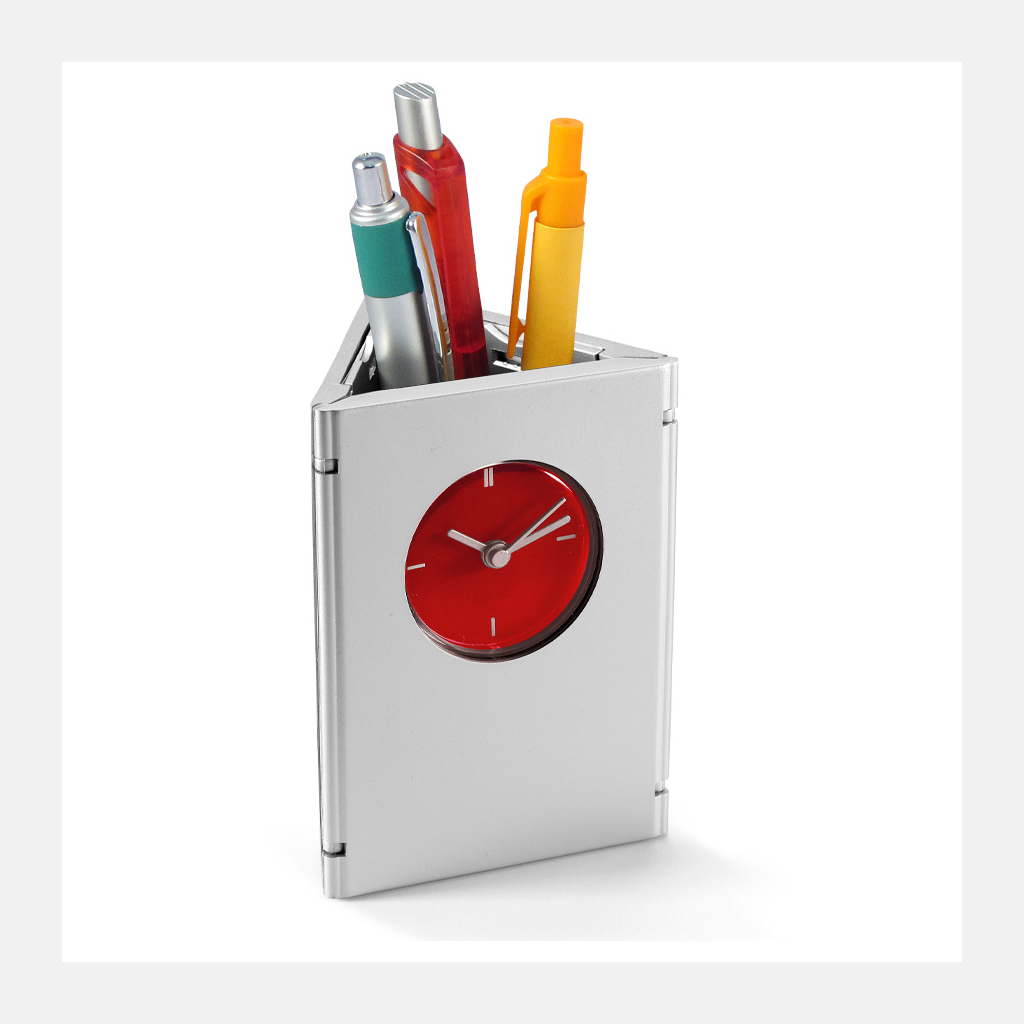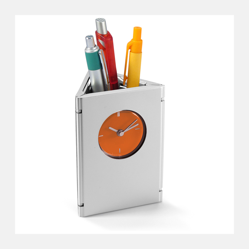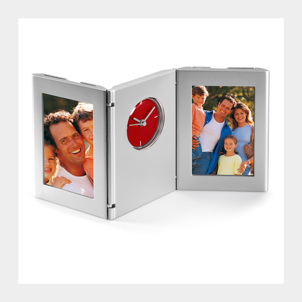 Porta-Lápices plegable con reloj análogo y 2 porta-fotos laterales, cuerpo gris plata.