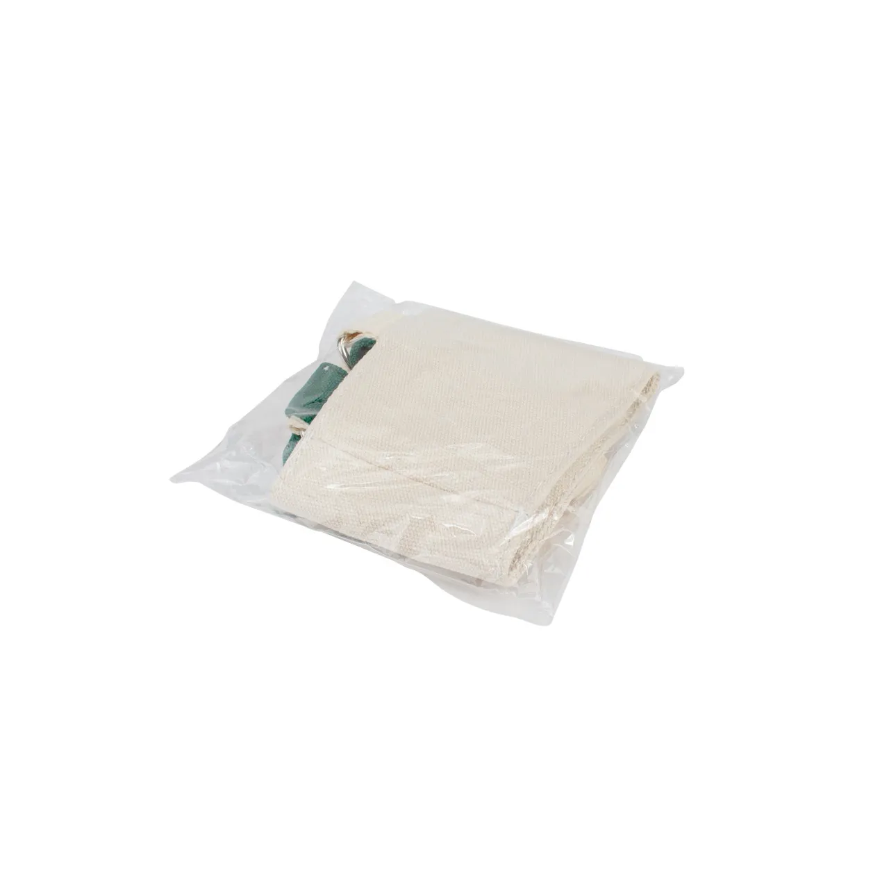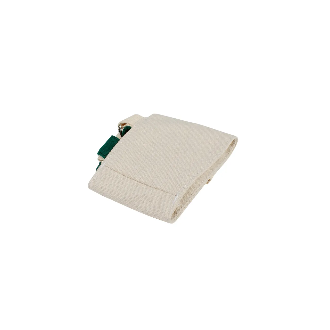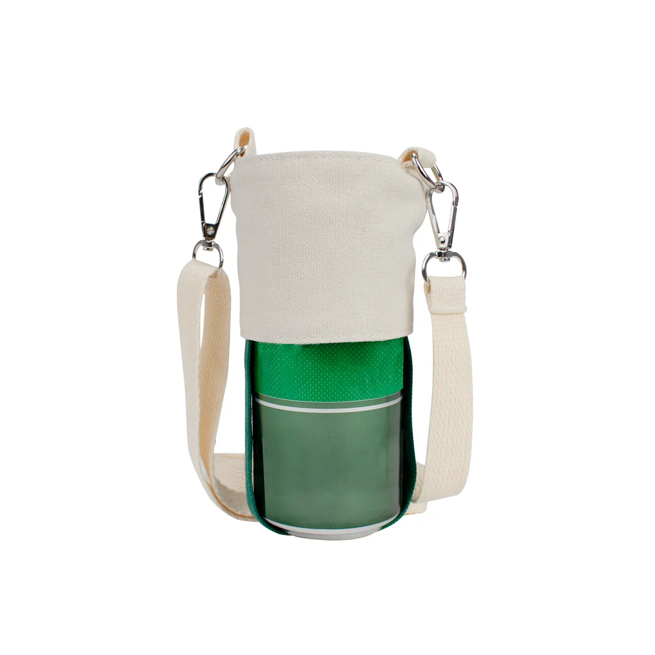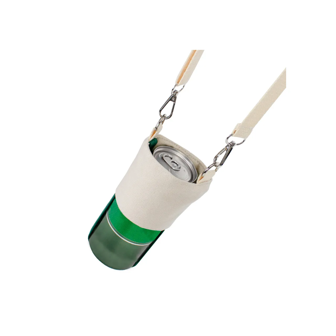 Porta-Lata o vaso de café colgante, en tela Canvas de 10oz color natural. Contiene soporte de color verde y lanyard colgante removible de 84 cm. de largo.
