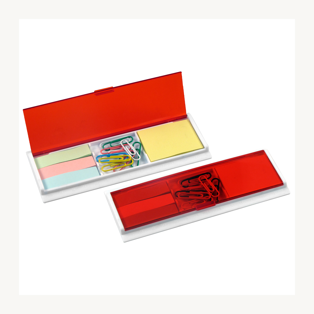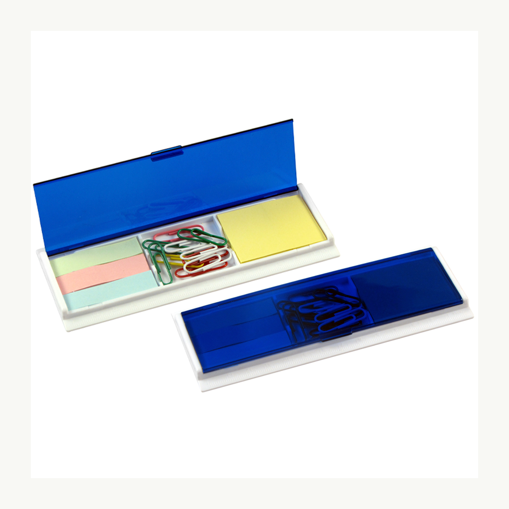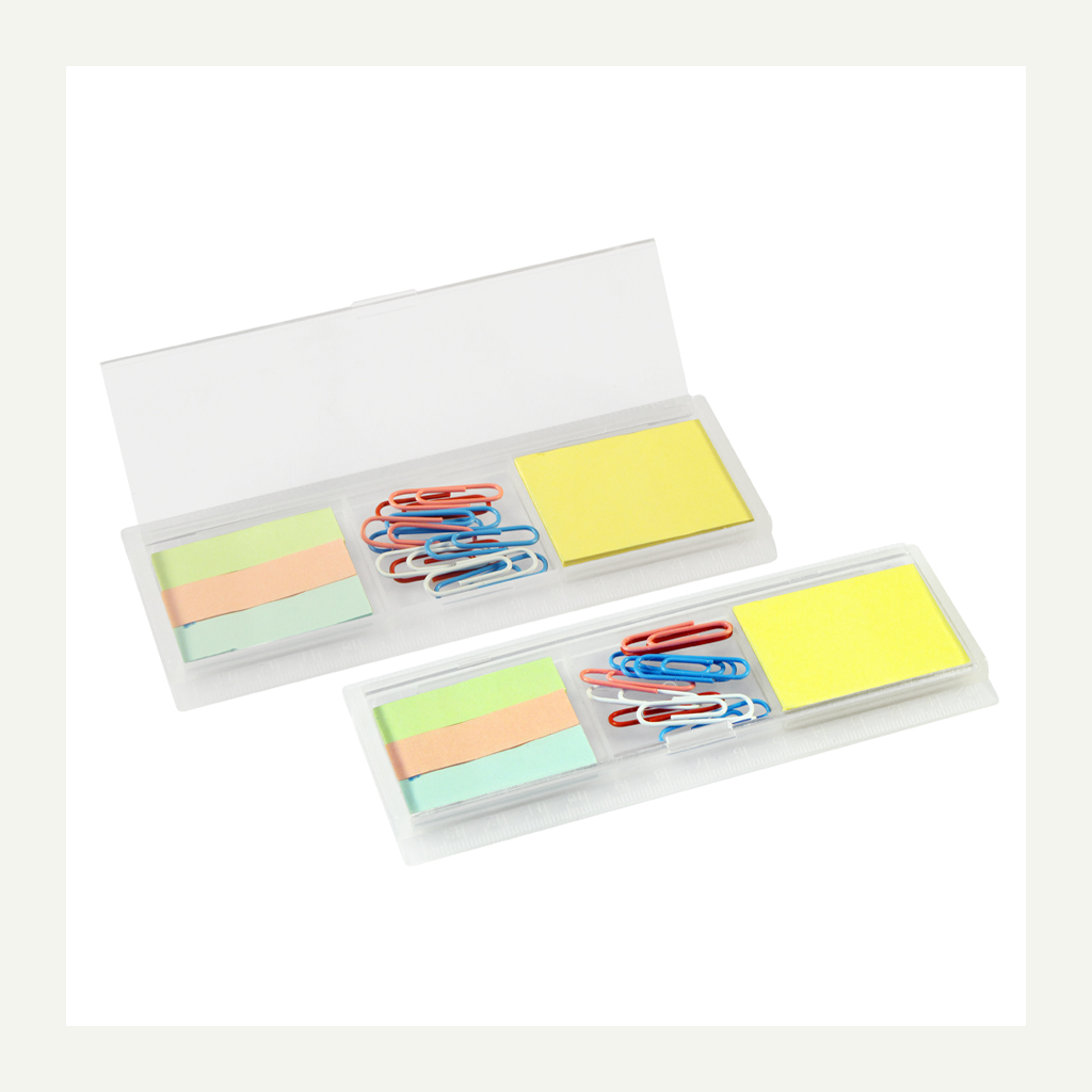 Porta notas adhesivas con clips de colores. Incluye 1 taco de notas adhesivas de 40 hojas de 4,8 x 3,6 cm + 3 tacos de 25 banderitas adhesivas de 4,8 x 1,2 cm + 10 clips recubiertos de colores. Regla de 14 cm y de 5,5″.