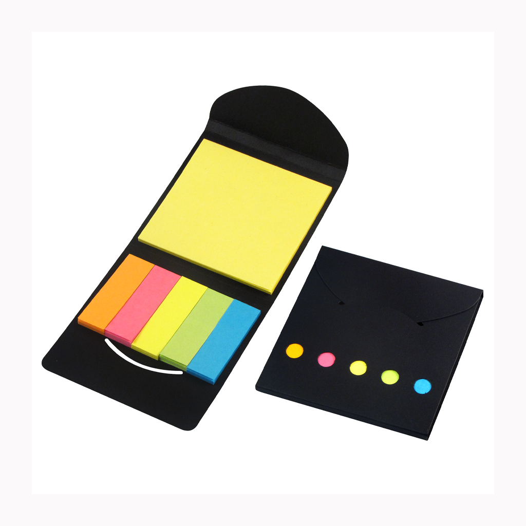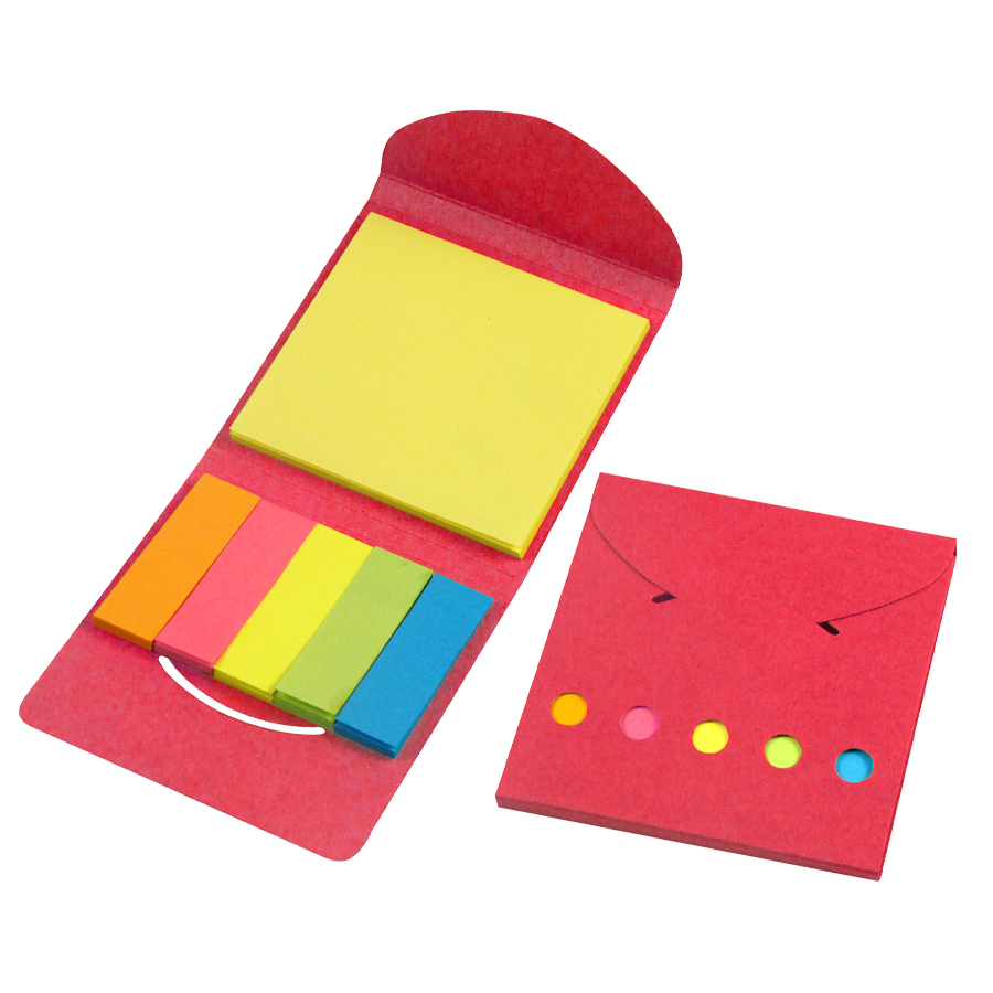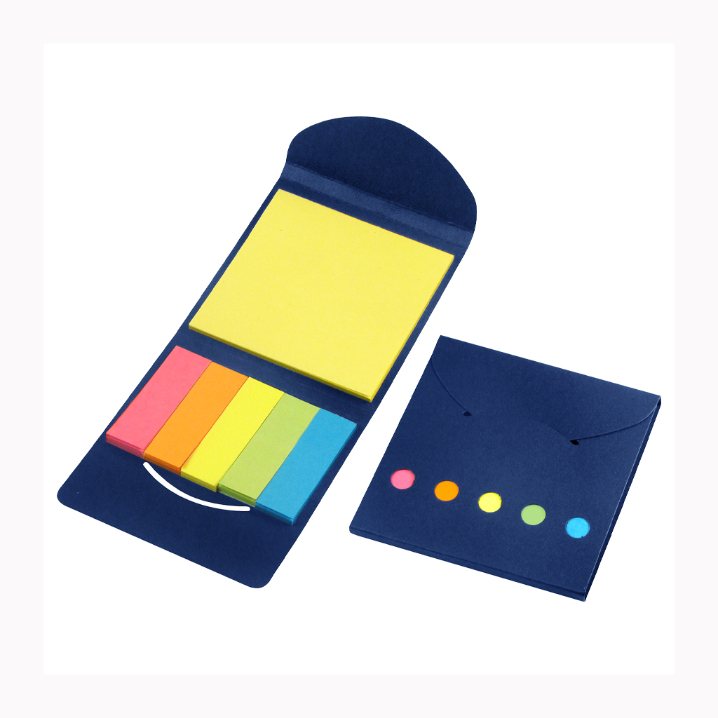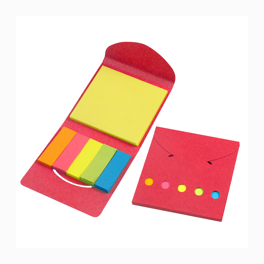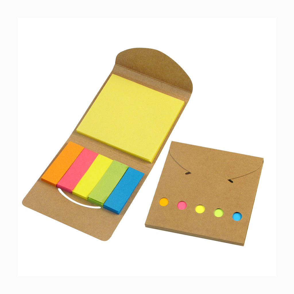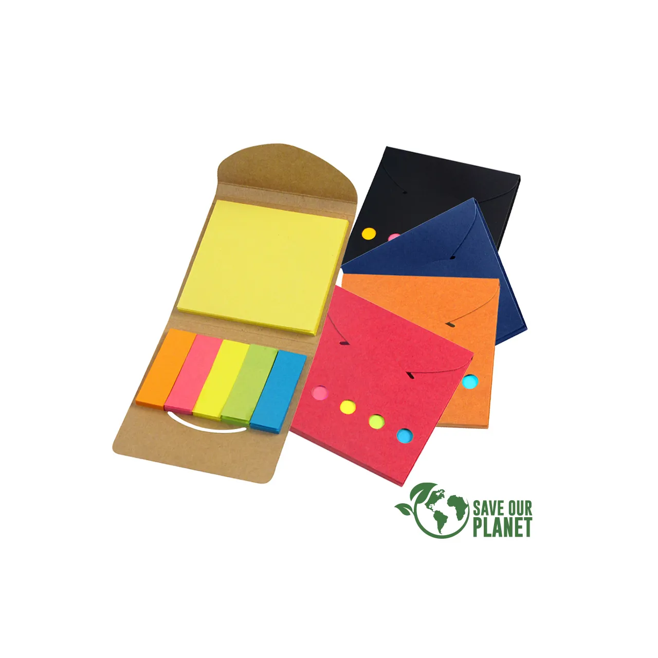 Porta Notas Adhesivas Ecológico de Cartón reciclado. Incluye 1 taco de notas adhesivas de 25 hojas de 7,5 x 7,5 cm + 5 tacos de 25 banderitas adhesivas de 5 x 1,5 cm.