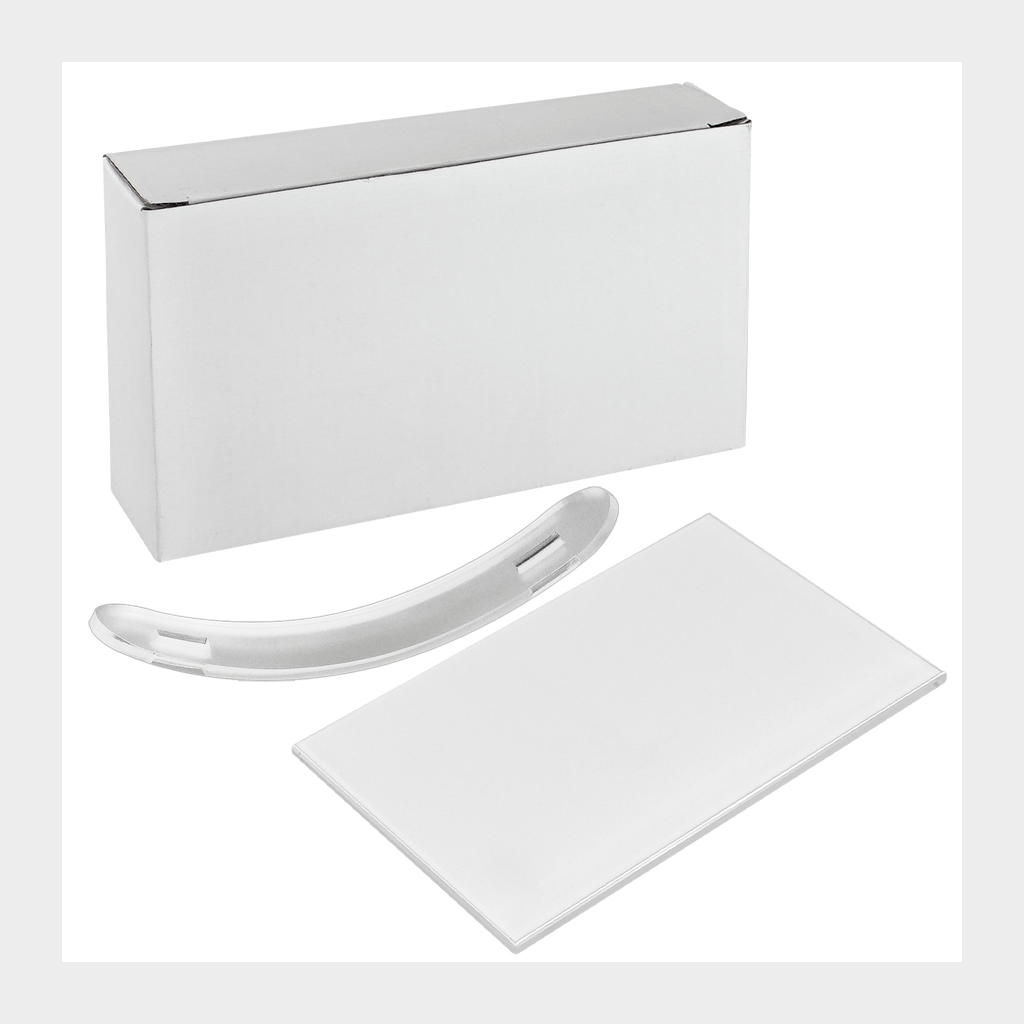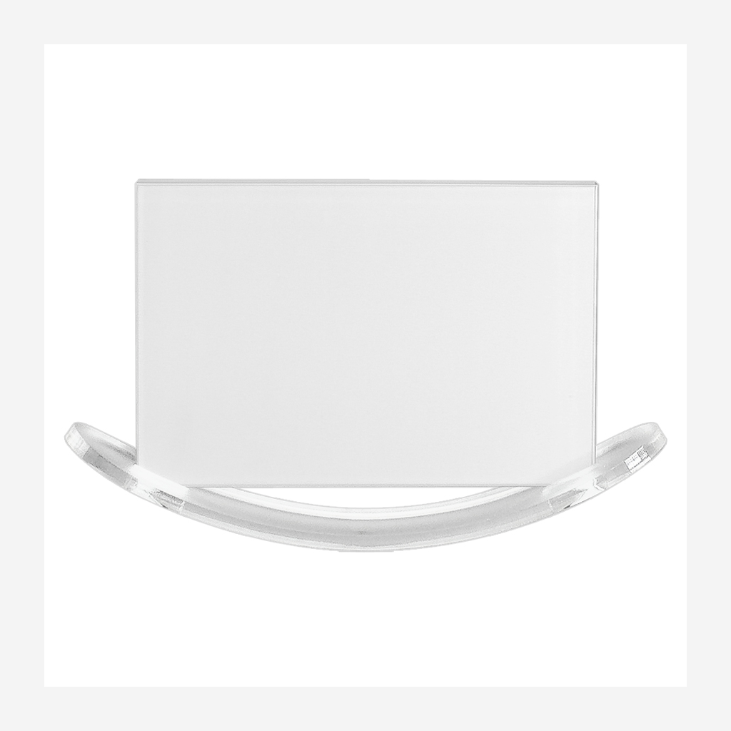Porta-Retrato balancín para Sublimación. Base curva Acrílico frozen. Porta-Foto de Vidrio de 15.3 x 10.2 x 0.3 cm. Presentación en caja de Cartón blanco.