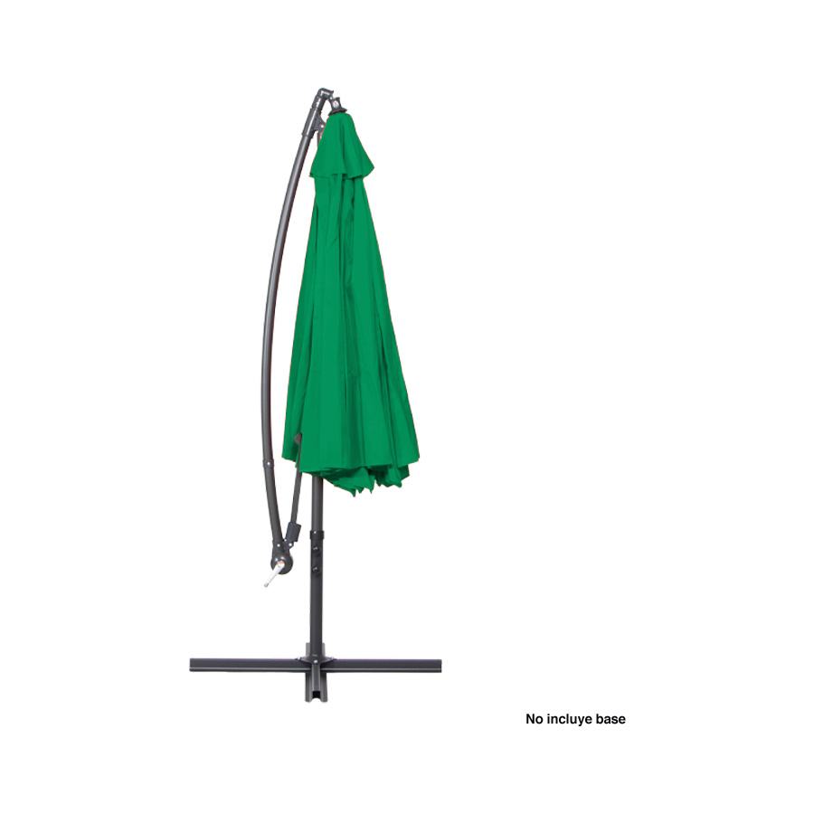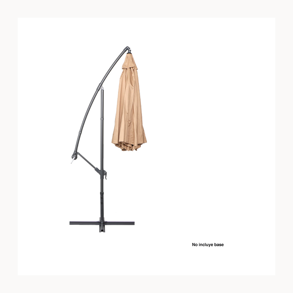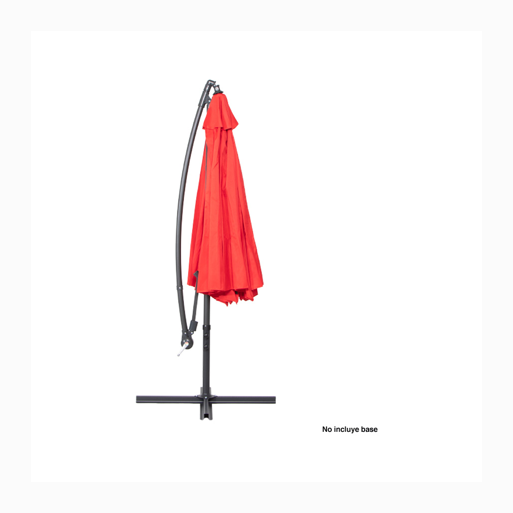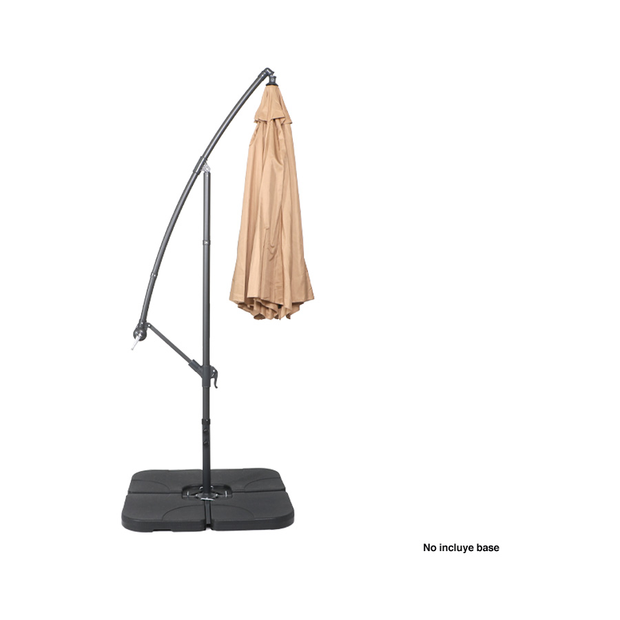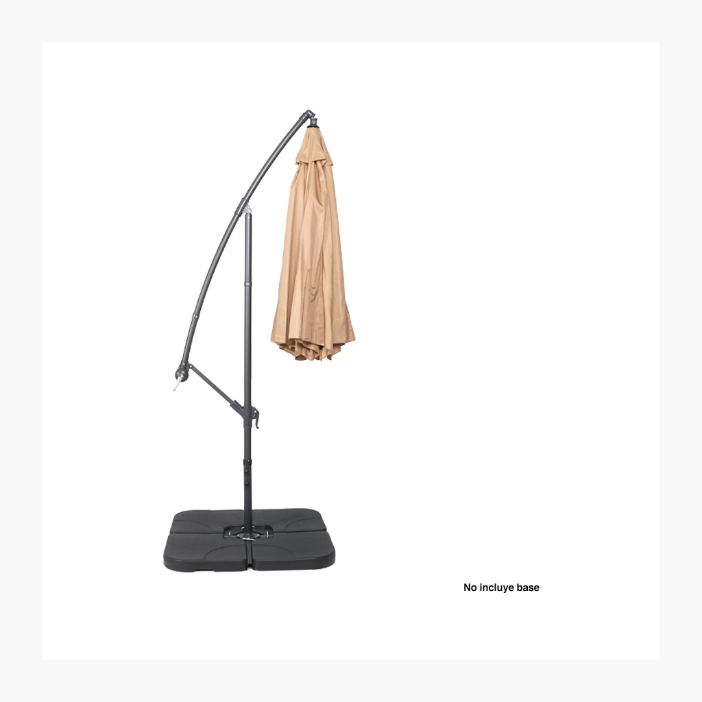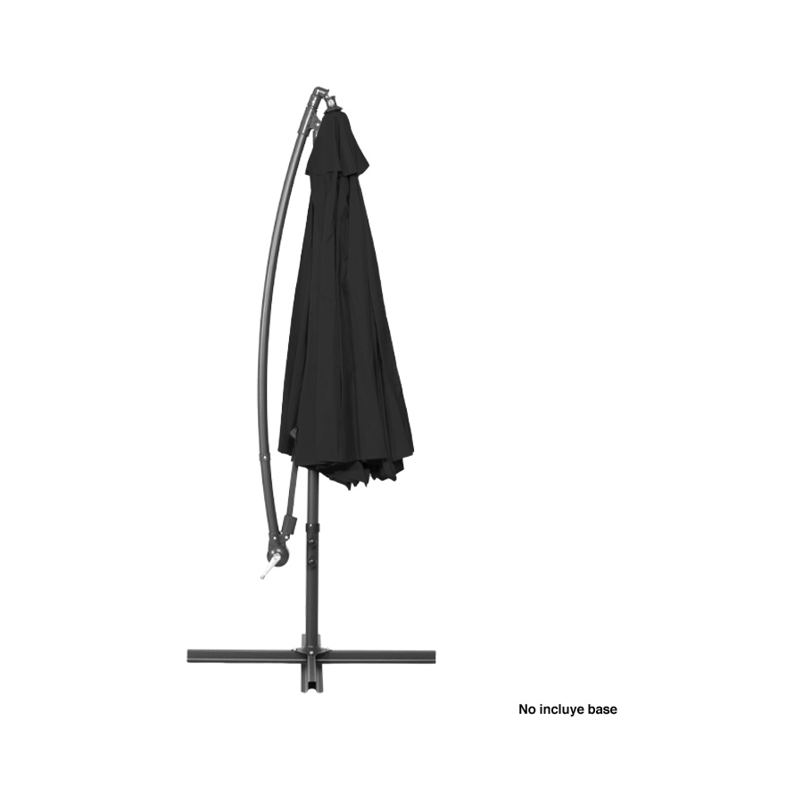 Quitasol colgante redondo de Ø3m, modelo «Banana», con 8 cascos de lona Poliéster UV impermeable de 160g. Contiene varas reforzadas de Acero recubierto de 12 x 18mm, asta de Acero recubierto de 48mm, sistema de apertura manual.