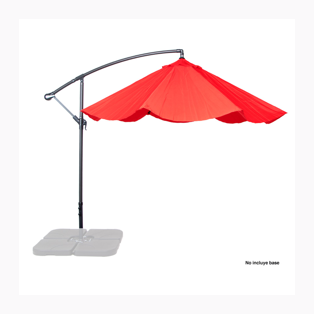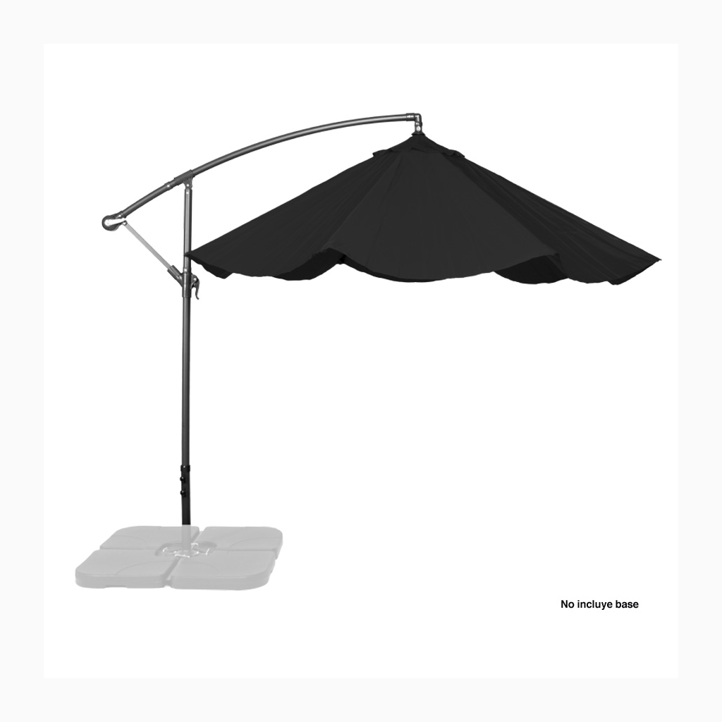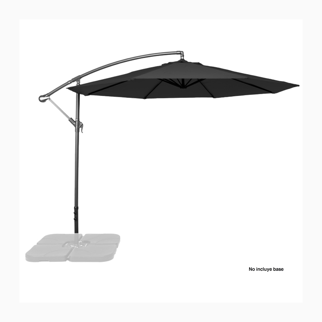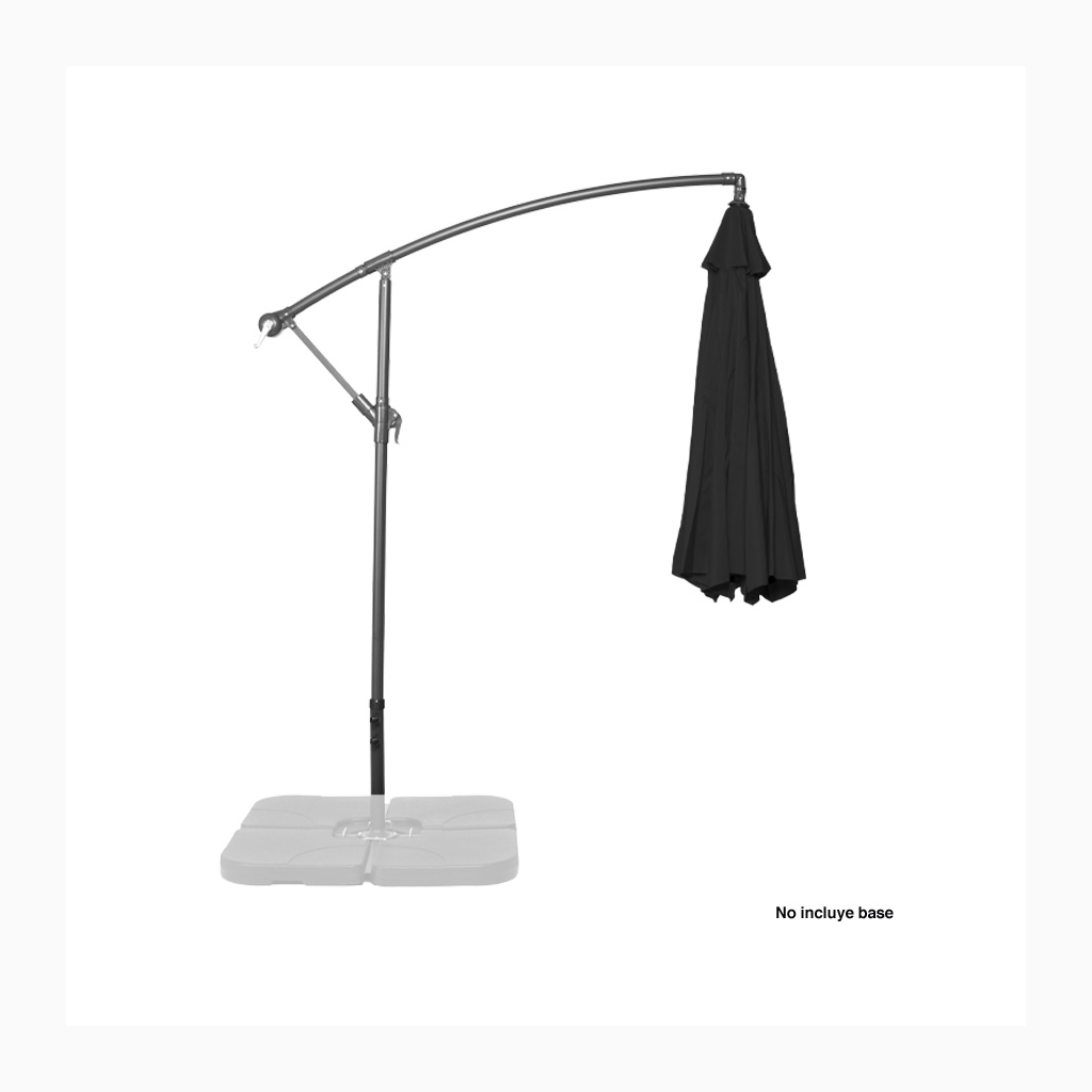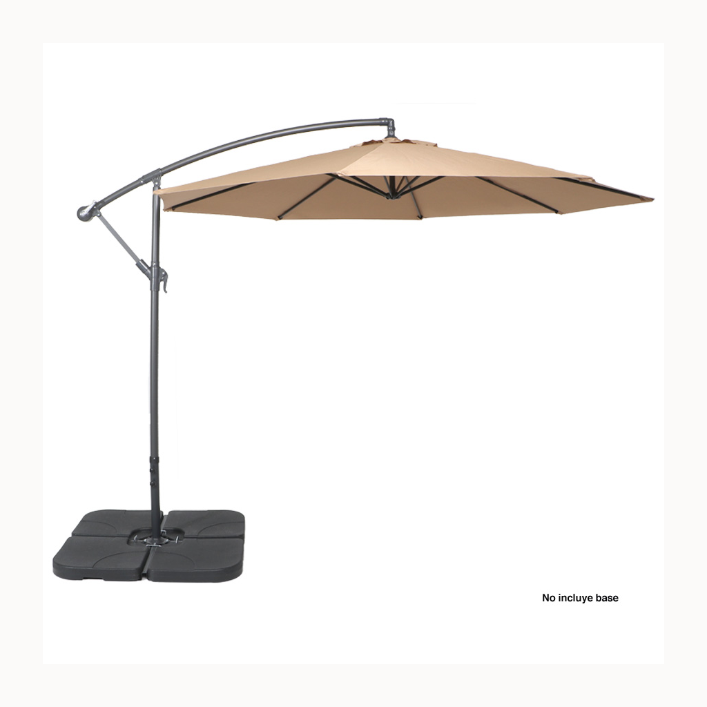 Quitasol colgante redondo de Ø3m, modelo «Banana», con 8 cascos de lona Poliéster UV impermeable de 160g. Contiene varas reforzadas de Acero recubierto de 12 x 18mm, asta de Acero recubierto de 48mm, sistema de apertura manual.