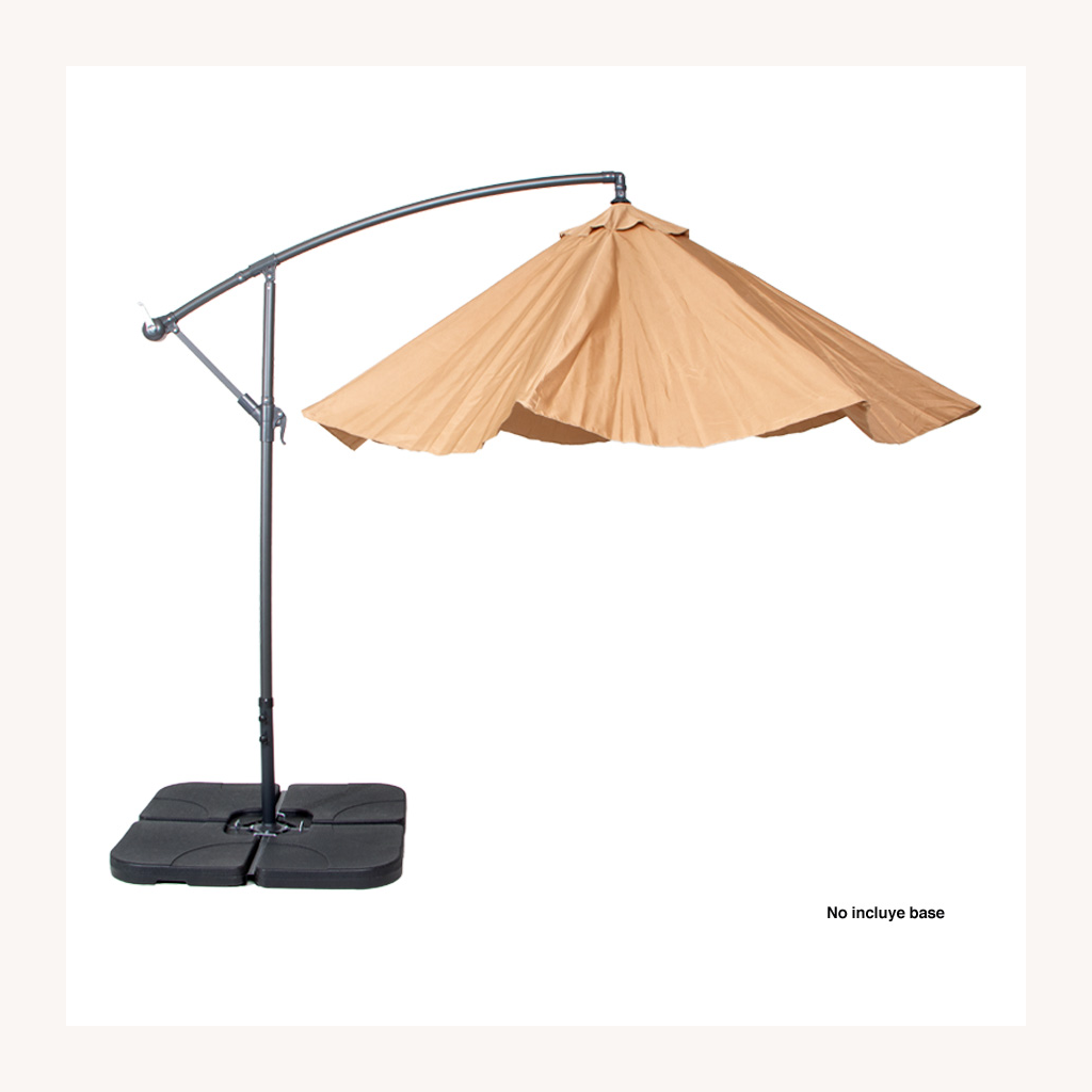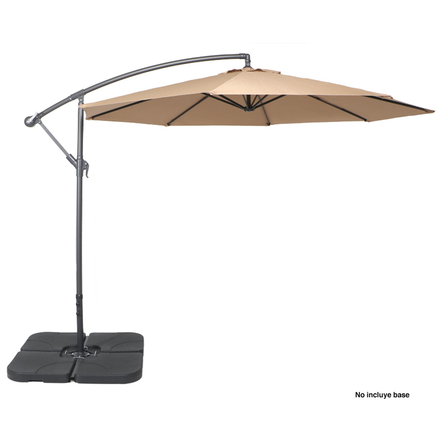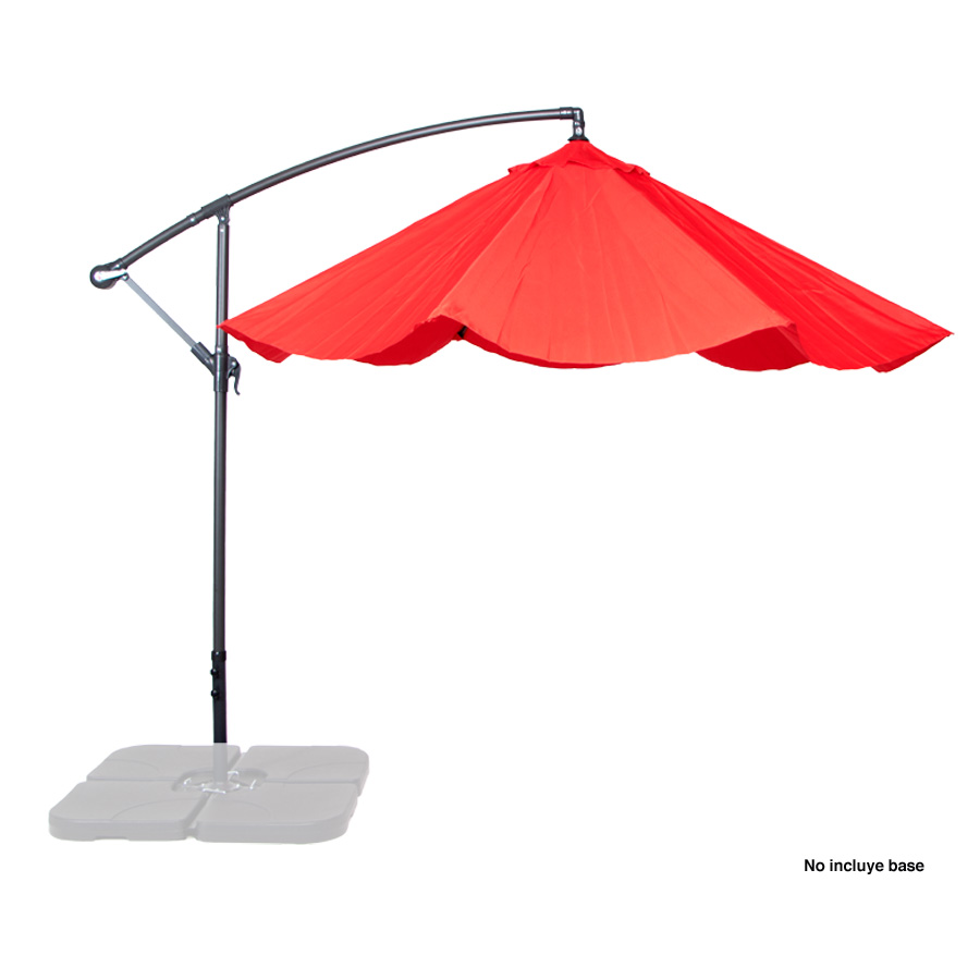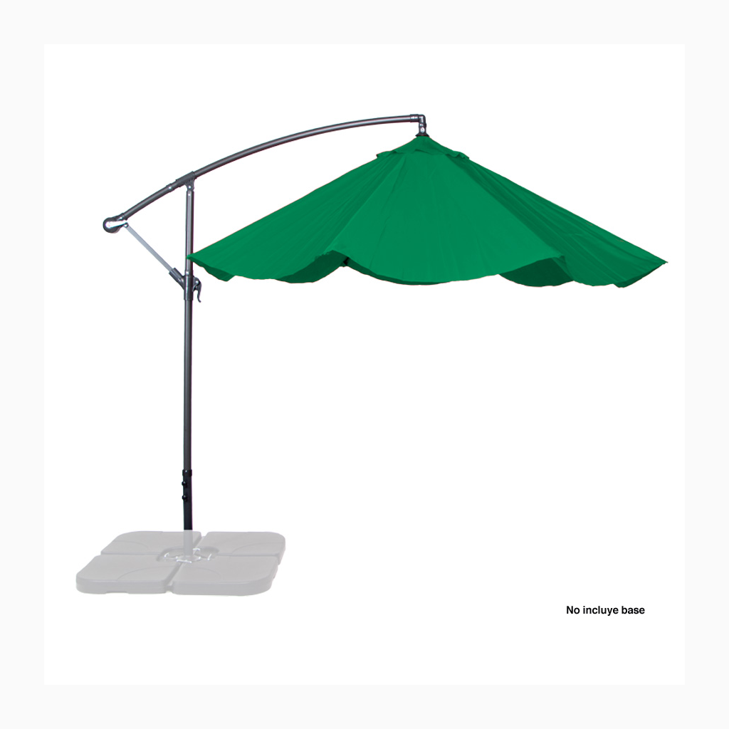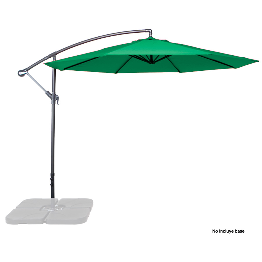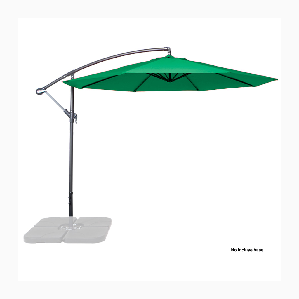 Quitasol colgante redondo de Ø3m, modelo «Banana», con 8 cascos de lona Poliéster UV impermeable de 160g. Contiene varas reforzadas de Acero recubierto de 12 x 18mm, asta de Acero recubierto de 48mm, sistema de apertura manual.
