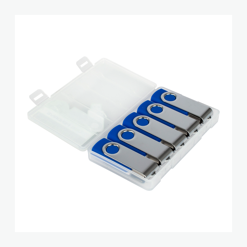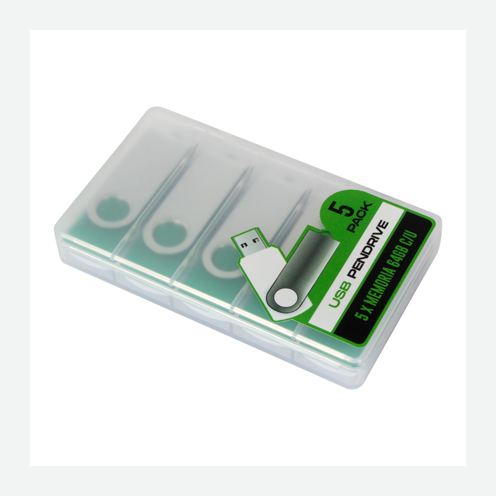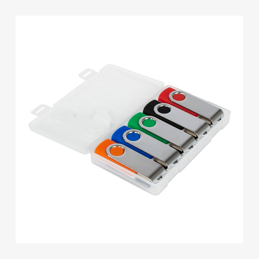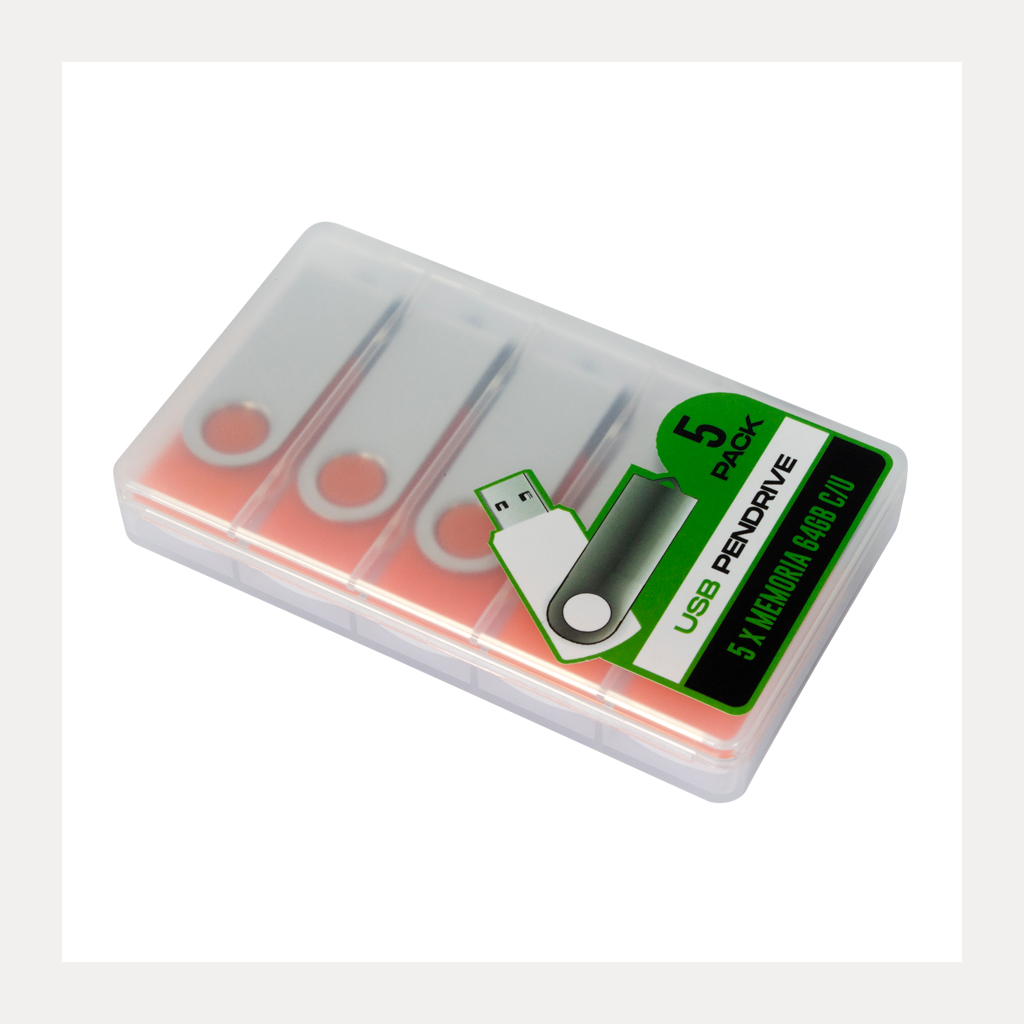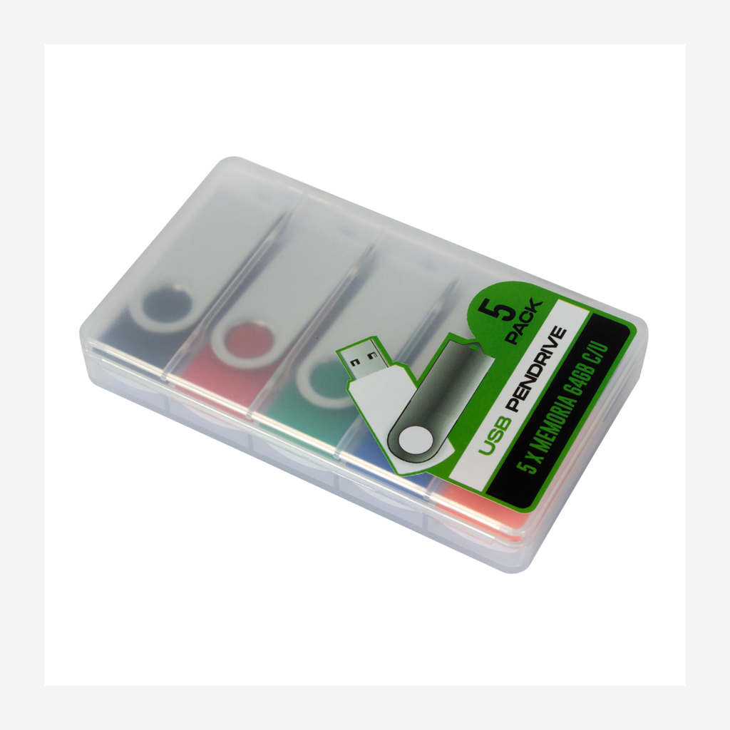 Set de 5 USB Pendrive 2.0 de 64GB de memoria cada Pendrive, con carcasa metálica de giro. Cada Pendrive tiene la particularidad de venir con cuerpo plástico bicolor: por un lado un color blanco común para todos los Pendrive, y por el otro, cuerpo de color con los colores clásicos de Promo Import. Presentación en Estuche de PVC translúcido de regalo