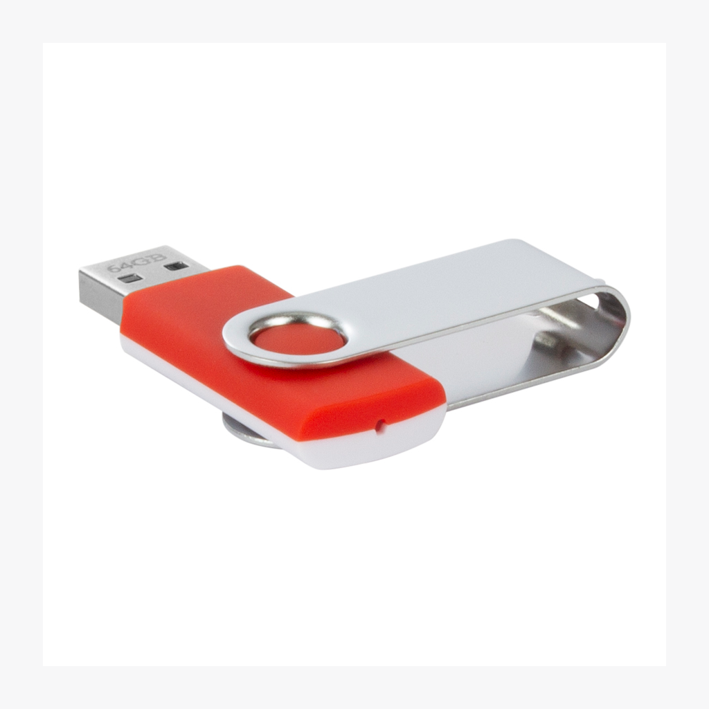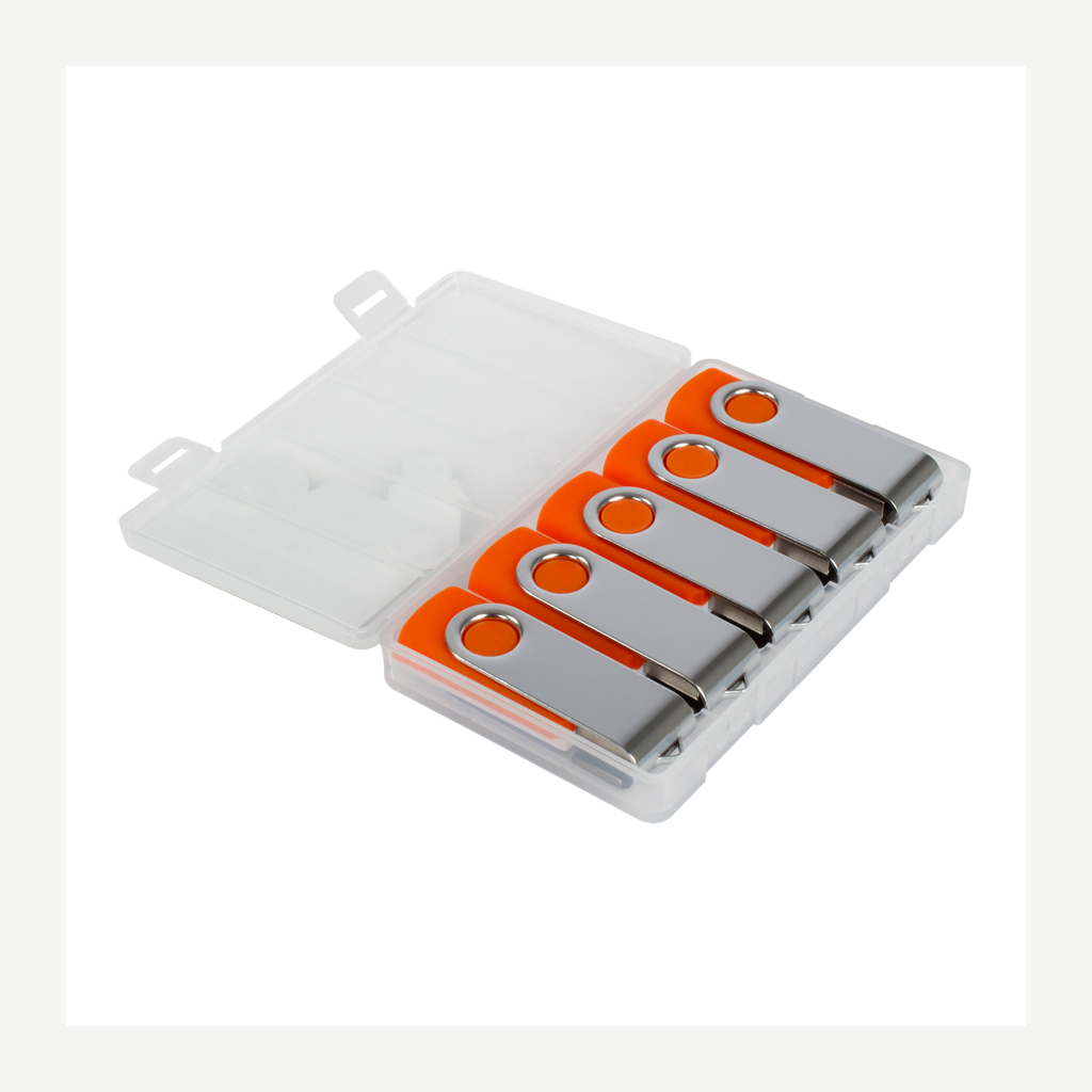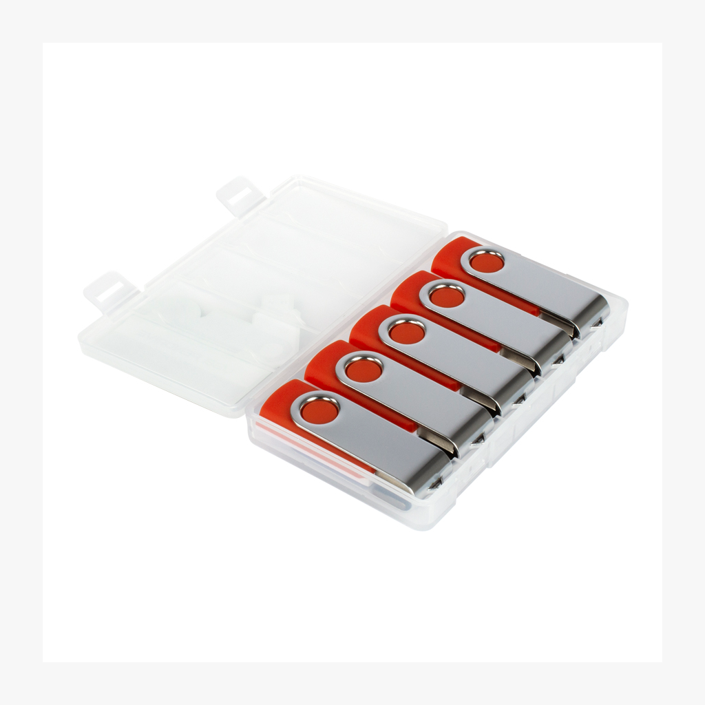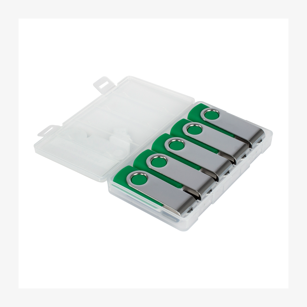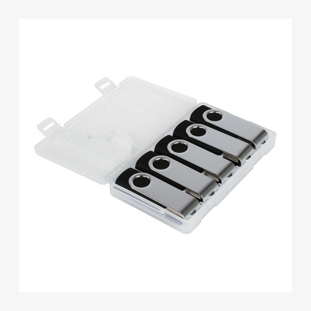 Set de 5 USB Pendrive 2.0 de 64GB de memoria cada Pendrive, con carcasa metálica de giro. Cada Pendrive tiene la particularidad de venir con cuerpo plástico bicolor: por un lado un color blanco común para todos los Pendrive, y por el otro, cuerpo de color con los colores clásicos de Promo Import. Presentación en Estuche de PVC translúcido de regalo