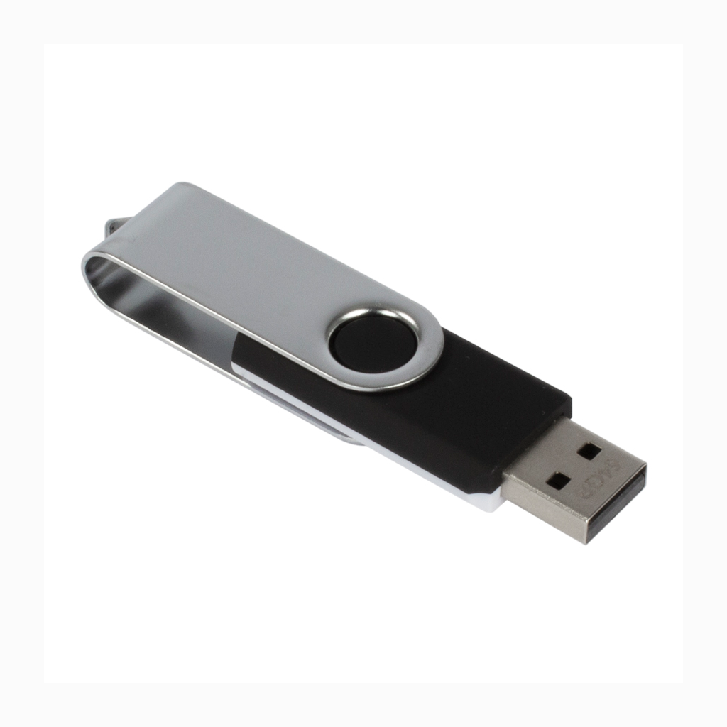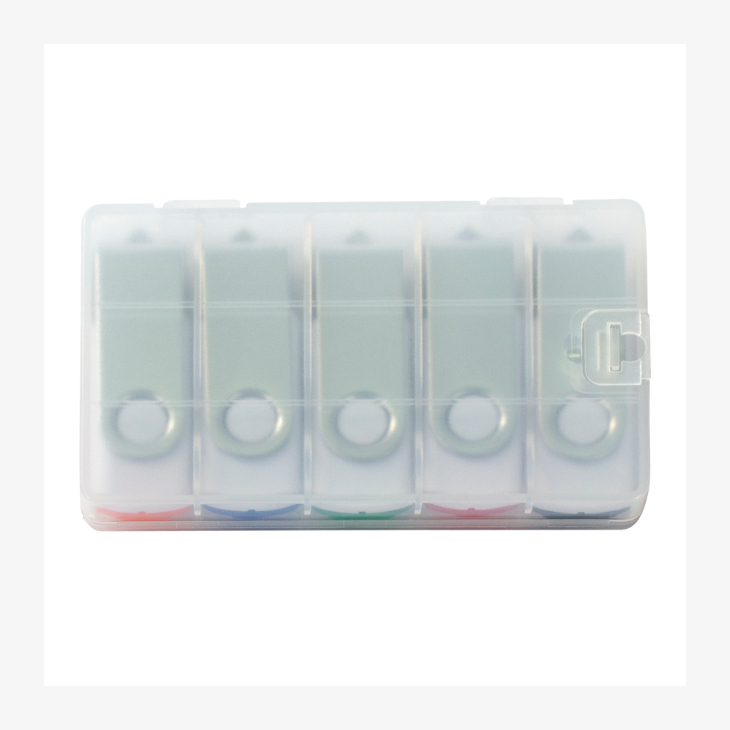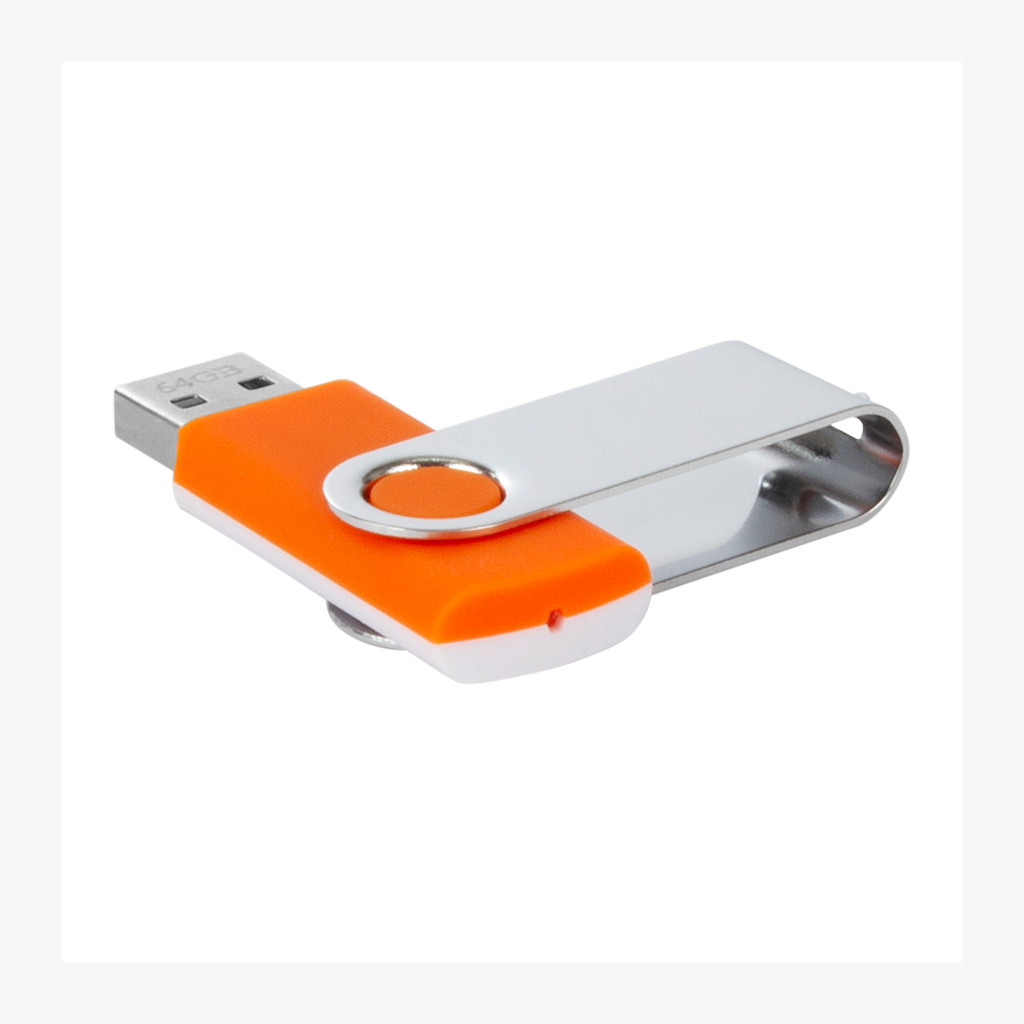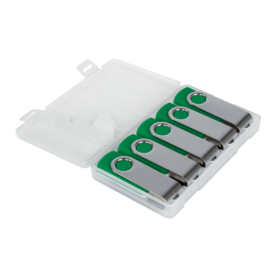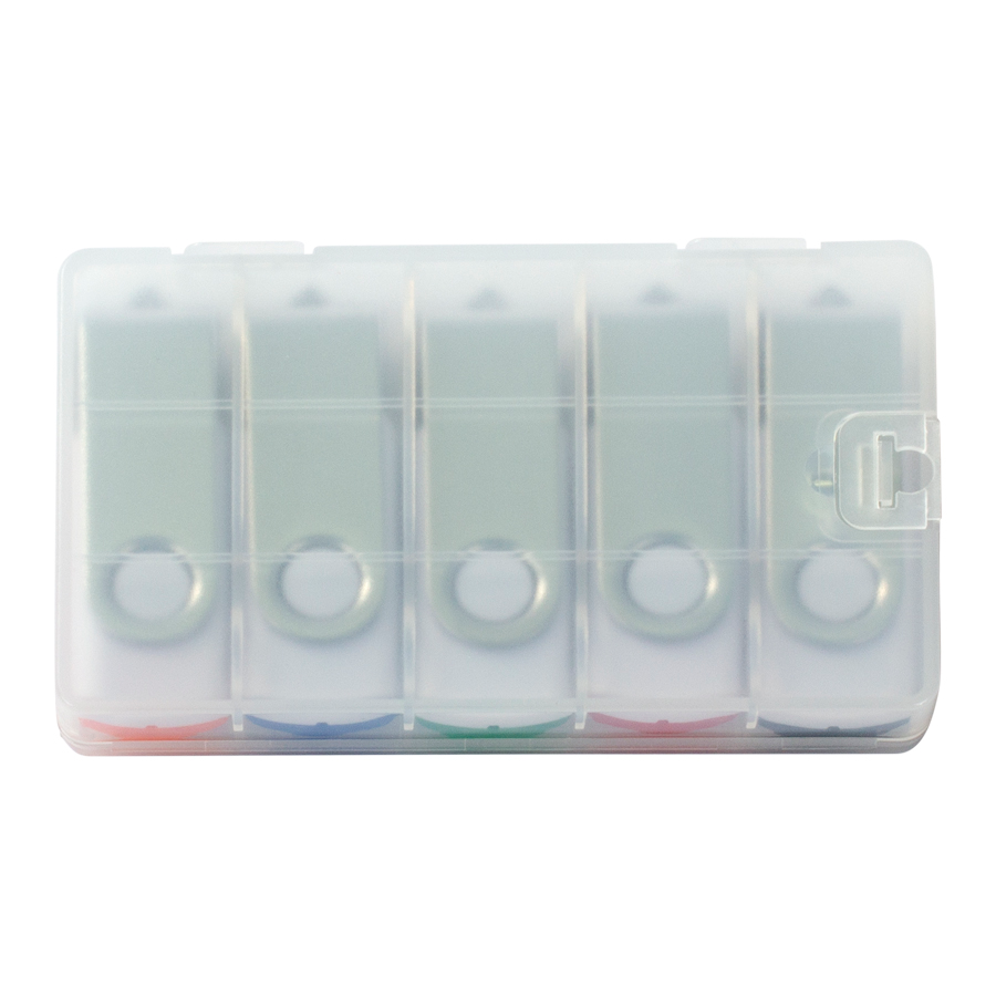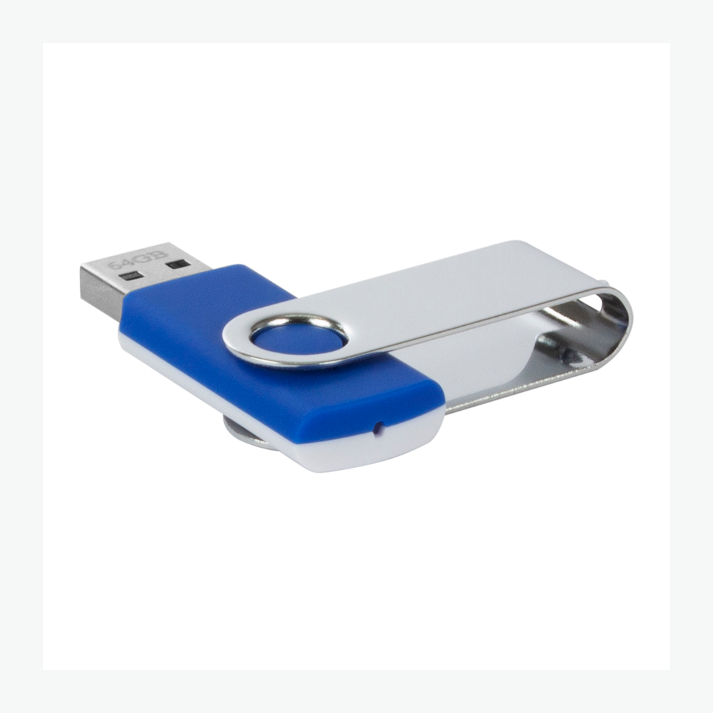 Set de 5 USB Pendrive 2.0 de 64GB de memoria cada Pendrive, con carcasa metálica de giro. Cada Pendrive tiene la particularidad de venir con cuerpo plástico bicolor: por un lado un color blanco común para todos los Pendrive, y por el otro, cuerpo de color con los colores clásicos de Promo Import. Presentación en Estuche de PVC translúcido de regalo