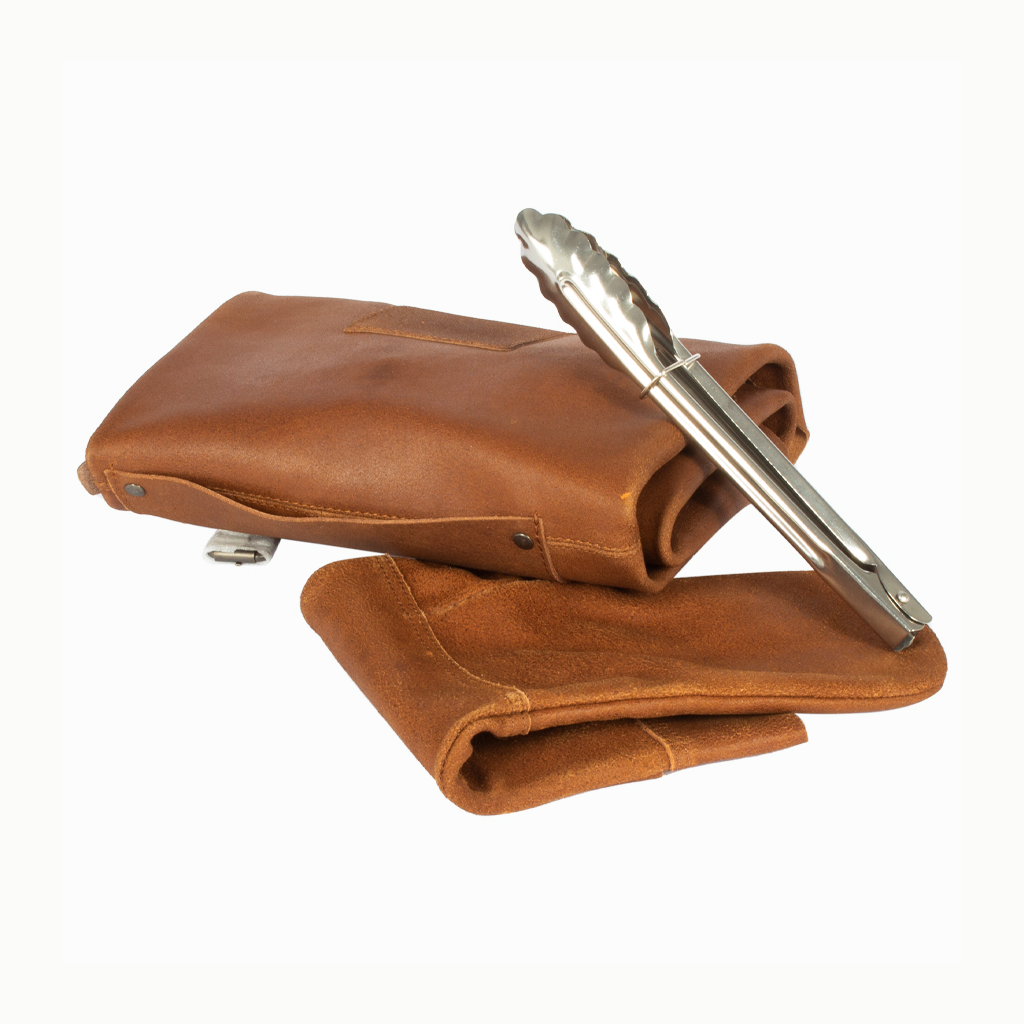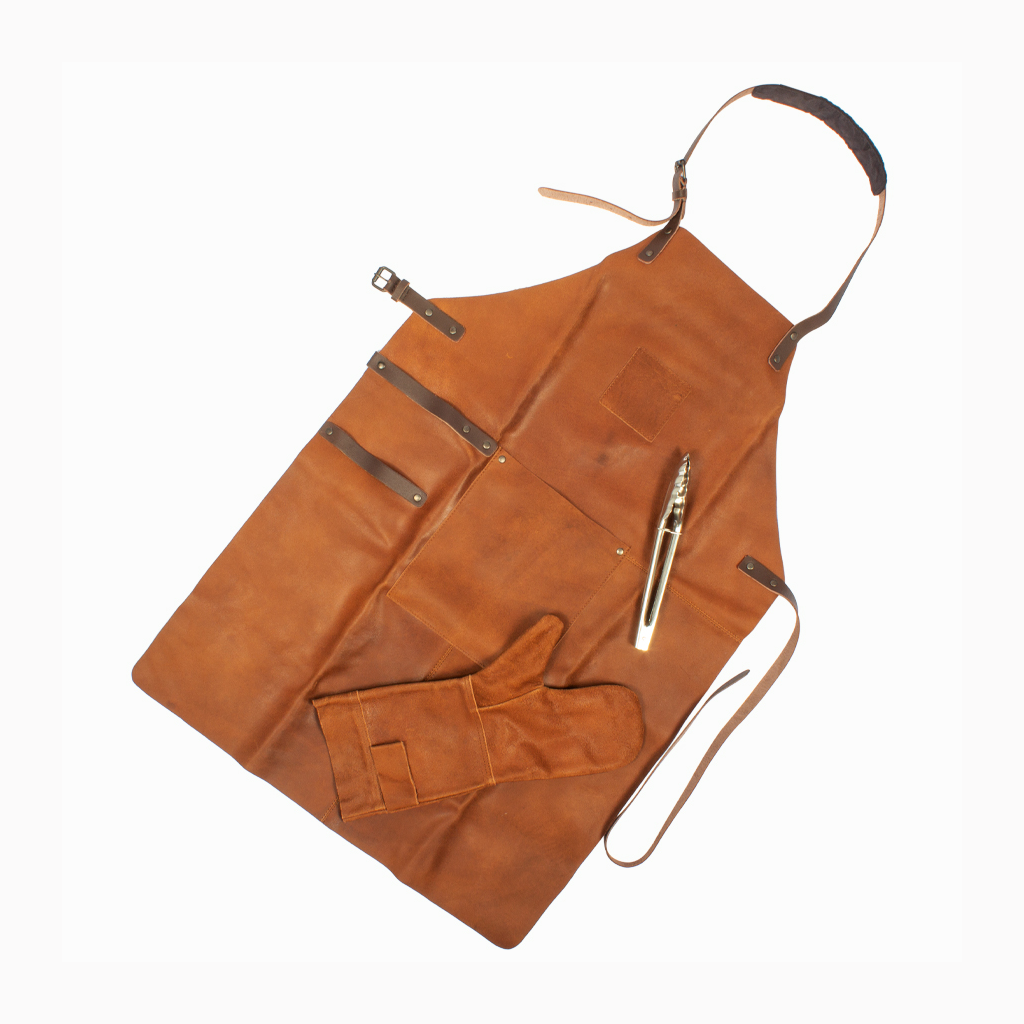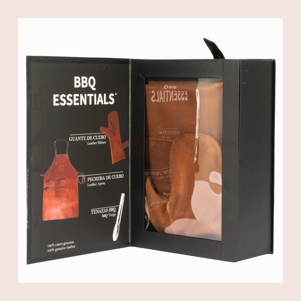 Un regalo fuera de serie. Deluxe set de Asador, contiene Pechera de Asador BBQ en Cuero tostado 100% genuino color café cognac, con cintas y porta-accesorios de Cuero 100% genuino color café oscuro. Remaches de acero envejecido y bolsillo delantero de 20.5 x 23 cm. Cuadrado para logo de 8 x 8 cm. Contiene además largo mitón de Asador BBQ en Cuero engamuzado 100% genuino color café cognac y tenazas de Acero inoxidable. Presentación en elegante caja de regalo de cartón negro con ventana de mica transparente y gráfica a todo color con descripción de los elementos del set.