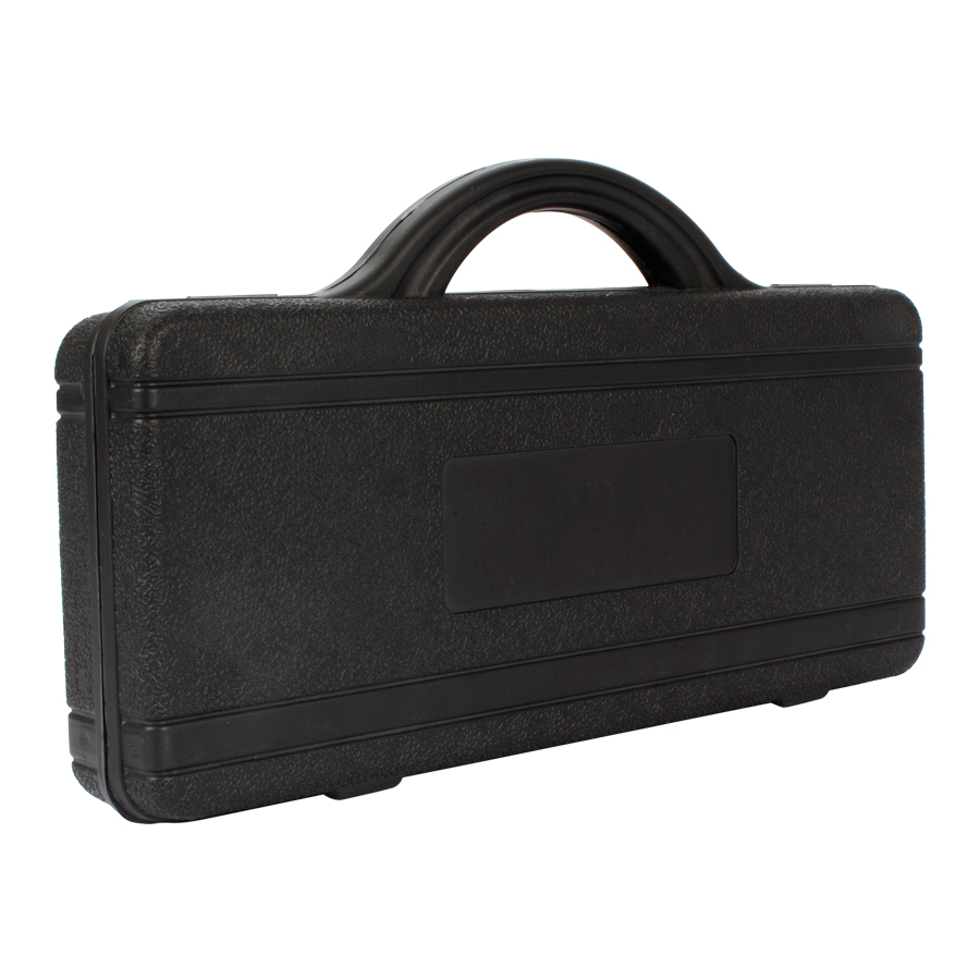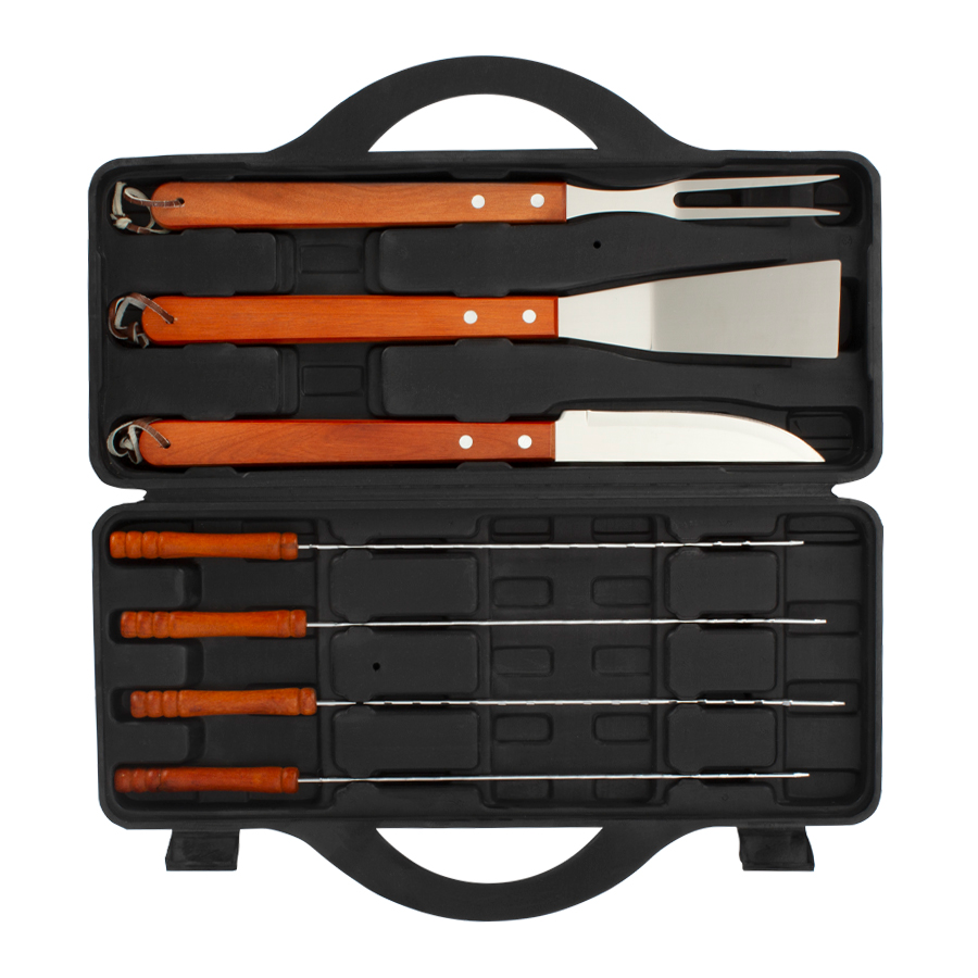 Set de 7 herramientas de BBQ en Maletín de plástico duro negro. Con ventana rectangular lisa exterior para aplicar logo.