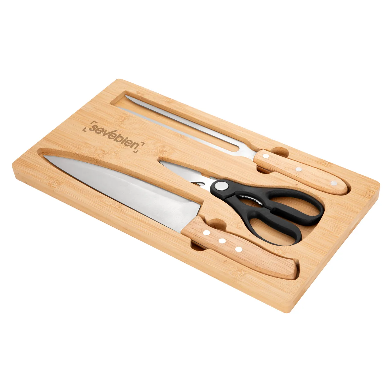 El detalle que se luce en cada asadoSet de asado. Tabla de corte de bambú con imán en el lado opuesto para fijar los 3 utensilios: Tijera de cocina multiuso (corte de aves, pescados, vegetales, y hierbas con abridor de botellas y rompenueces) de acero con mango plástico; Cuchillo chef y Tenedor, ambos de acero con mango de madera. Medidas: 19,5 x 8,5 cm. (tijera), 33,5 x 4,5 cm. (cuchillo) y 30,5 x 3 cm. (tenedor)