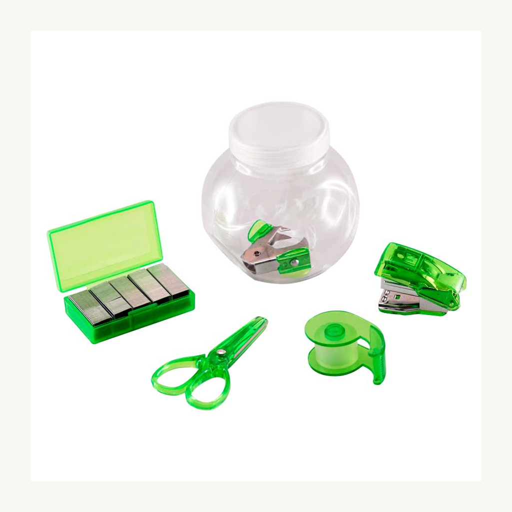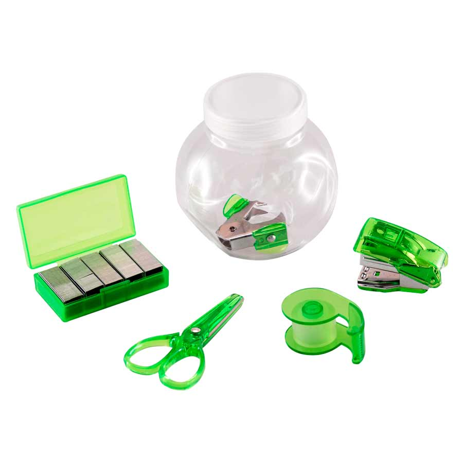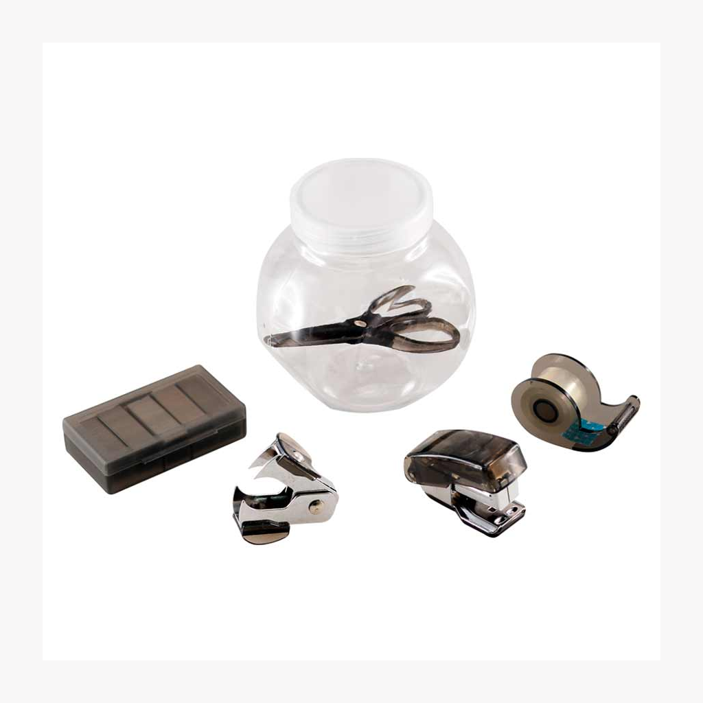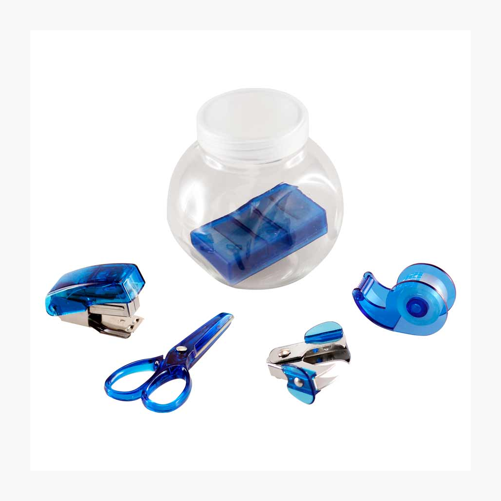 Set de oficina en frasco plástico transparente con tapa frozen. Ideal espacio para logo en tapa.