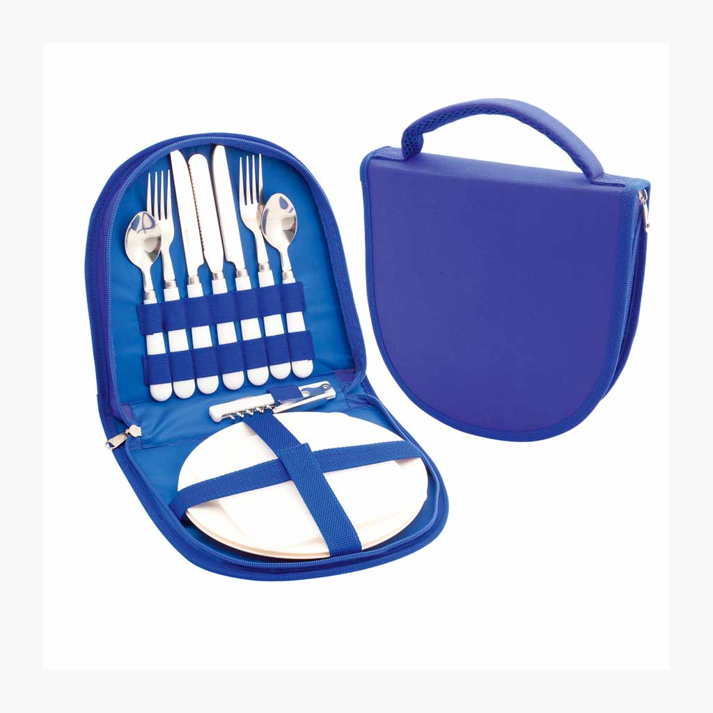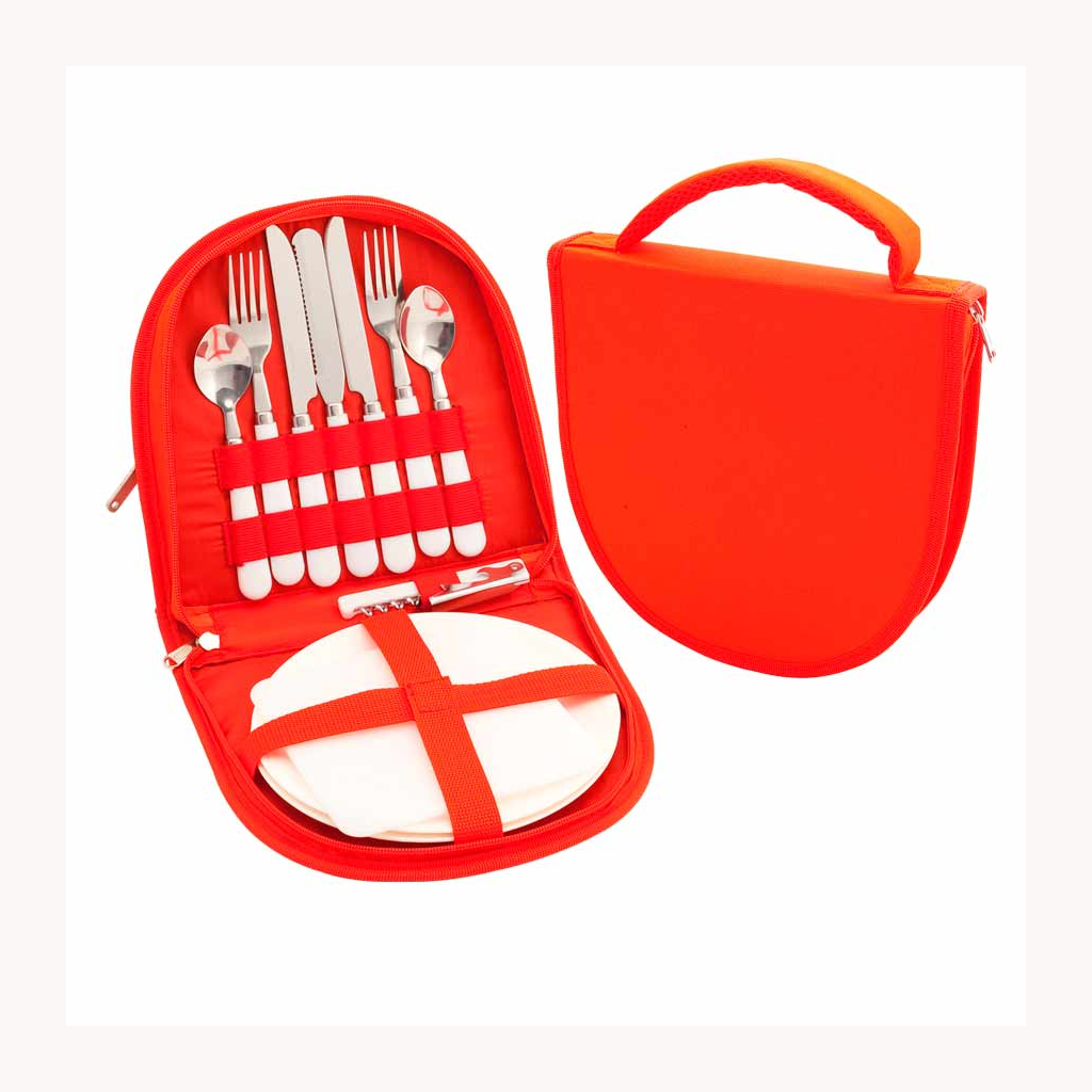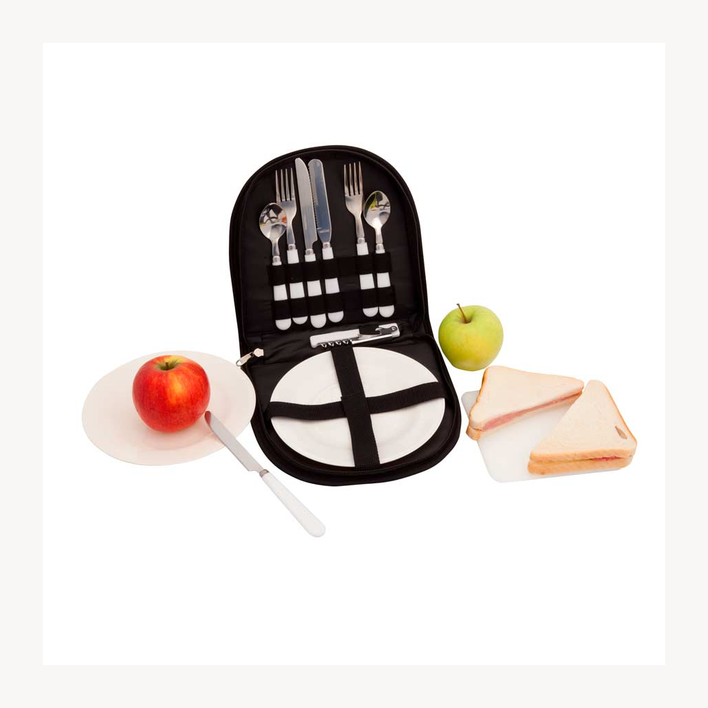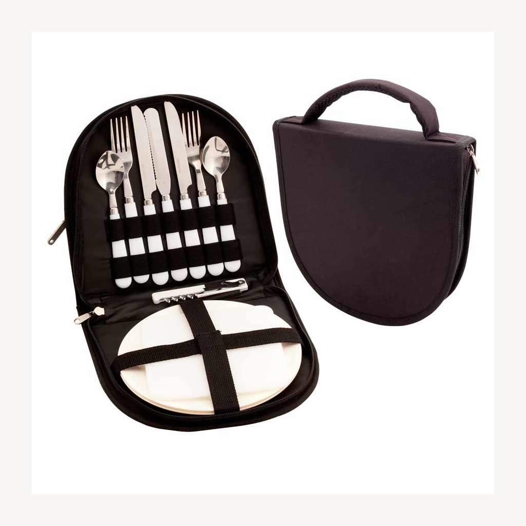 Set de Picnic para 2 personas en bolso raquelado con mango. Incluye set de cubiertos (cuchillos, tenedores y cucharas), 2 platos de melamina blanca, 1 tabla para cortar y 1 herramienta multiuso con destapador, descorchador y cortaplumas.