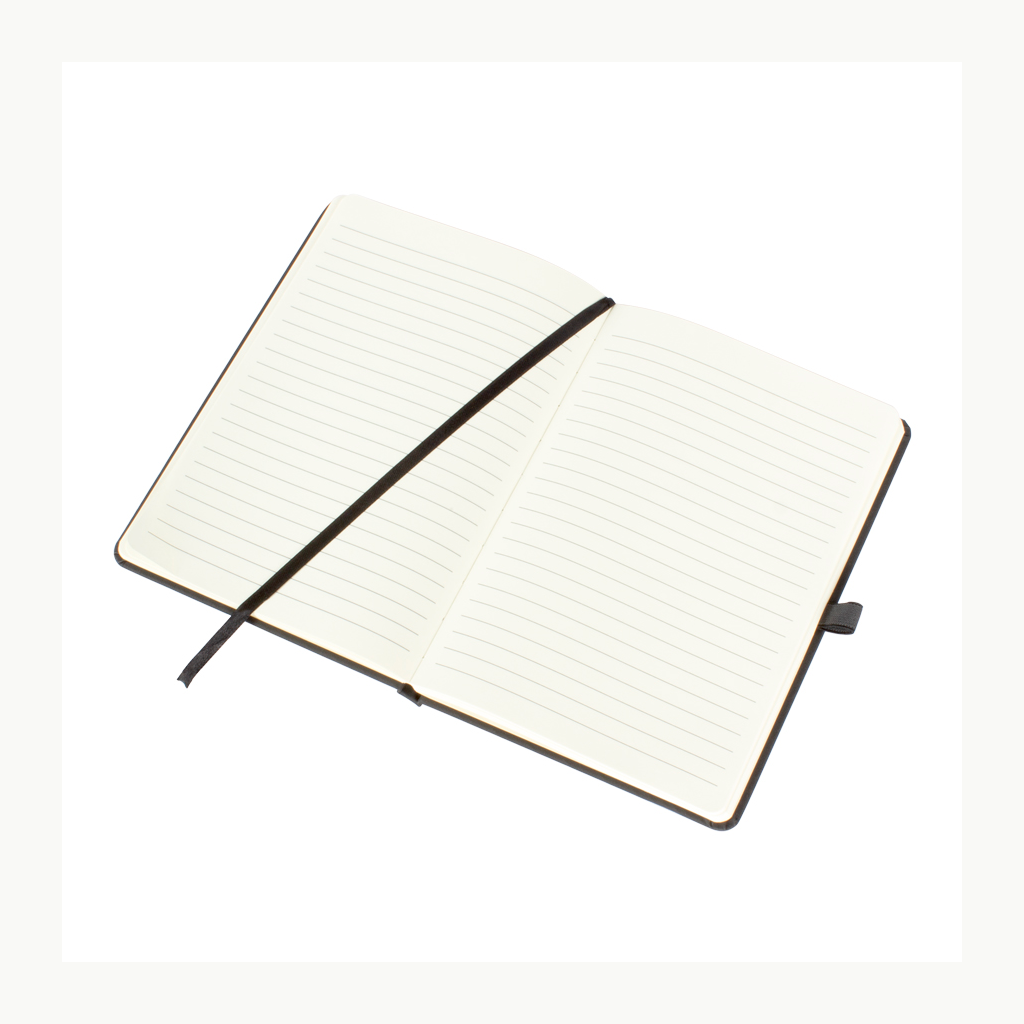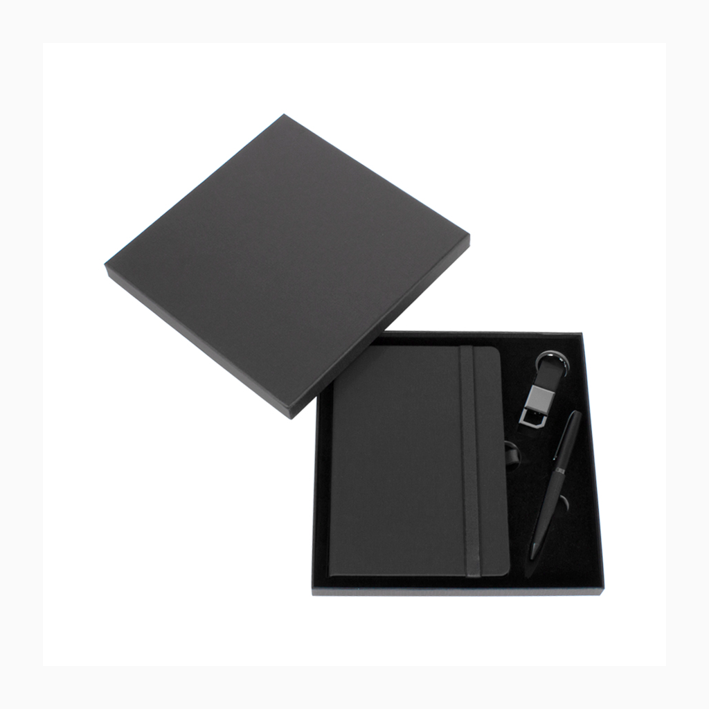 Set Ejecutivo de Escritorio. Incluye cuaderno negro tapa dura texturada, tamaño A5 de 14.6 x 21 . 1.5 cm con 96 hojas lineadas amarillo claro, cierre elasticado negro, llavero ejecutivo con mosquetón, anillo y cuerpo metálico cromado y cinta de PU texturado y finalmente Bolígrafo ejecutivo metálico, cuerpo negro opaco y escritura azul. Presentación en elegante caja con tapa, de cartón piedra texturado negro, con interior cama de terciopelo negro, con troquelados para cada elemento. Un gran regalo para nivel ejecutivo.