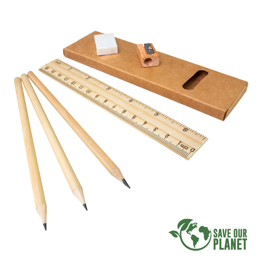 Set Escolar Ecológico. Incluye 3 lápices grafito negro largos de madera + 1 regla de 16.5 cm. de madera + 1 sacapuntas de madera + 1 goma de borrar. Presentación en Estuche ecológico de cartón reciclado.