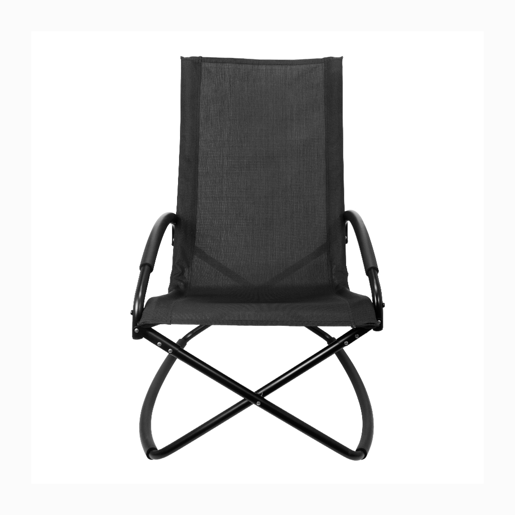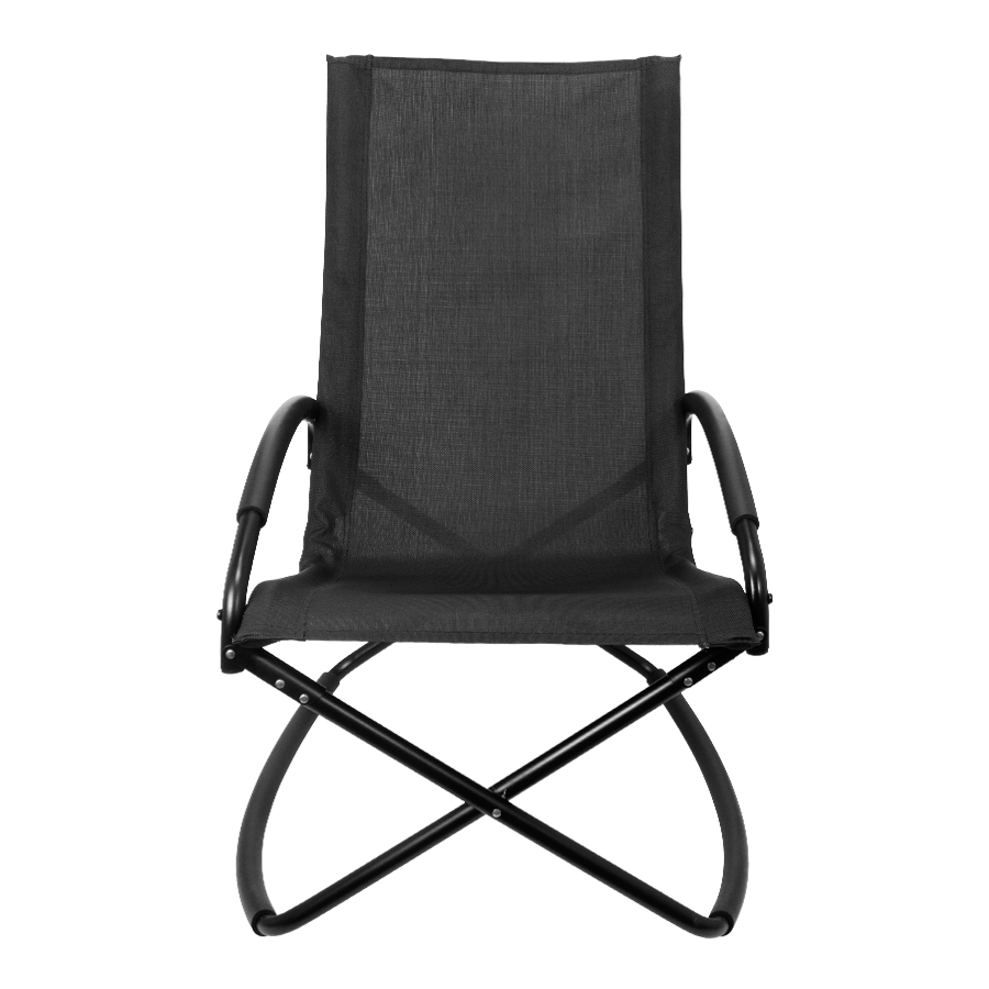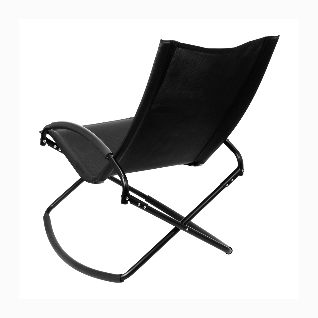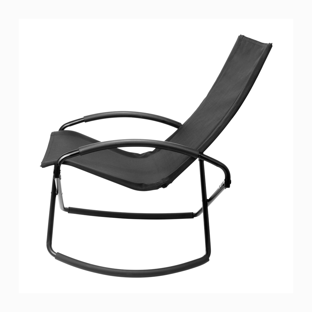 Silla mecedora negra con apoya-brazos, modelo «Ventus». Estructura de Aluminio color negro, asiento de Textilene negro. Descanso y relajo verdaderos.