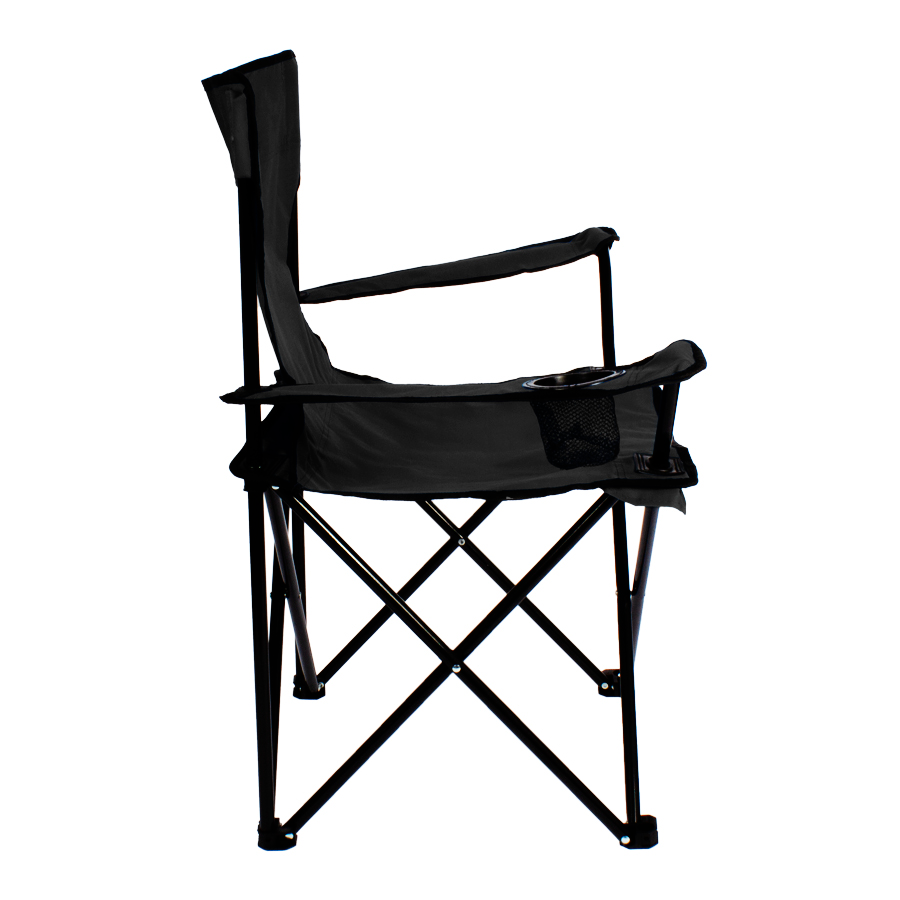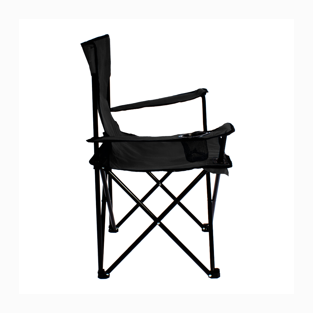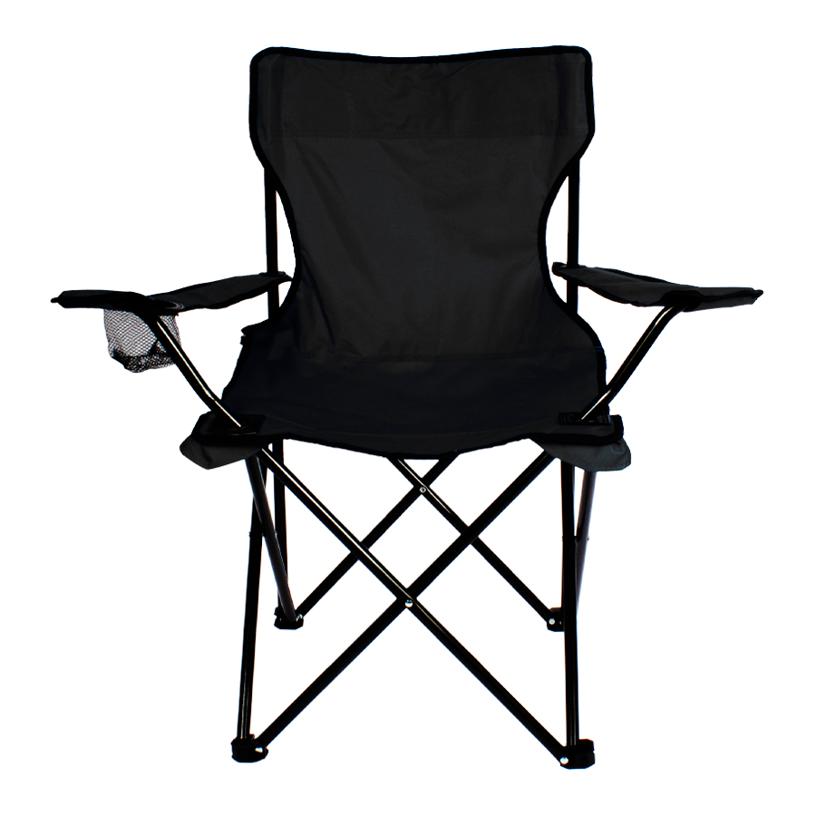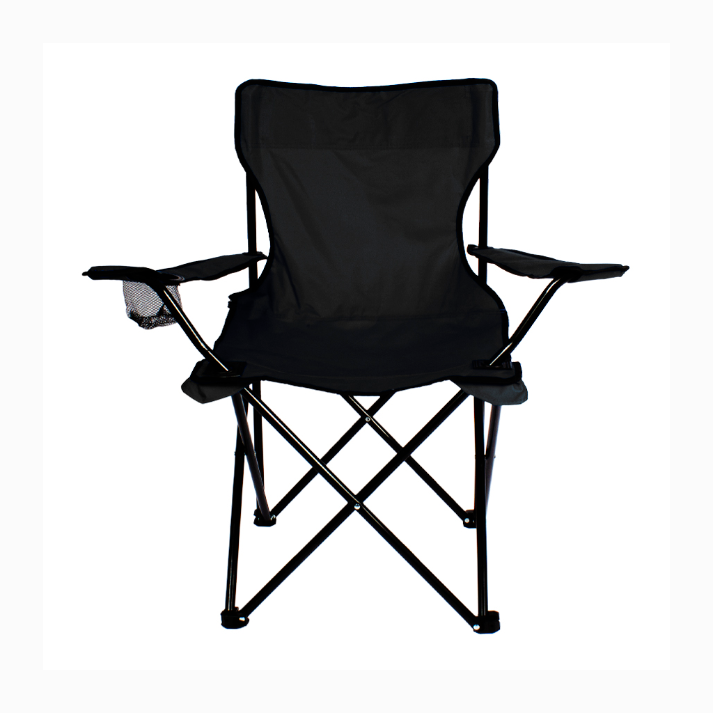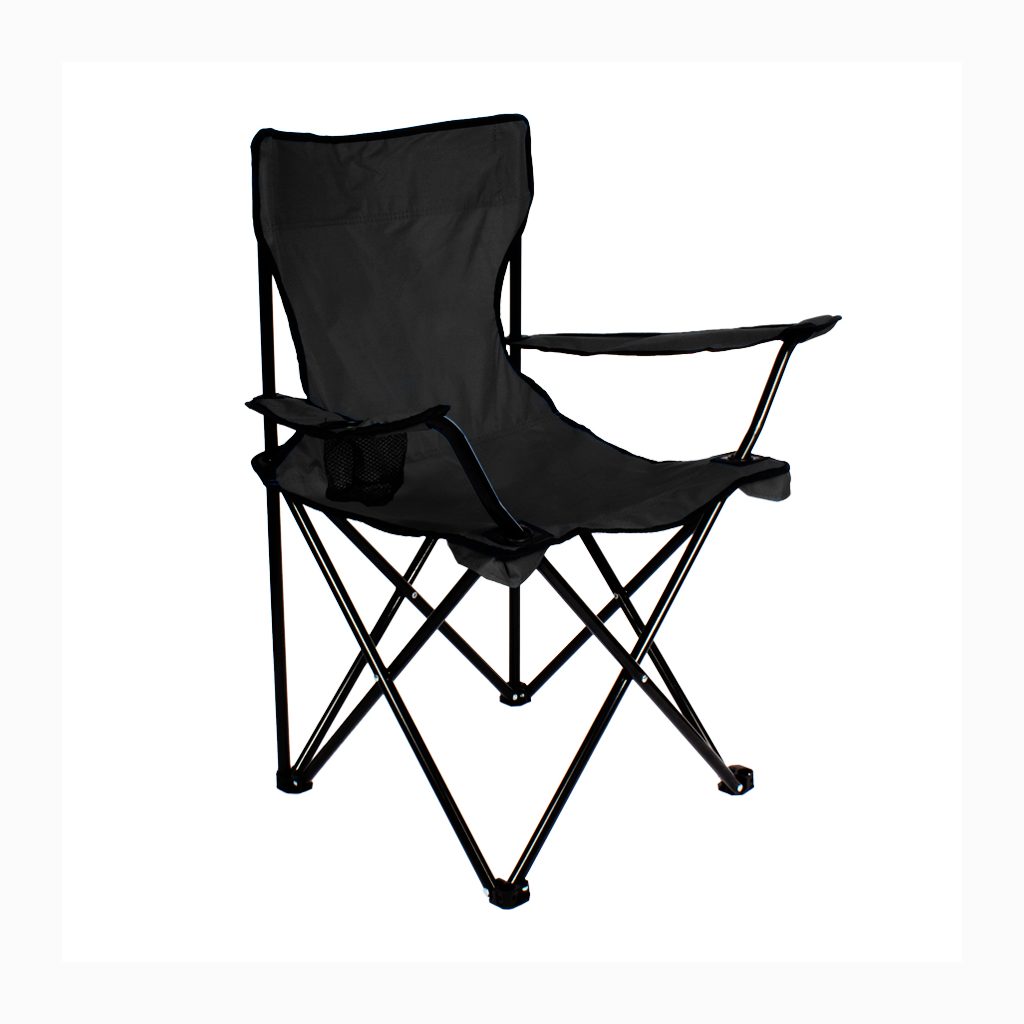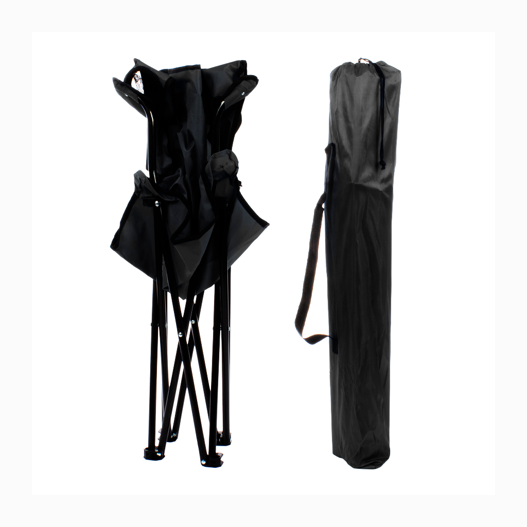 Silla de Camping en tela Oxford 600D raquelada y base plegable de Acero negro 16mm, con apoya-brazos y posa-vaso. Incluye bolso funda tubular de tela poliéster Ripstop 210D, con tanka y colgador. El regalo ideal para ir de camping o a la playa.