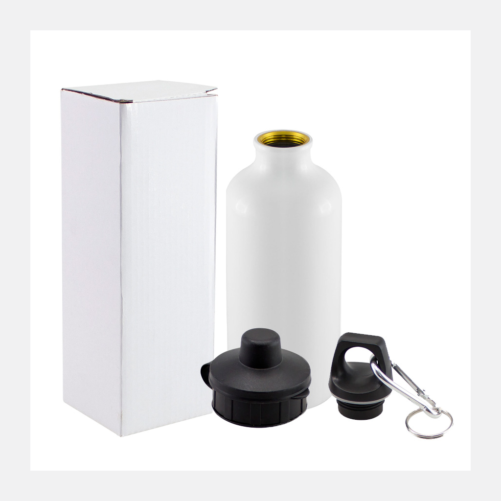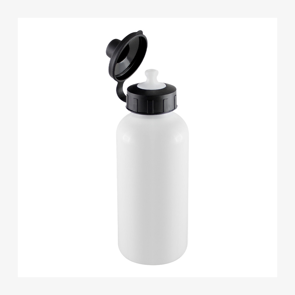 Sport Bottle (Botella deportiva) de 550cc. con cuerpo blanco para Sublimación. Contiene 2 tapas negras para diferentes usos. Presentación en caja de Cartón Blanco.