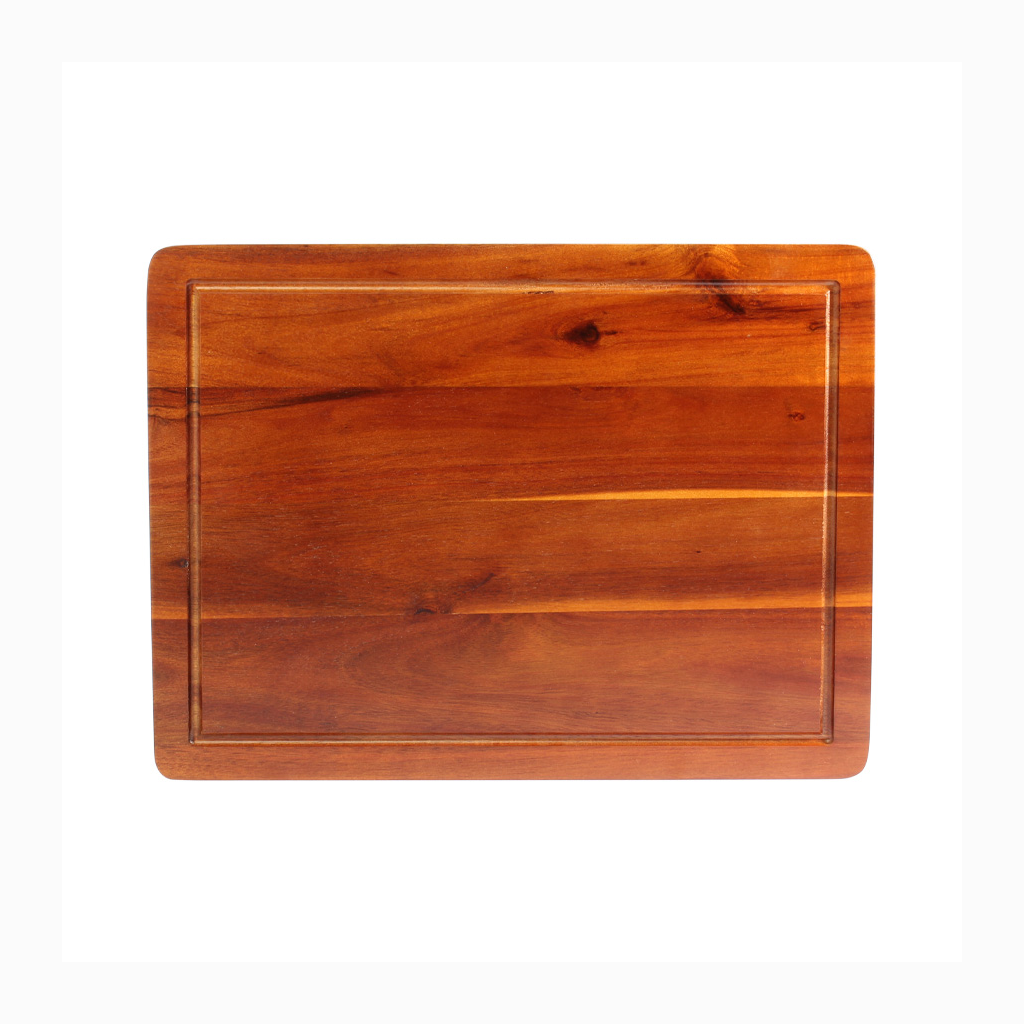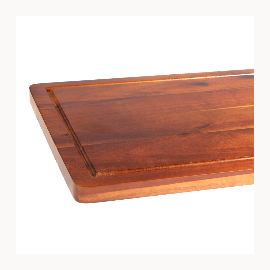 Amplia tabla de madera sólida de ACACIA, para cortar y servir carnes y pescados. Ideal también para verduras y/o selección de quesos. Madera trabajada y acabada en máquina, de forma 100% regular, con superficies, laterales y cantos lisos y suaves, para una mayor higiene y comodidad al momento de cortar y servir alimentos. La Acacia, junto con la Teca, es considerada la mejor, más dura y más resistente madera para utilizar para cortes de alimentos – Densidad aprox. 770kg/m3. – Dureza 9.5 (test de Monnin)