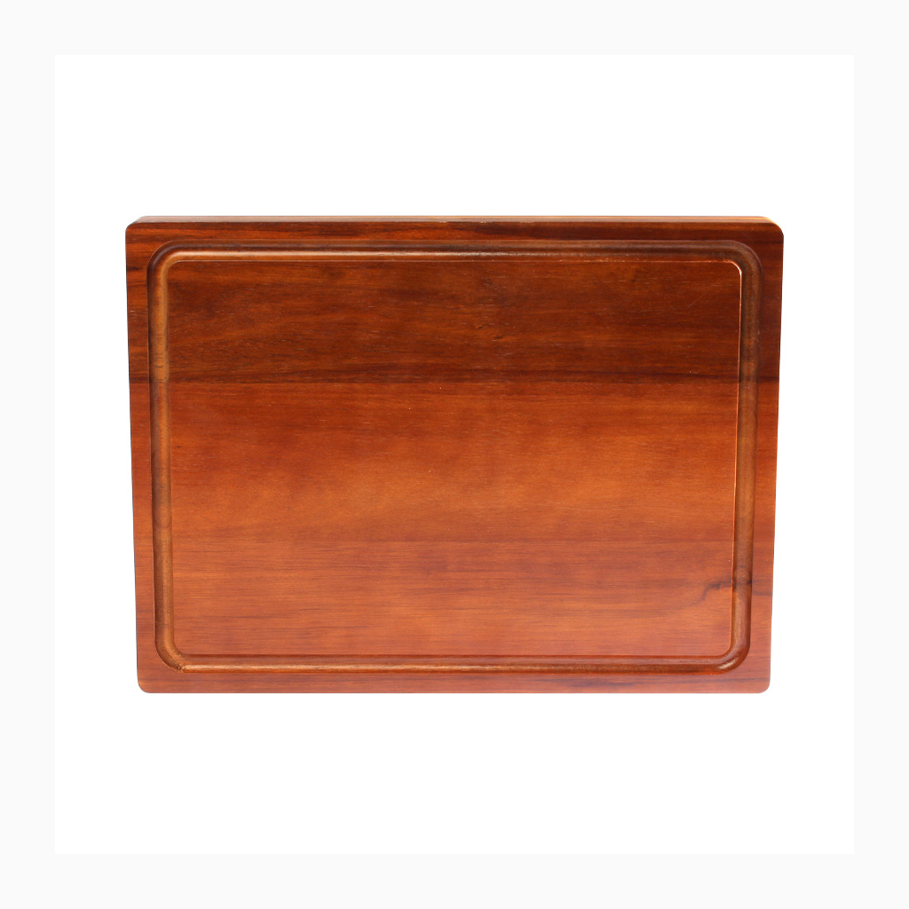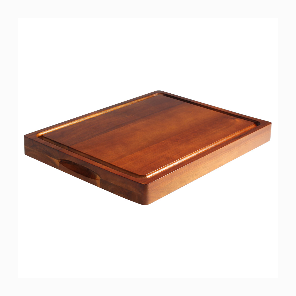 Gruesa tabla de madera sólida de ACACIA, para uso por ambos lados. Un lado con canaleta para cortar carnes y pescados, el otro lado con compartimento para poner verduras picadas, frutos secos o picoteo. Ideal para verduras y/o selección de quesos. Contiene ranuras laterales para tomar la tabla con mayor facilidad. Madera trabajada y acabada en máquina, de forma 100% regular, con superficies, laterales y cantos lisos y suaves, para una mayor higiene y comodidad al momento de cortar y servir alimentos. La Acacia, junto con la Teca, es considerada la mejor, más dura y más resistente madera para utilizar para cortes de alimentos – Densidad aprox. 770kg/m3. – Dureza 9.5 (test de Monnin).