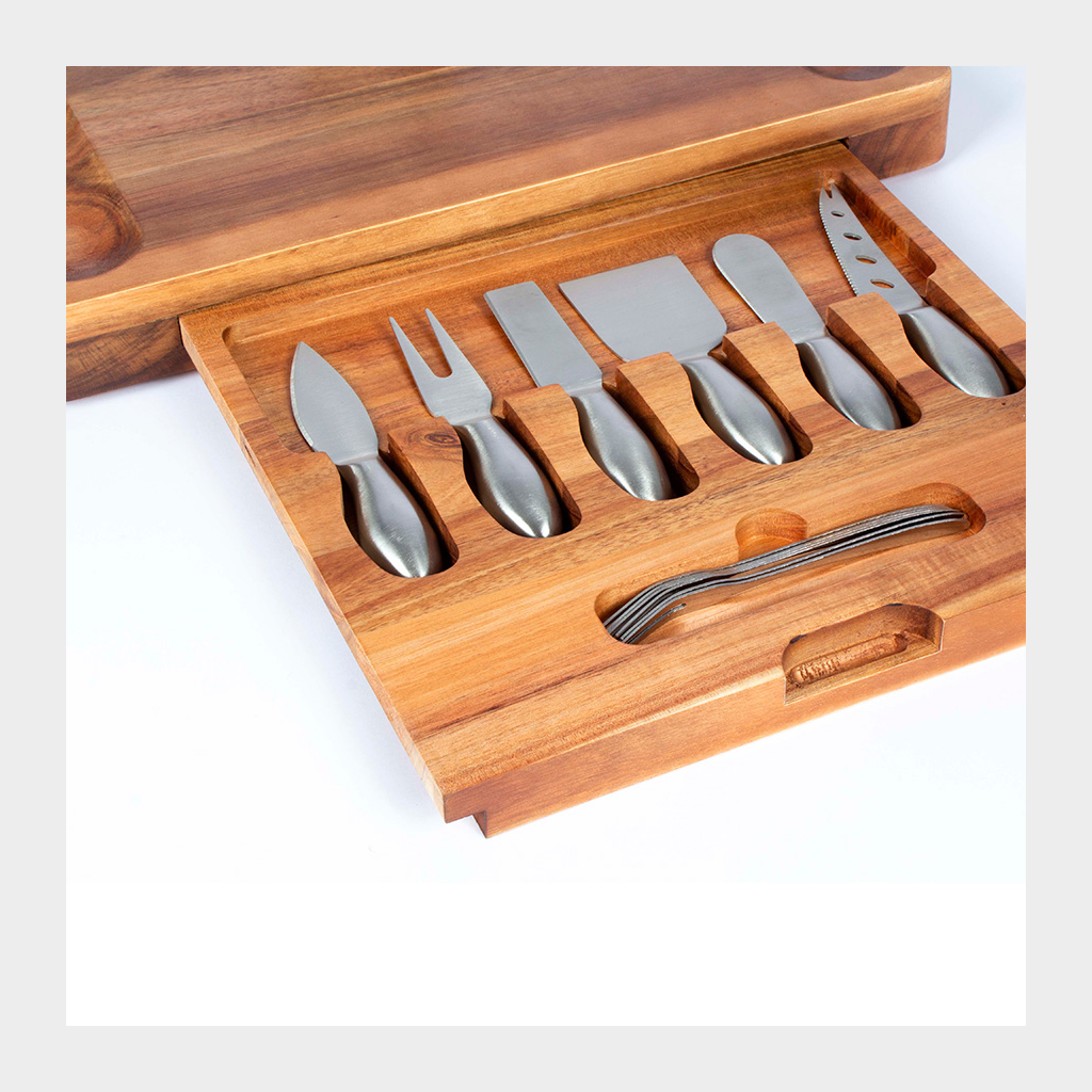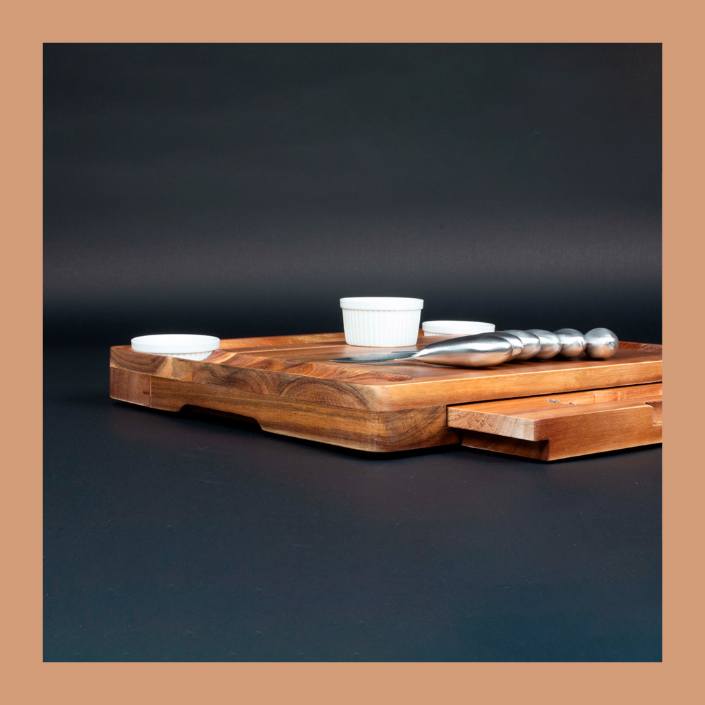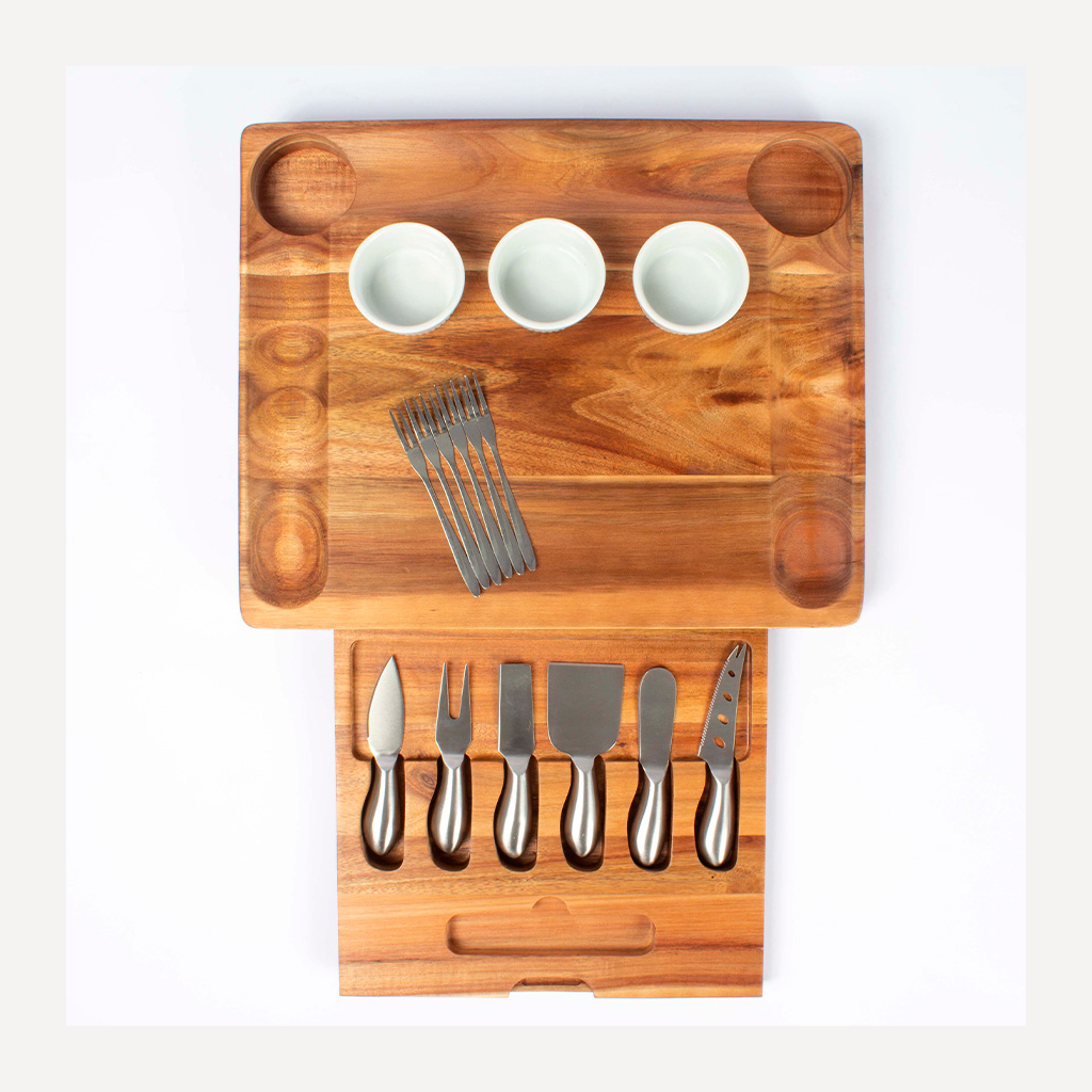 Espectacular tabla de madera sólida de ACACIA, con doble canal para picoteo, gran espacio central para quesos. Contiene 3 posillos de loza blanca para salsas + 6 cuchillos para cortar quesos + 6 tenedores pinchos de queso, de Acero inoxidable , en 2 compartimentos inferiores retráctiles. Madera trabajada y acabada en máquina, de forma 100% regular, con superficies y cantos lisos y suaves, para una mayor higiene y comodidad al momento de cortar y servir los quesos.