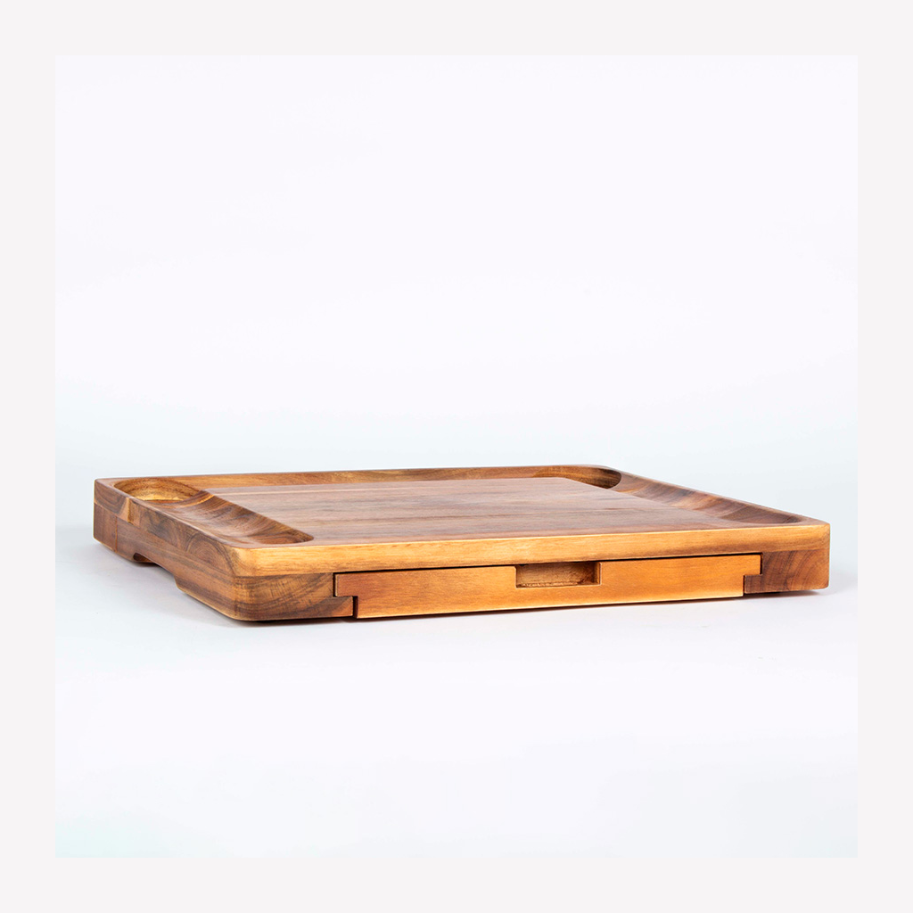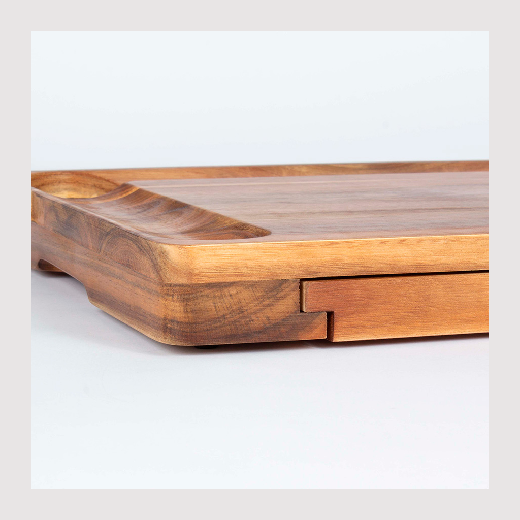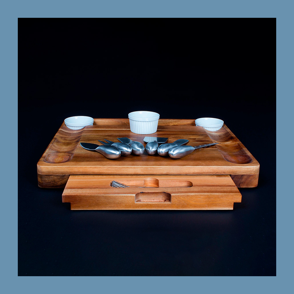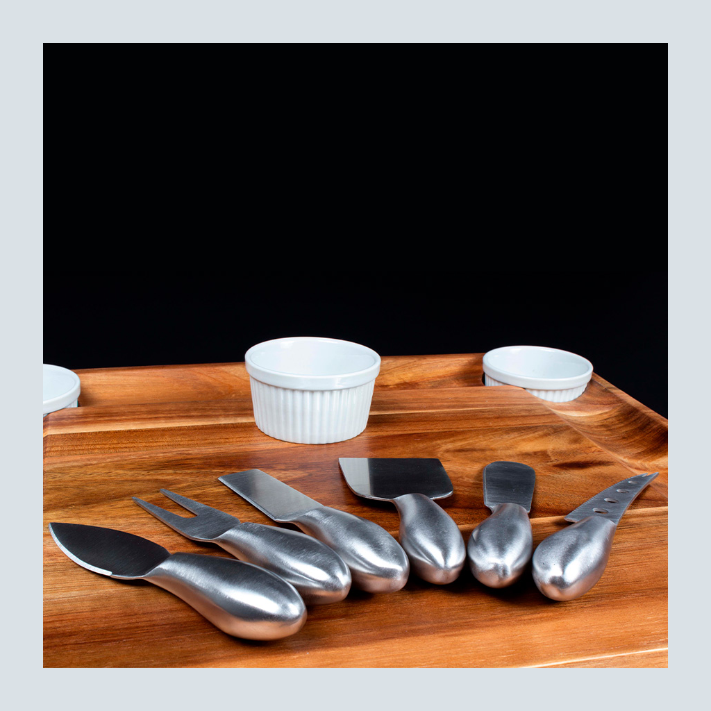 Espectacular tabla de madera sólida de ACACIA, con doble canal para picoteo, gran espacio central para quesos. Contiene 3 posillos de loza blanca para salsas + 6 cuchillos para cortar quesos + 6 tenedores pinchos de queso, de Acero inoxidable , en 2 compartimentos inferiores retráctiles. Madera trabajada y acabada en máquina, de forma 100% regular, con superficies y cantos lisos y suaves, para una mayor higiene y comodidad al momento de cortar y servir los quesos.