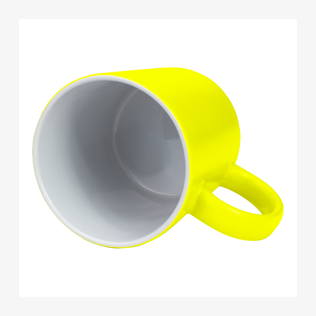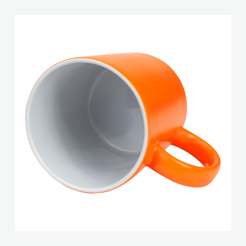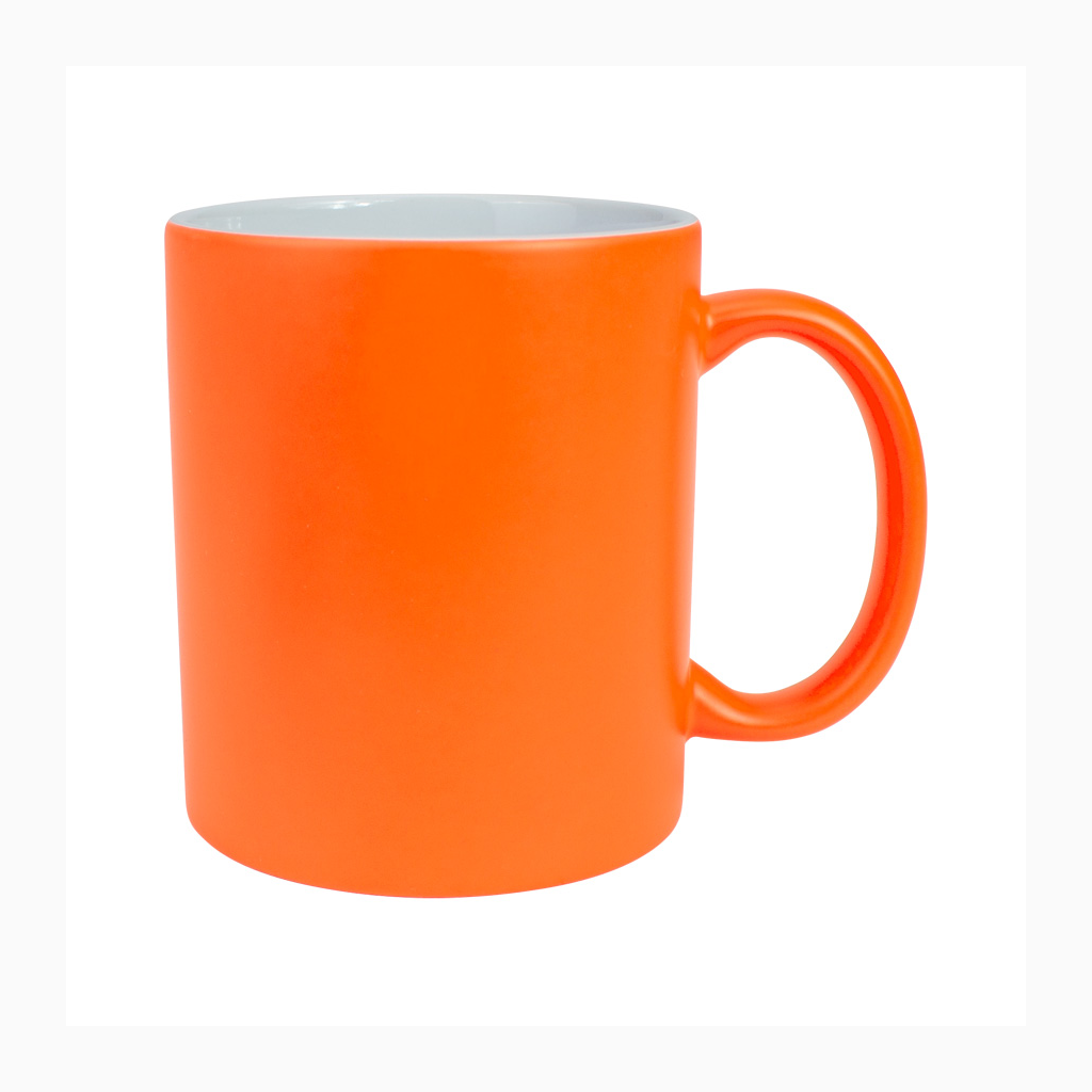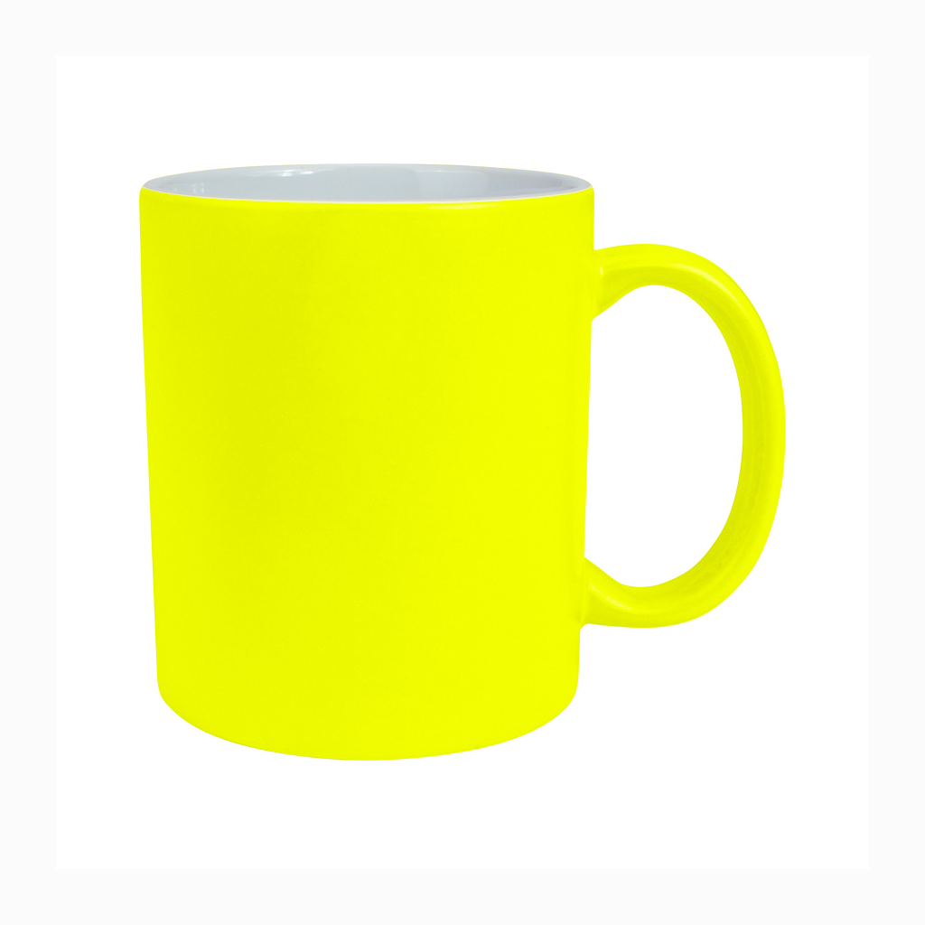 Tazón cerámico de 11oz (330 cc) con superficie exterior de color fluorescente, interior blanco, para Sublimación. Producto de calidad superior ORCA. Presentación en bolsa plástica translúcida + caja de cartón blanco.