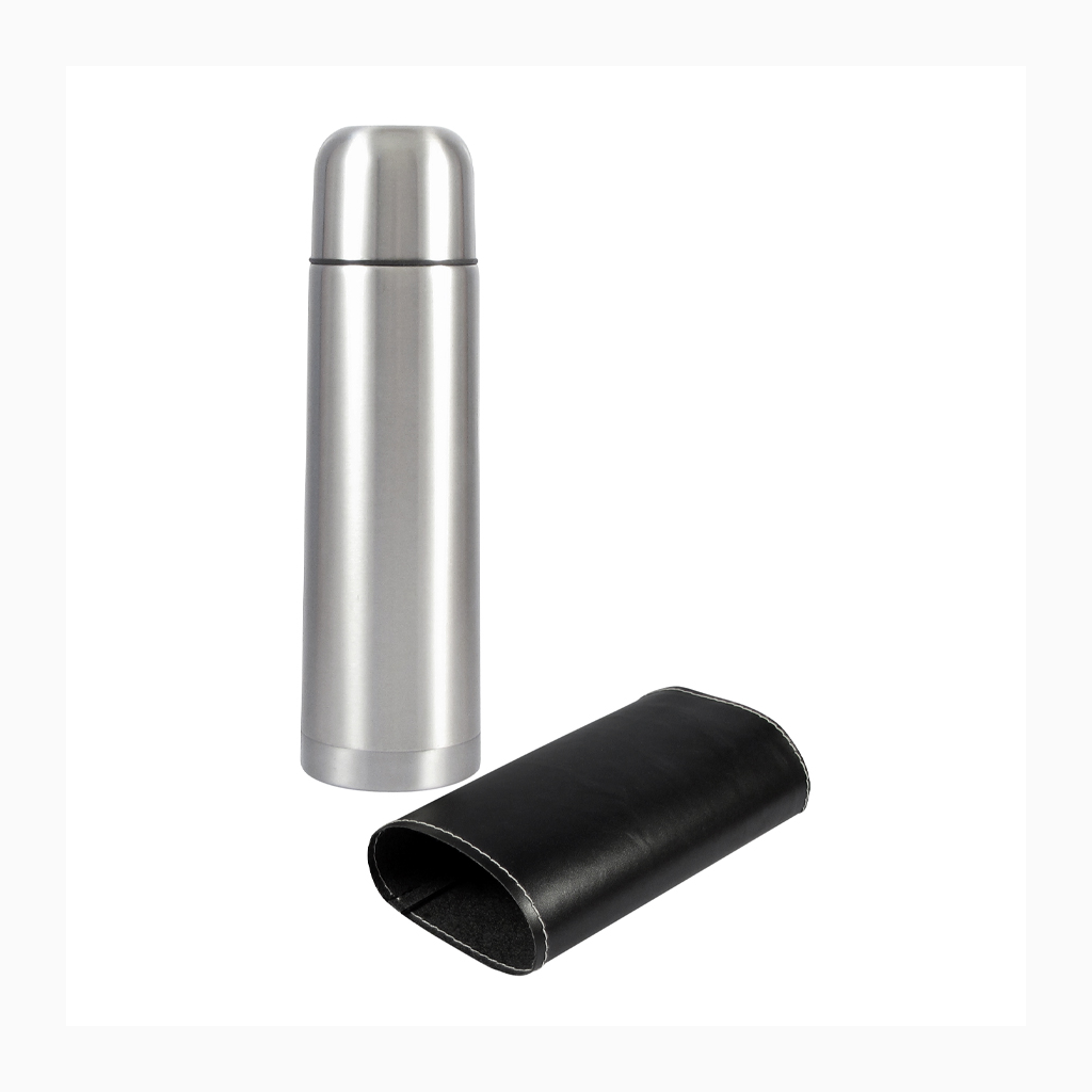 Termo de Acero Inoxidable de 1/2 Litro, con funda de PU negro (removible).
