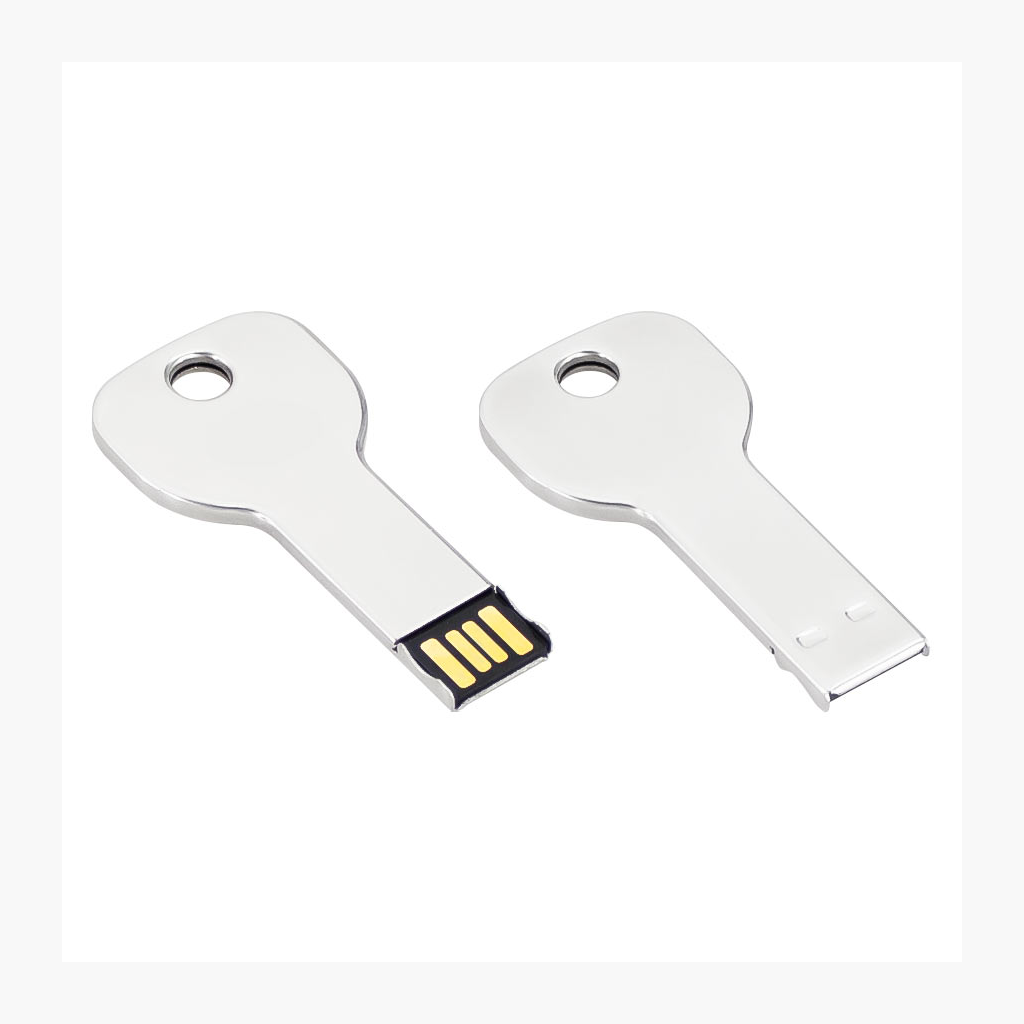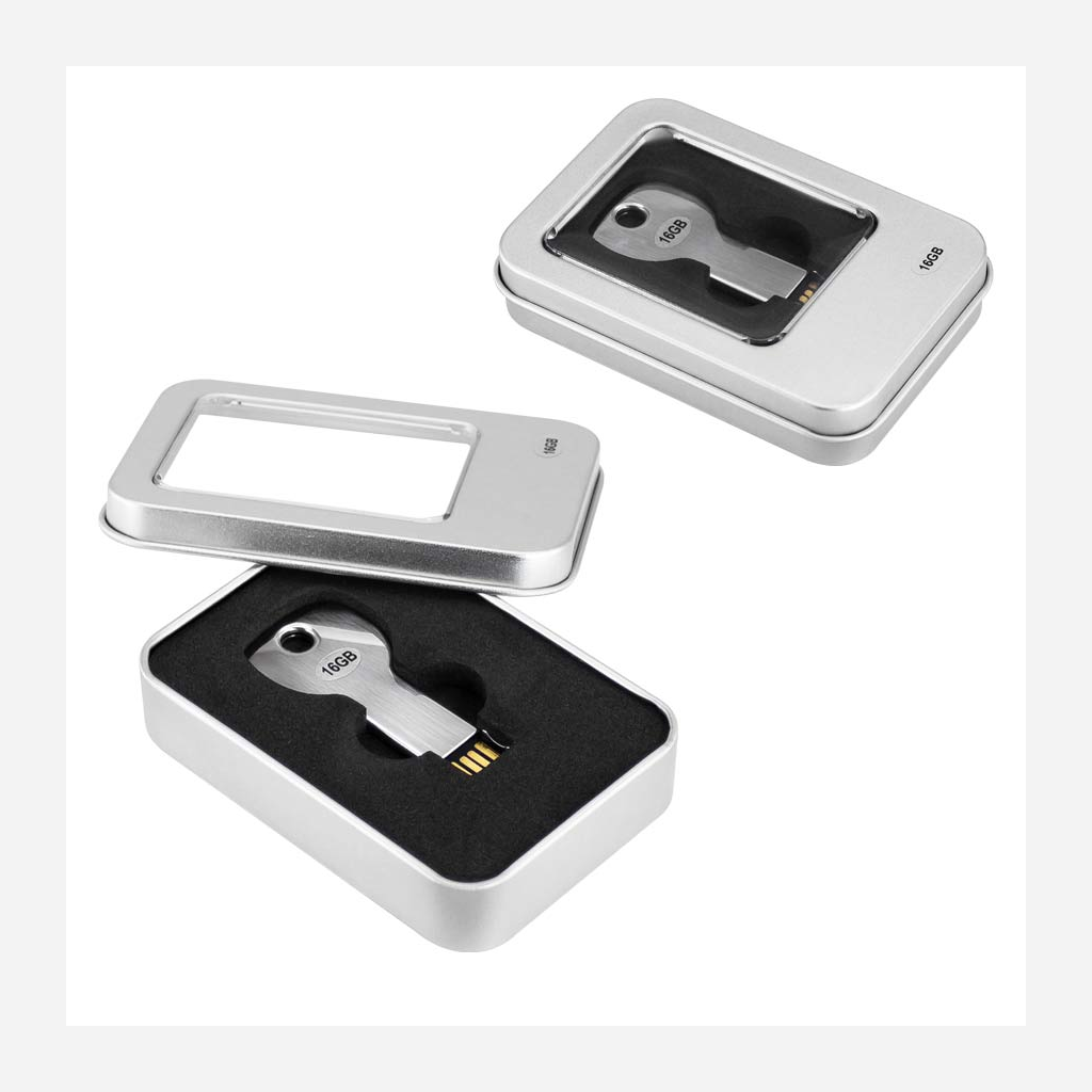 USB Pen Drive 2.0 con 16GB de capacidad, con forma de llave metálica. Ideal para llevar en tu llavero personal. Presentación en caja metálica pequeña con ventana.