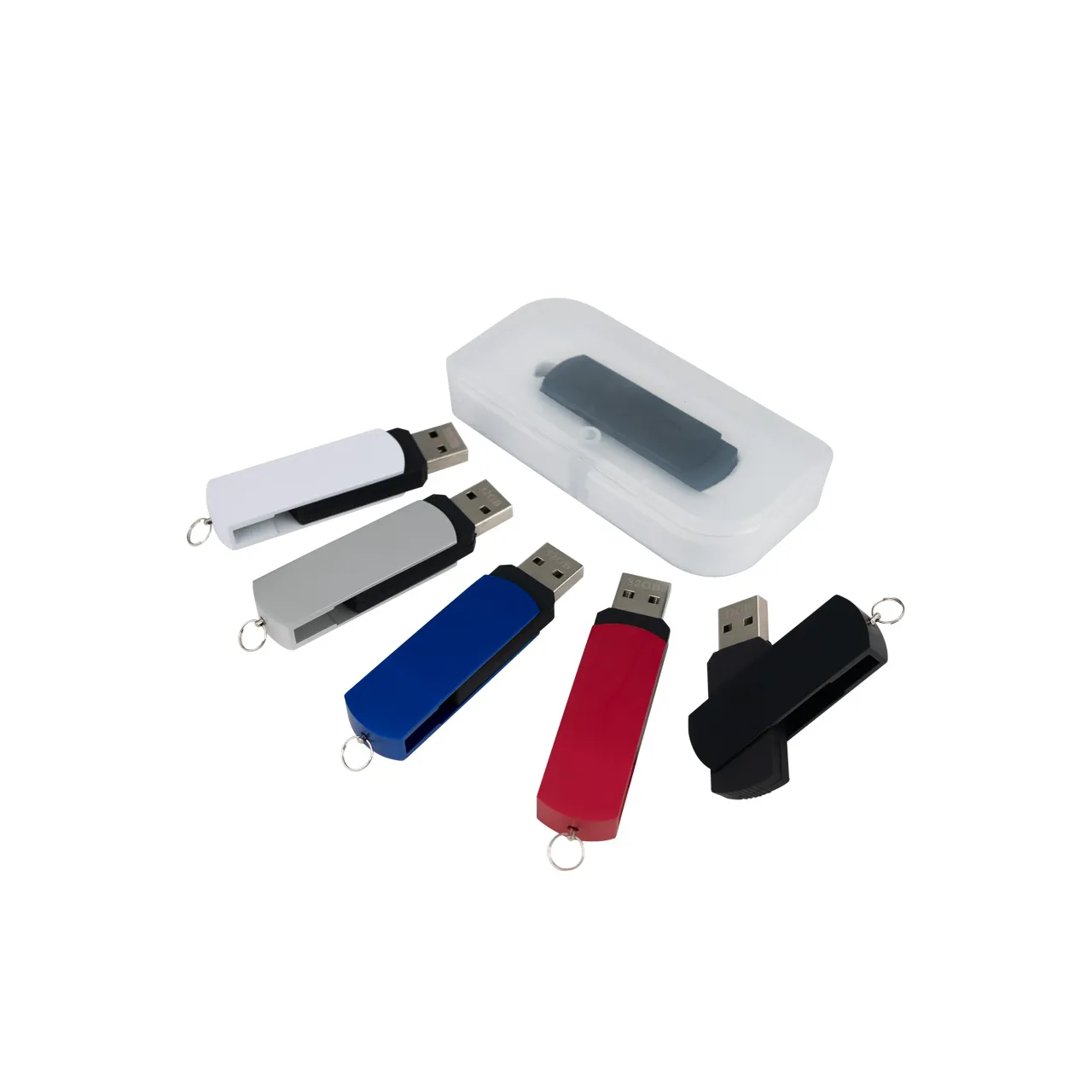 USB Pendrive 2.0 con 32GB de memoria, con cuerpo de silicona negra y carcasa metálica de giro de color, removible. Presentación en estuche de PVC translúcido.