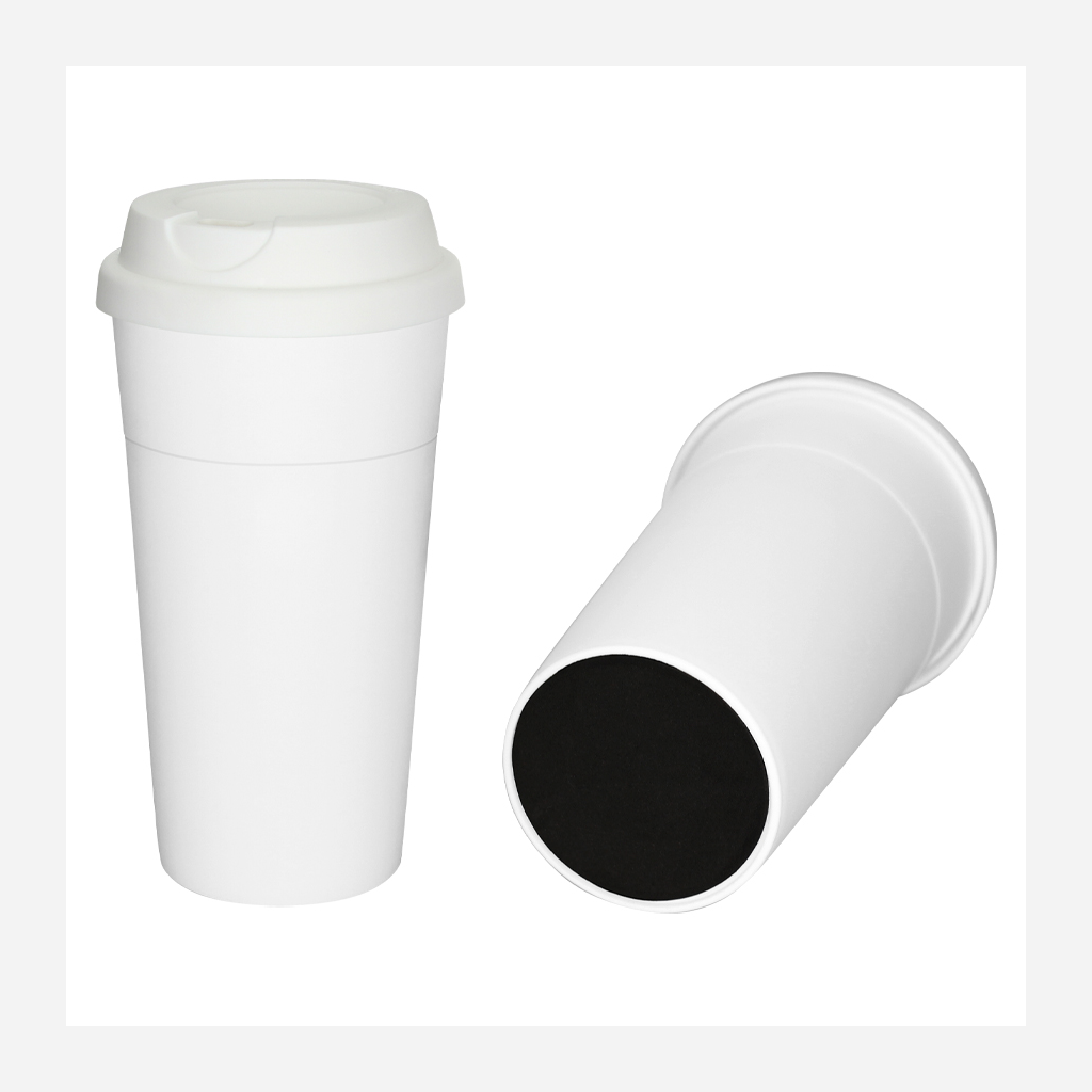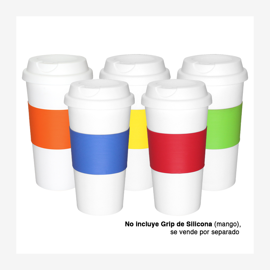 Vaso grande de 480ml. modelo «Cloud» de plástico blanco, con tapa rosca de silicona blanca. Presentación en caja de cartón blanco.